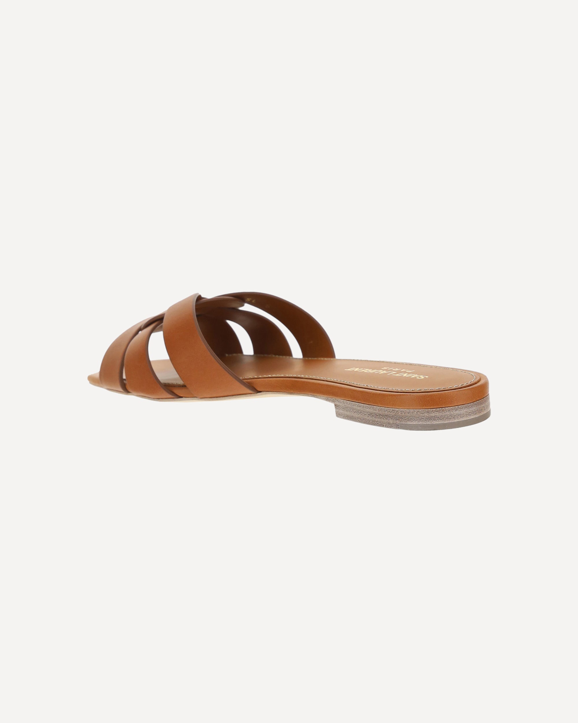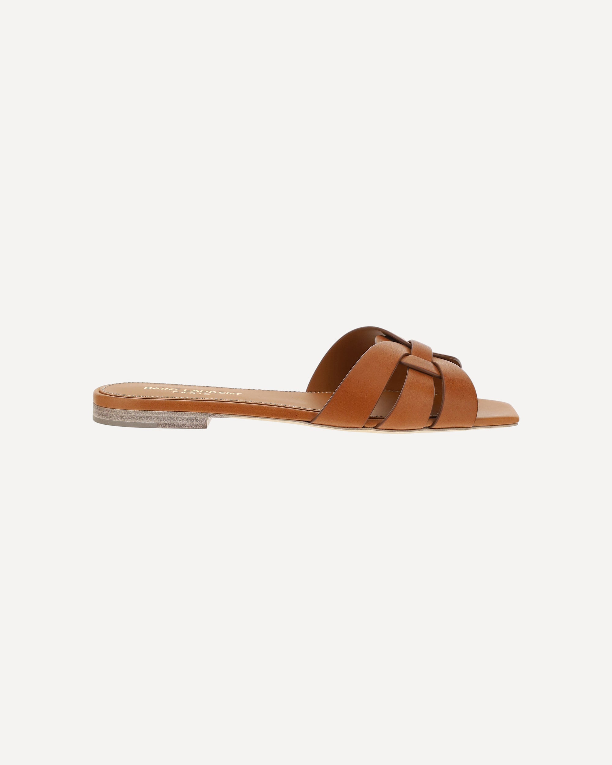 Calfskin Sandals by Saint Laurent, open square toe, braided design at front, press-studded logo insole, slight leather block heel.