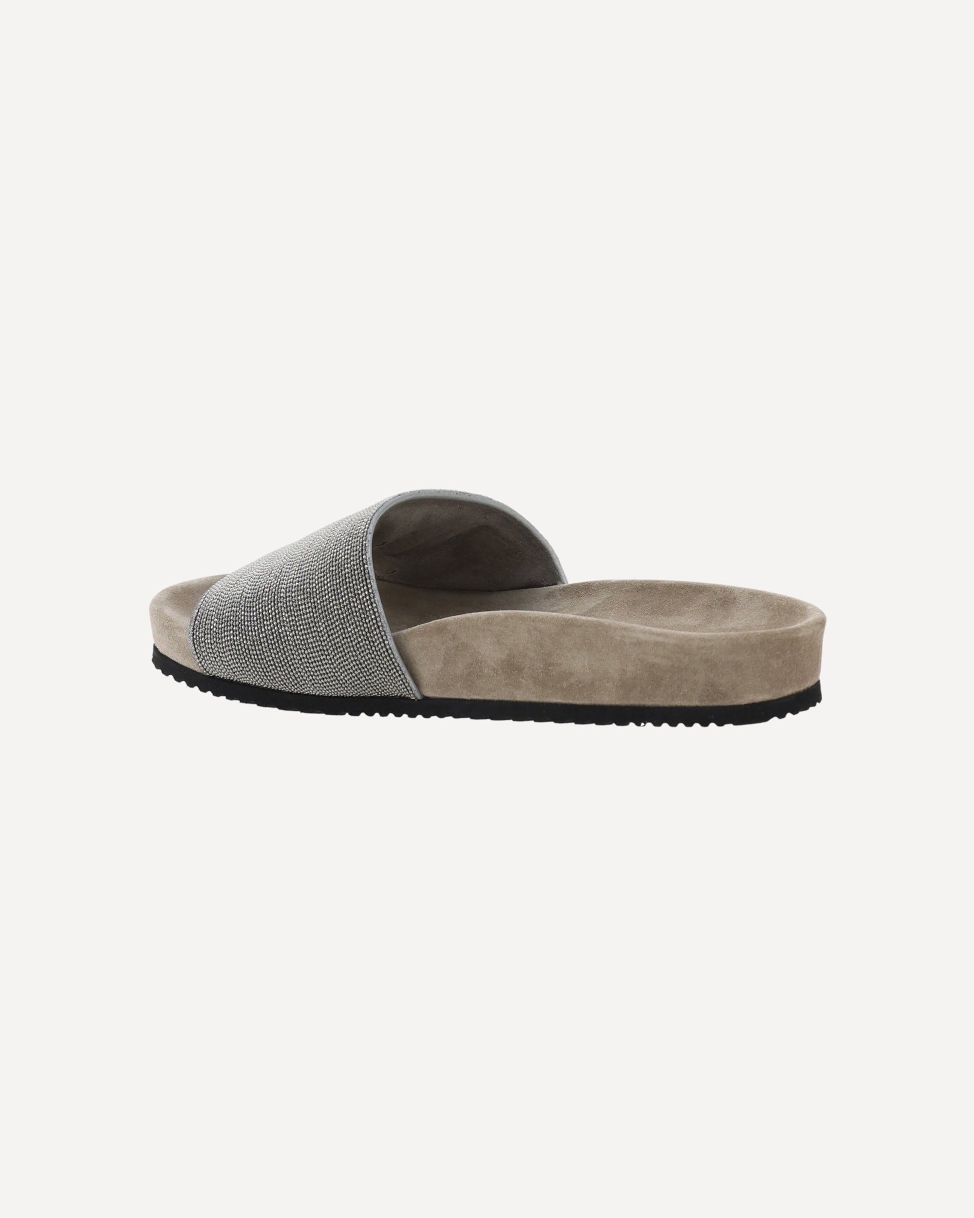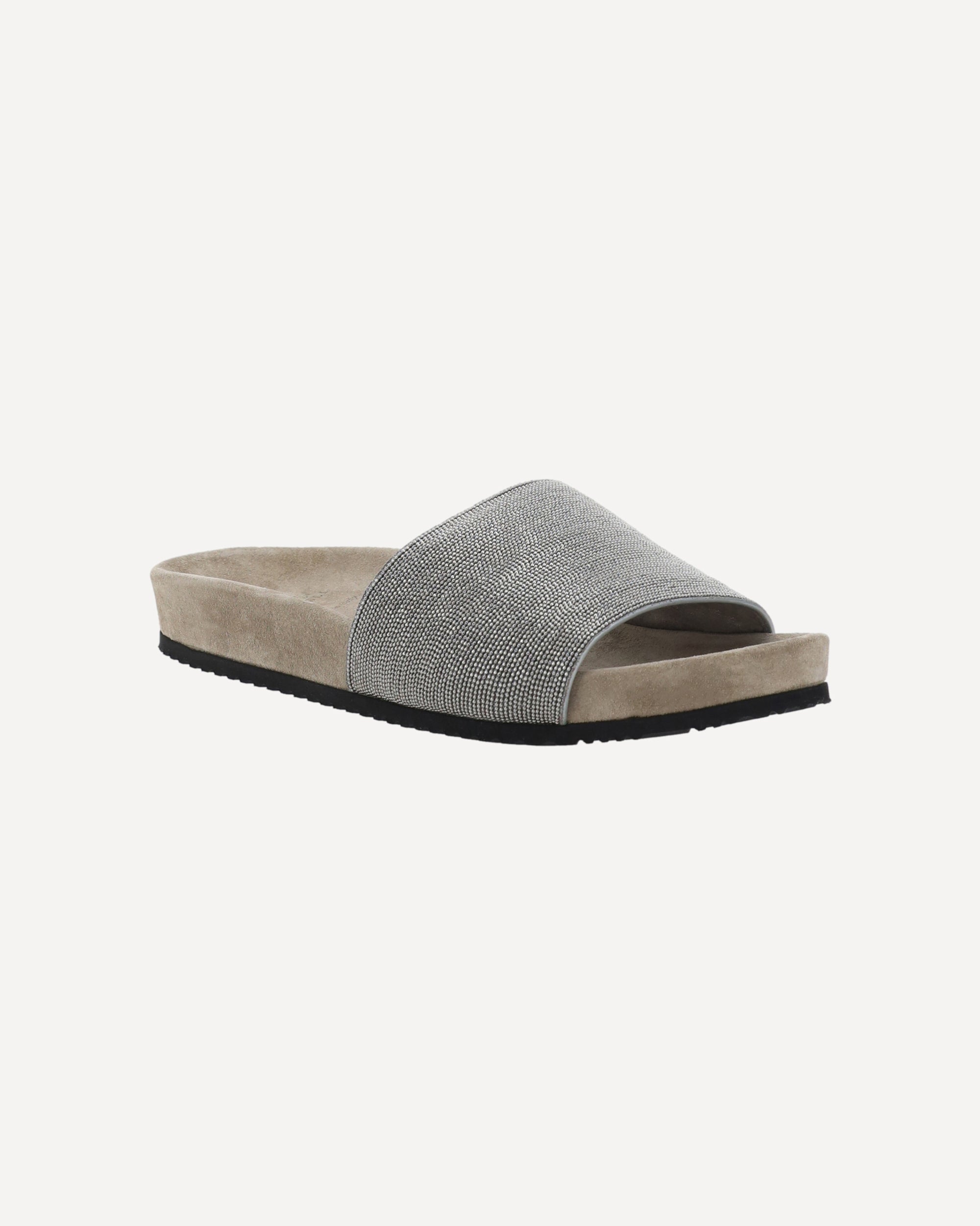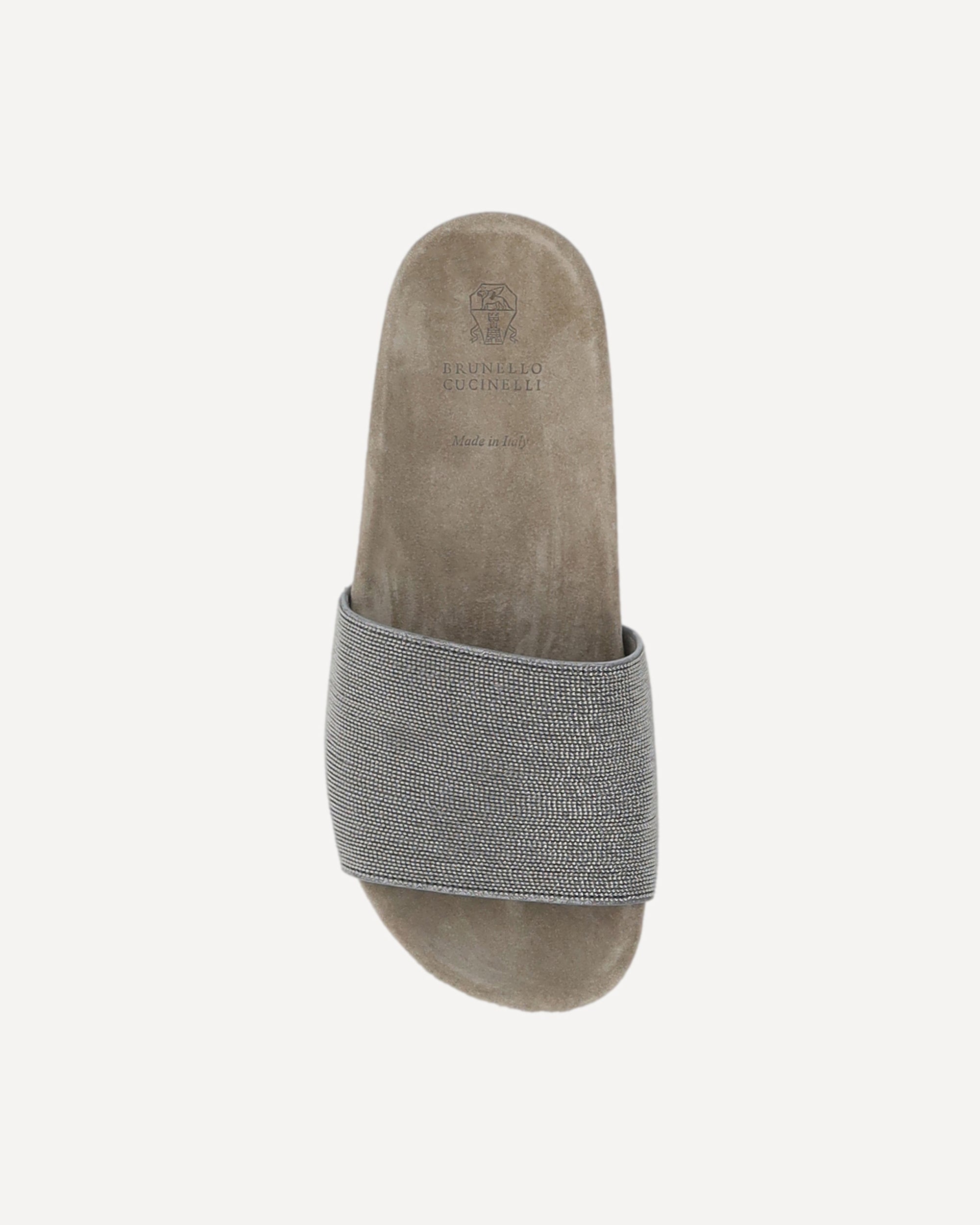 Sandals by Brunello Cucinelli, flat sole, round toe, wide band on the front covered with the brand's iconic jewels, suede sole design, press-stamped logo insole.