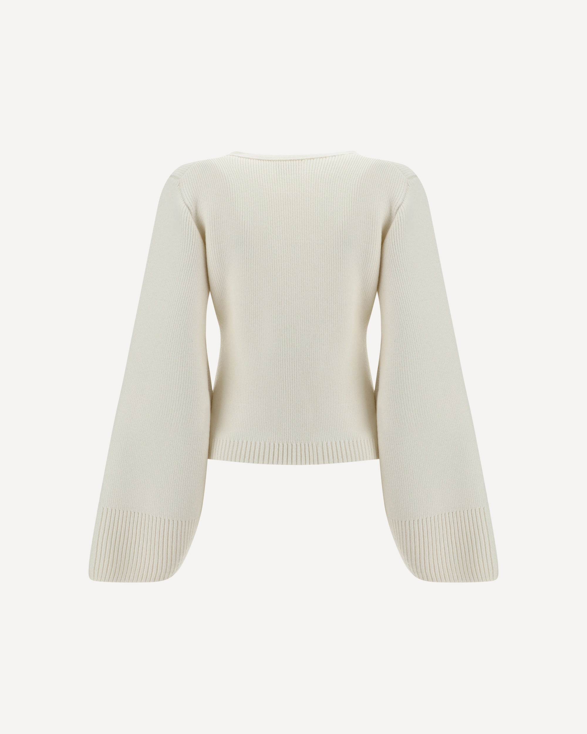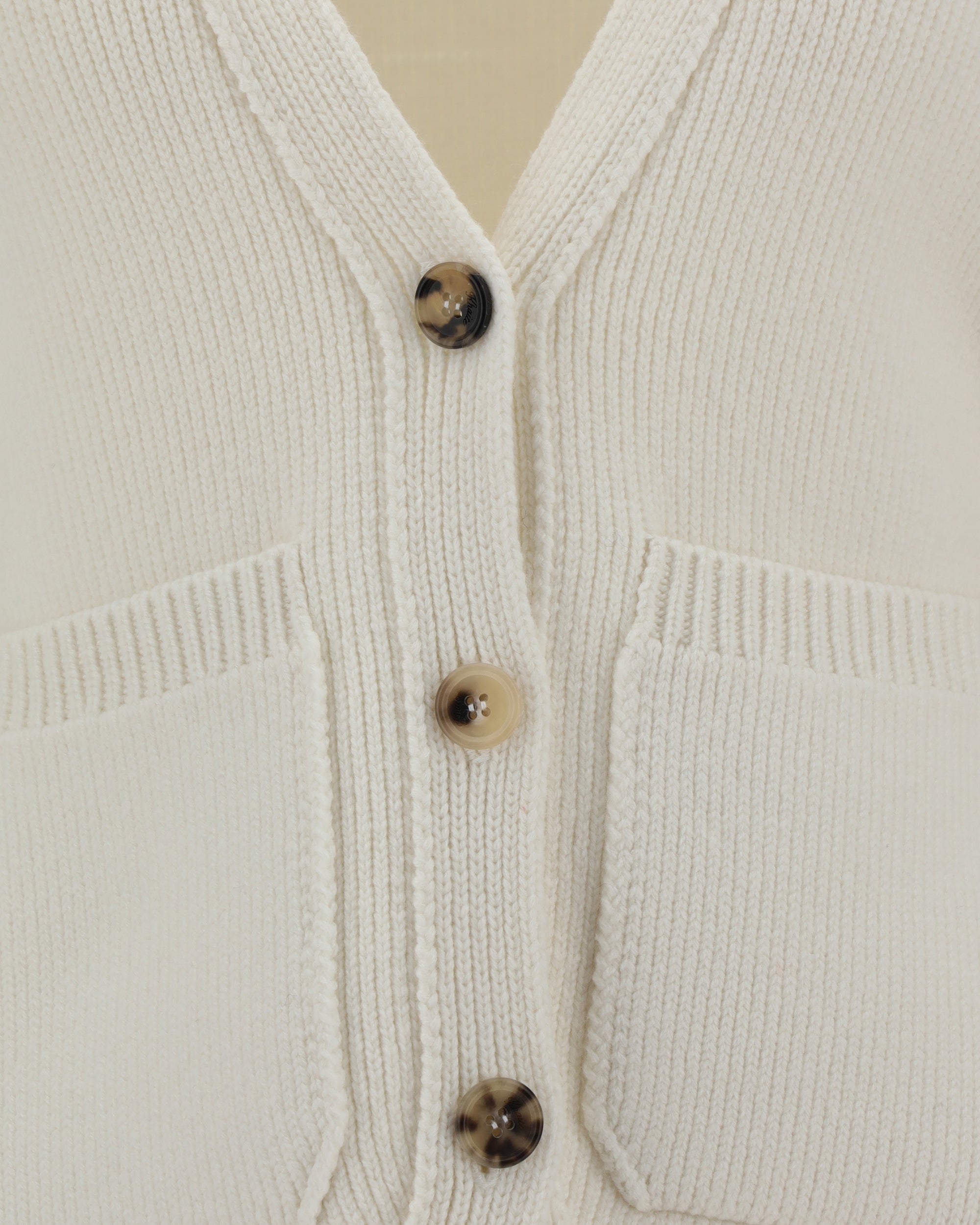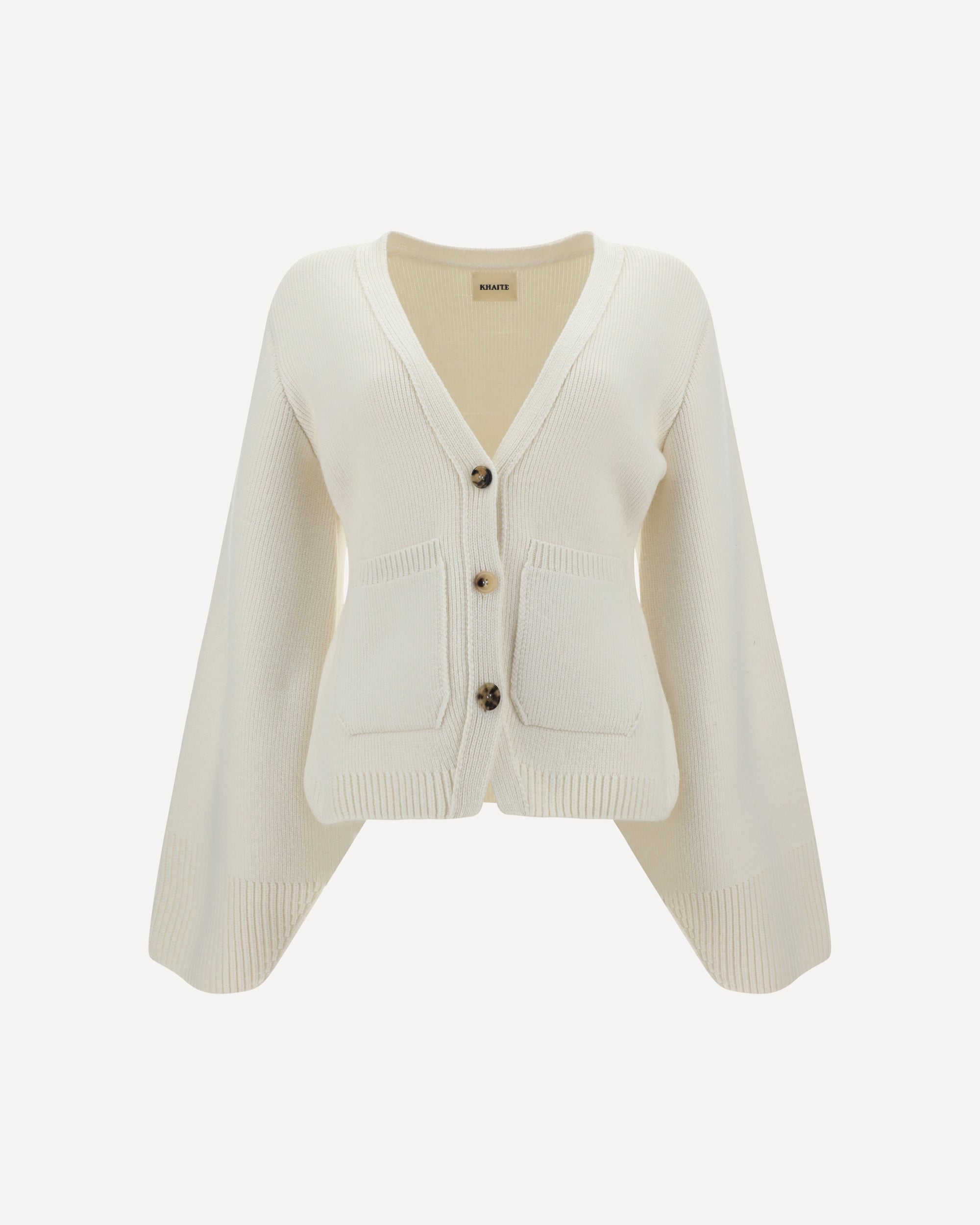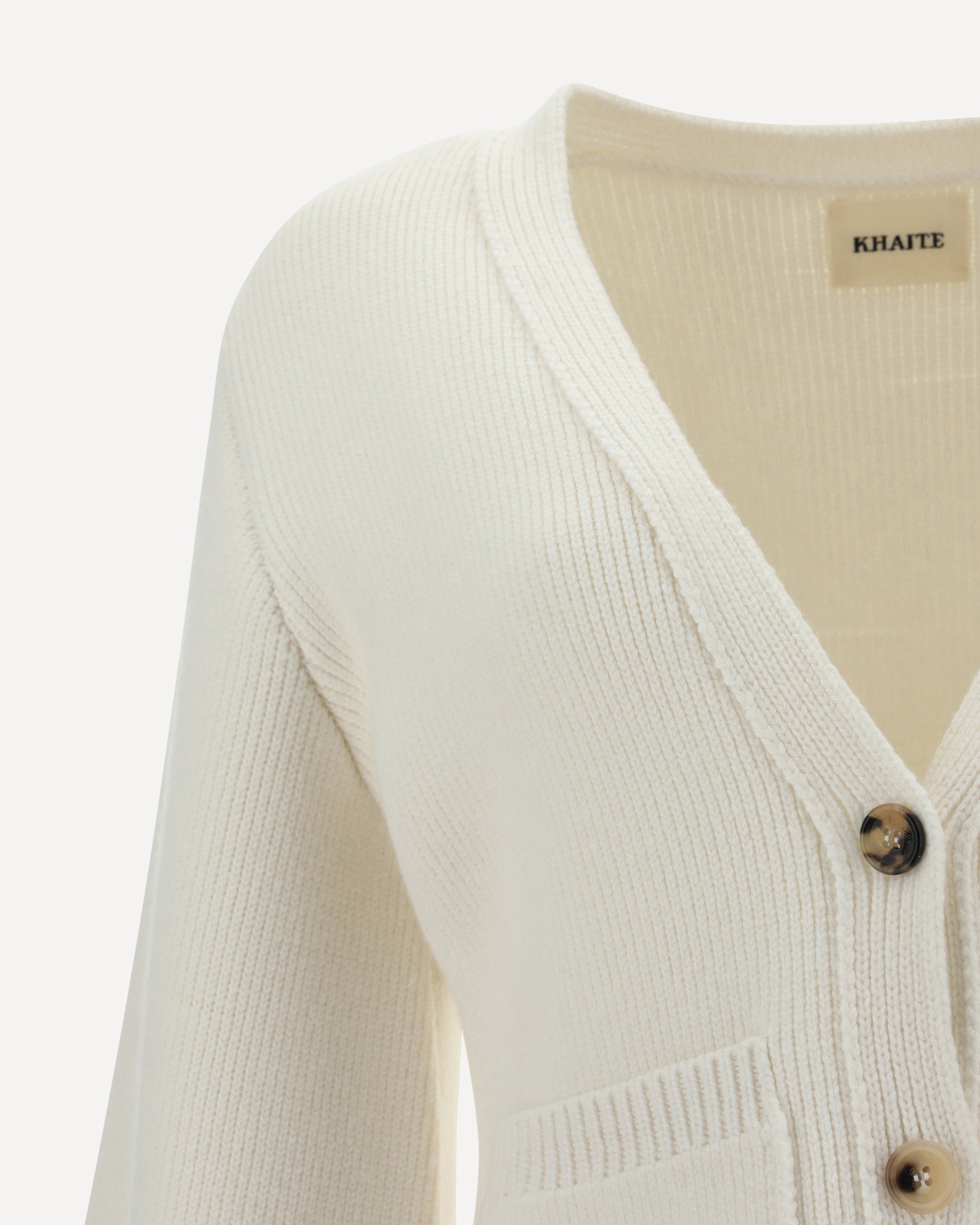 Cashmere Scarlet Cardigan by Khaite, button closure, v neck line, two front pockets, ribbed cuffs and bottom hem, long and wide sleeves.