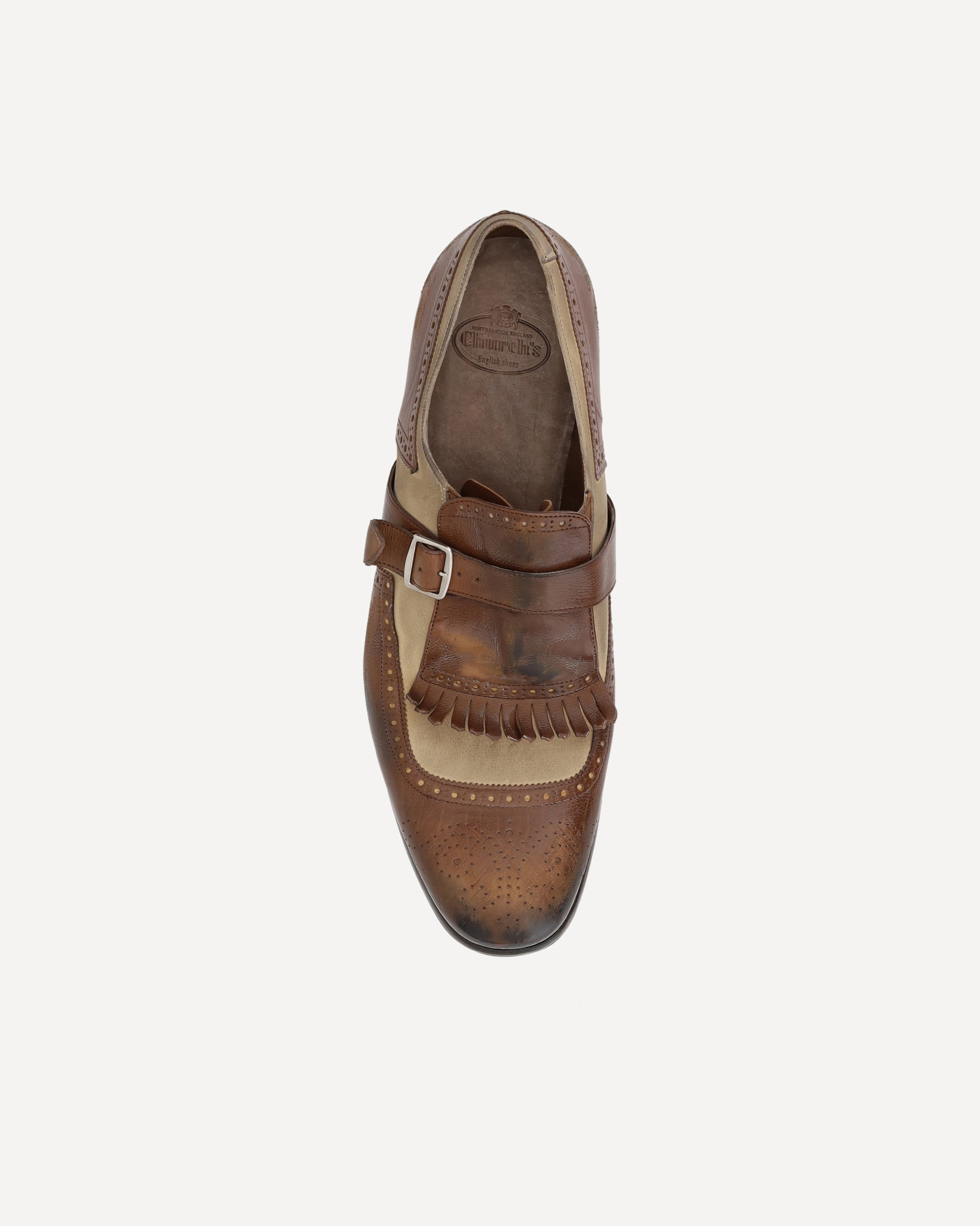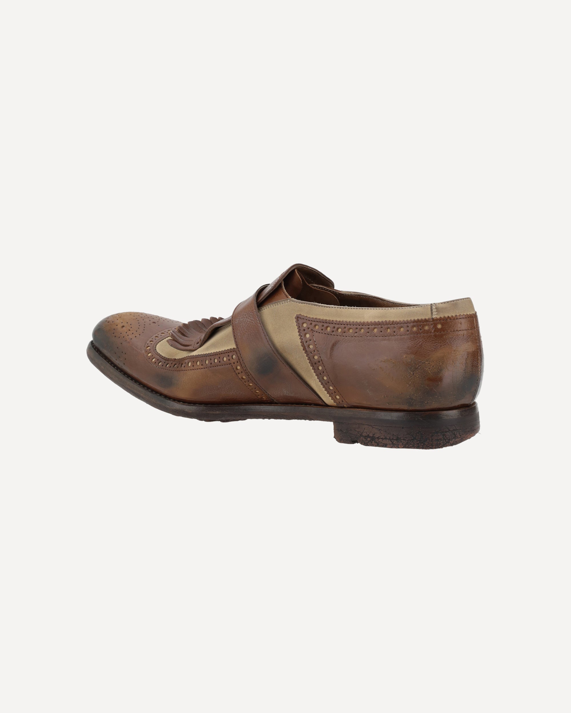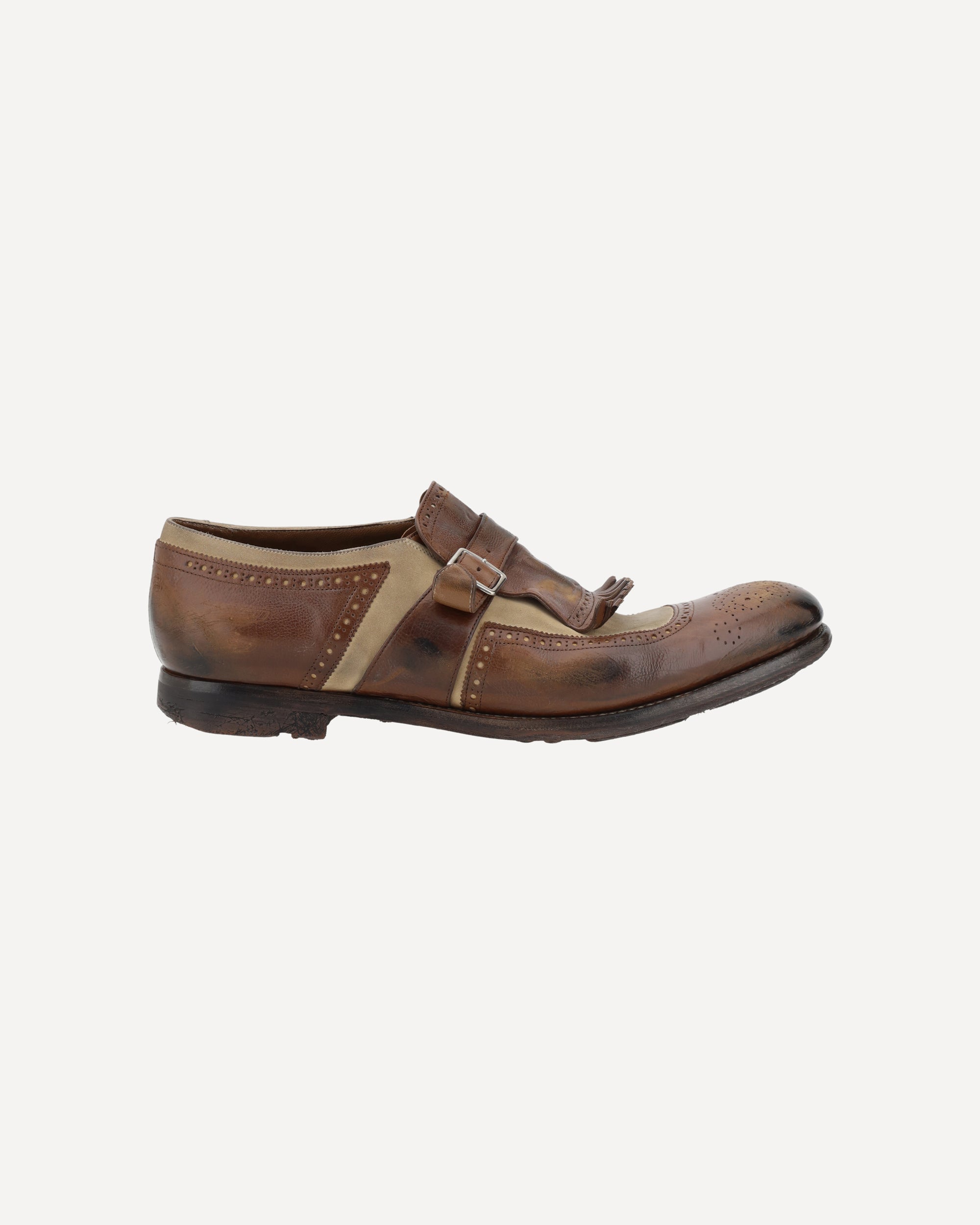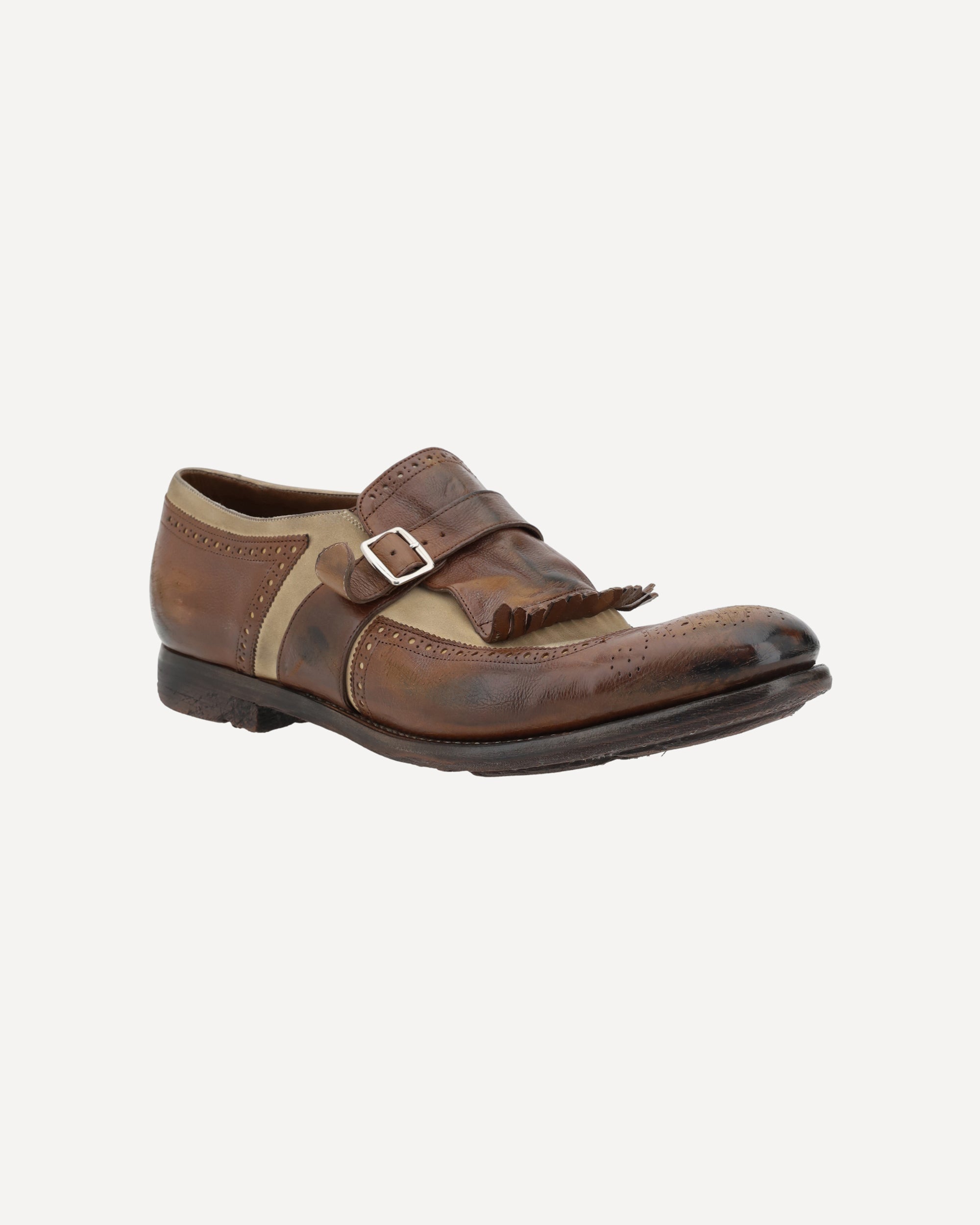 Church's leather Shanghai Loafers are a perfect example of elegance and sophistication. The almond toe on the front gives a sophisticated tapered profile, while the slight block heel adds a touch of height without compromising comfort. The front tray, embellished with a metal buckle, lends a luxurious and distinctive detail. The logo-embossed insole completes the design, underscoring the brand's authenticity. An elegant and versatile pair of loafers, ideal for a formal or chic look.