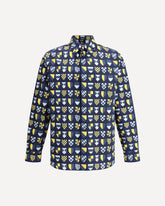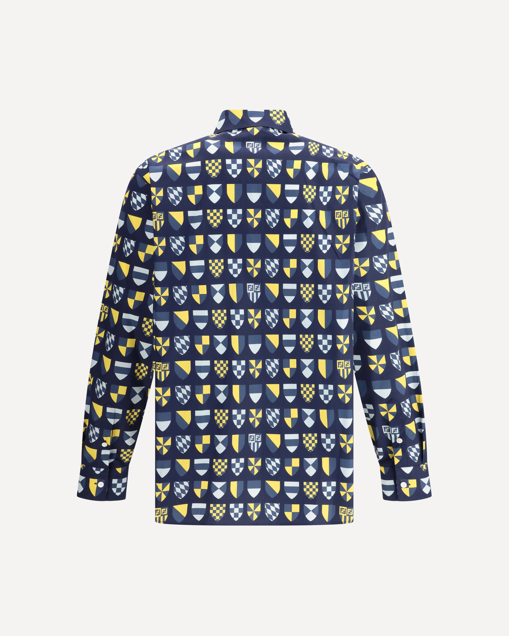 The Fendi cotton Shirt is an elegant and sophisticated garment, crafted from high-quality cotton to ensure comfort and freshness. It features a classic collar, ideal for a refined and versatile look. The front closure is characterised by buttons hidden by a flap, which gives the shirt a clean and minimalist look. The adjustable cuffs with buttons allow you to adapt the fit according to your preferences. The shirt is enriched by a print with multicoloured banners, which adds a lively and distinctive touch to the design. The iconic contrasting FF detail on the front highlights the Fendi logo, making the garment easily recognisable and classy.