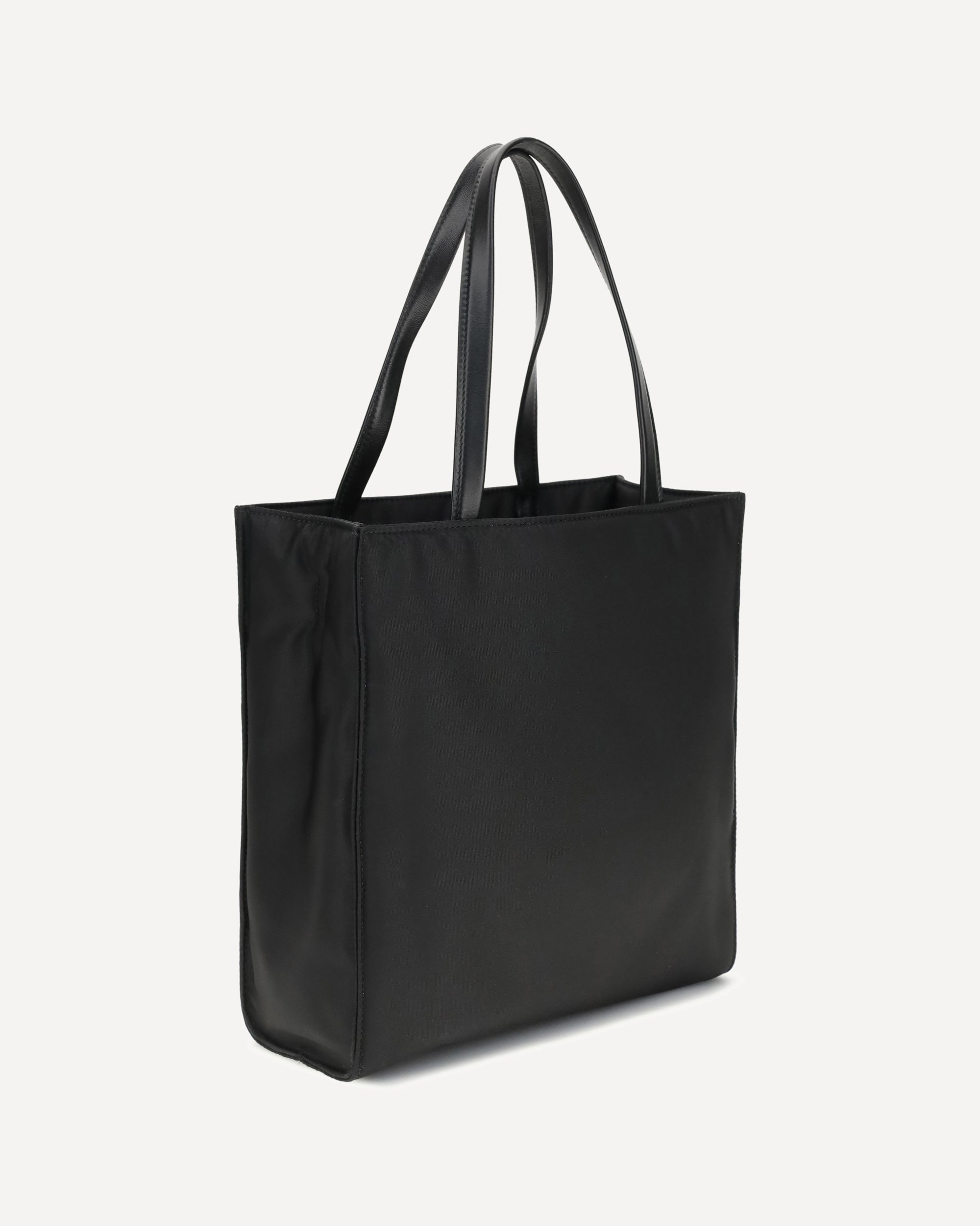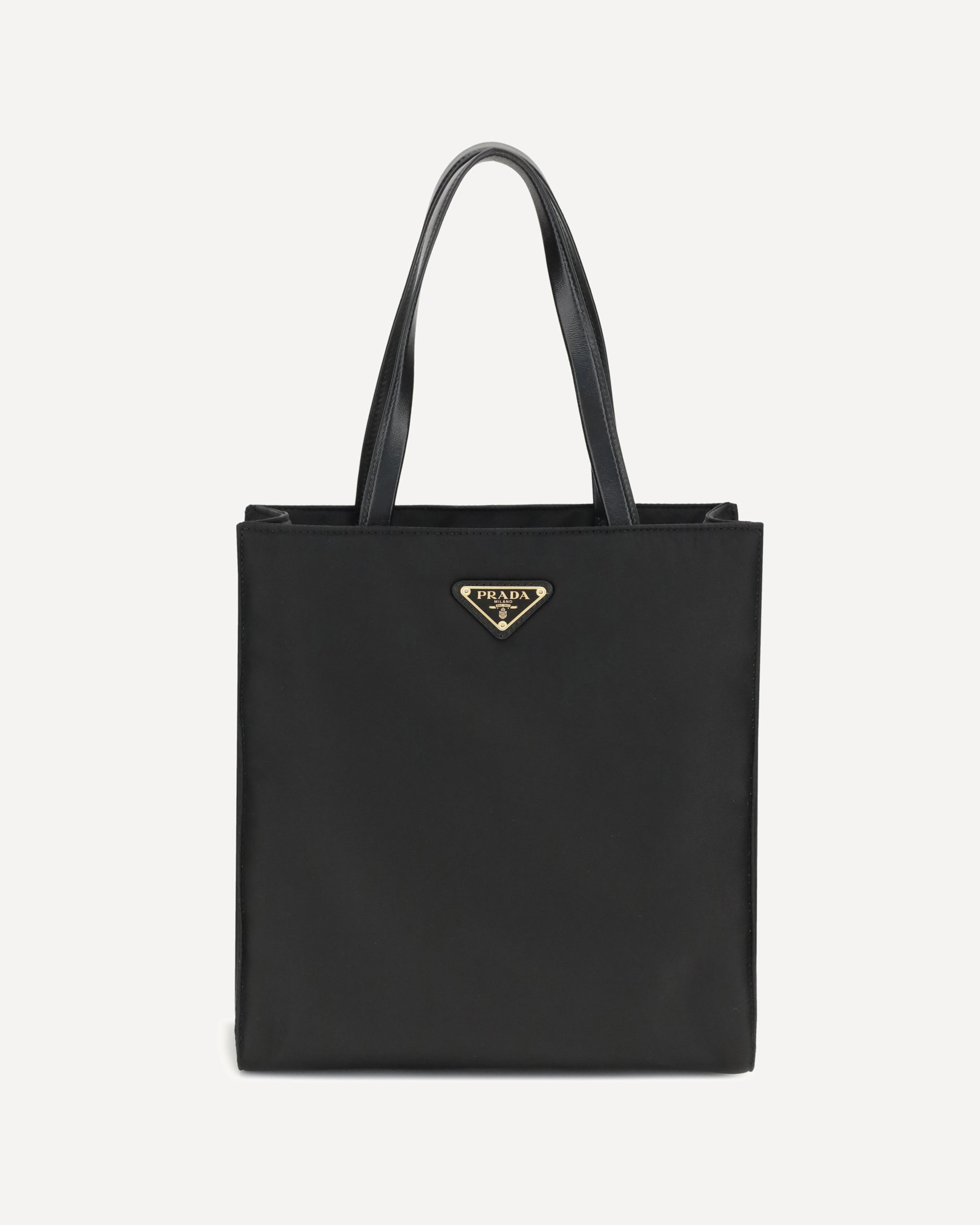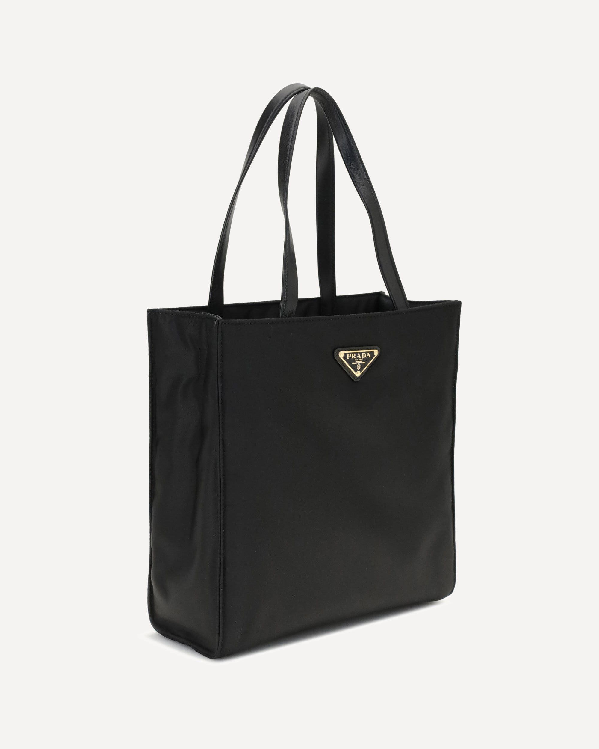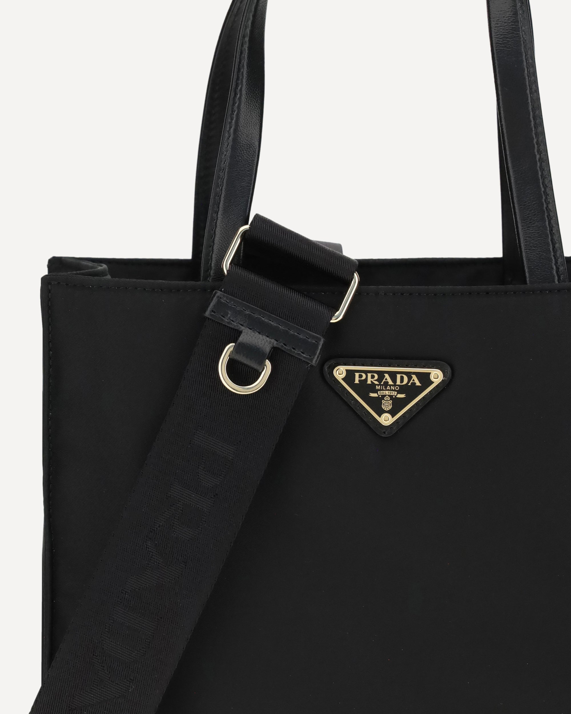 Re-Nylon Tote Bag by Prada features a functional and elegant design. Equipped with two leather handles, it features the iconic triangular plaque on the front and an adjustable and removable nylon shoulder strap for added versatility.