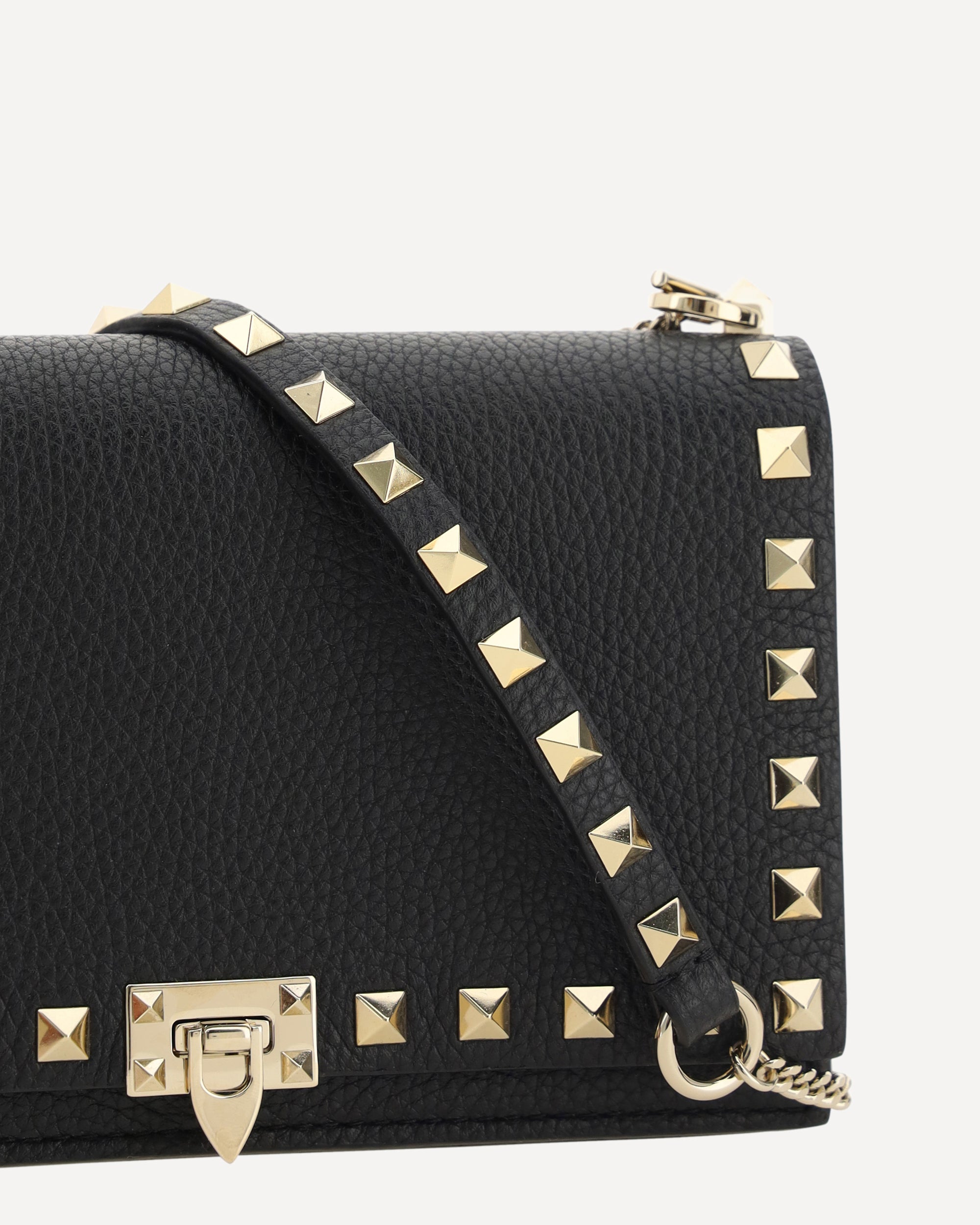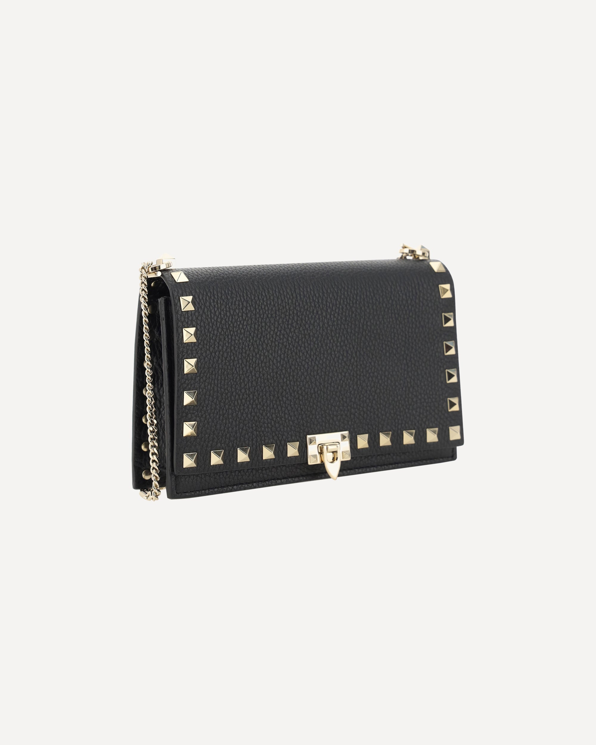 The Valentino Garavani leather Shoulder Bag is a sophisticated accessory. The edging is embellished with the iconic Rockstud studs, applied on the front and back. The front closure features a swivel, while the contrasting printed brand monogram stands out on the back. The shoulder strap combines leather and removable chain, offering versatility and style. A perfect balance between elegance and boldness.