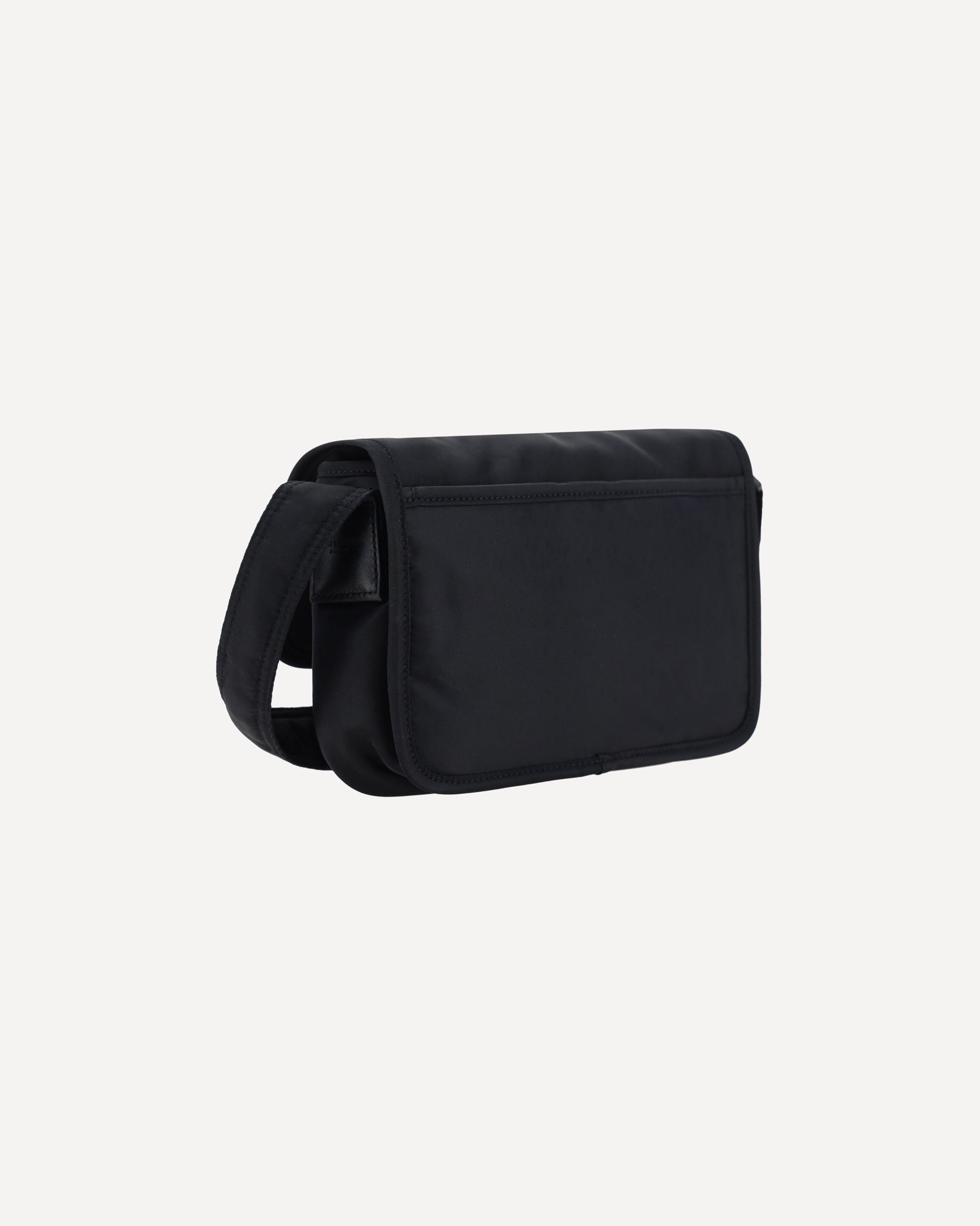 Shoulder Bag by Saint Laurent, adjustable shoulder strap, front closure with magnetic flap, iconic three-dimensional YSL logo plaque applied to front, welt pocket on back panel, single interior compartment.