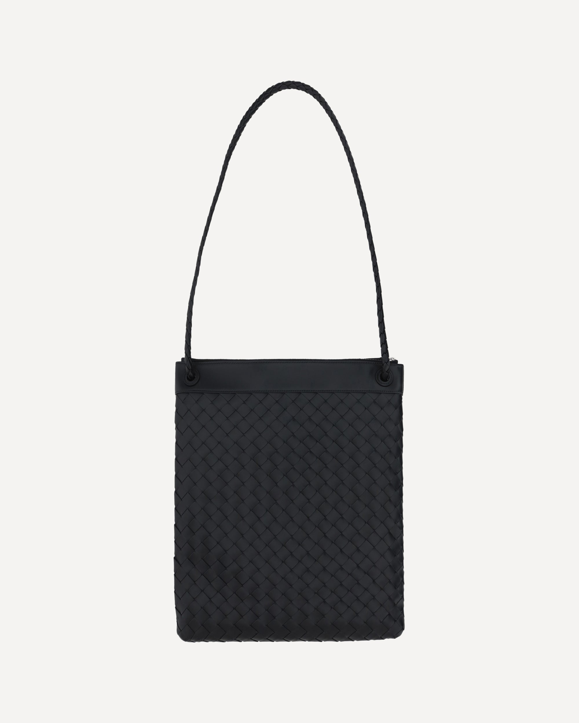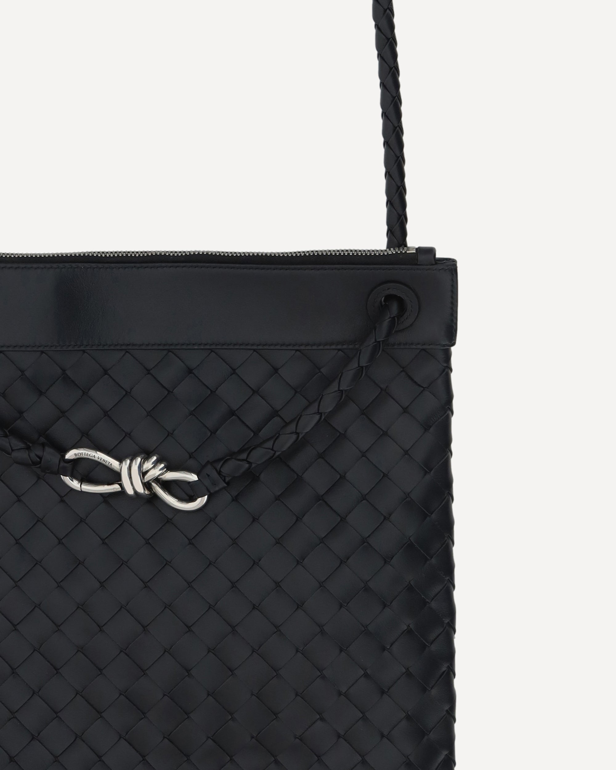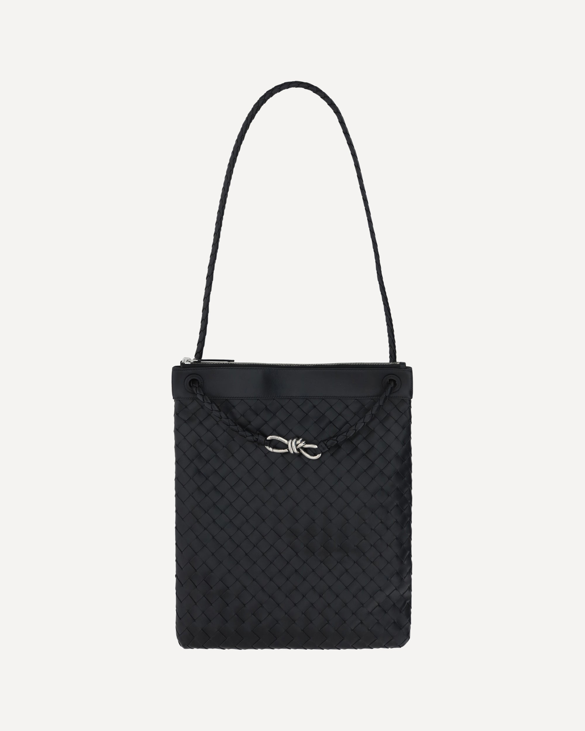 Leather Shoulder Bag by Bottega Veneta featuring the brand's iconic woven design, sliding tubular shoulder strap with emblematic Knot detail, zipper closure at top, single interior compartment, geometric design.