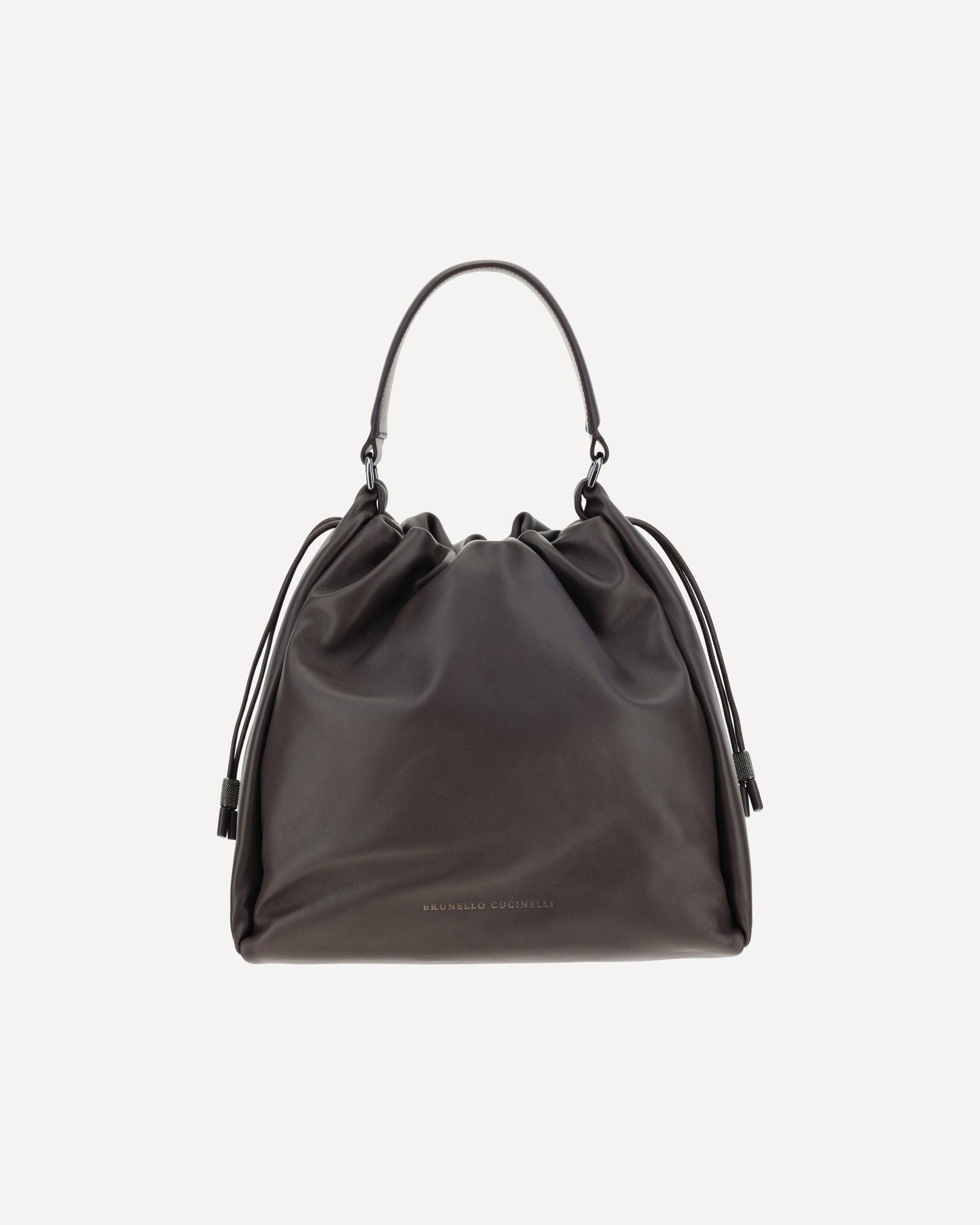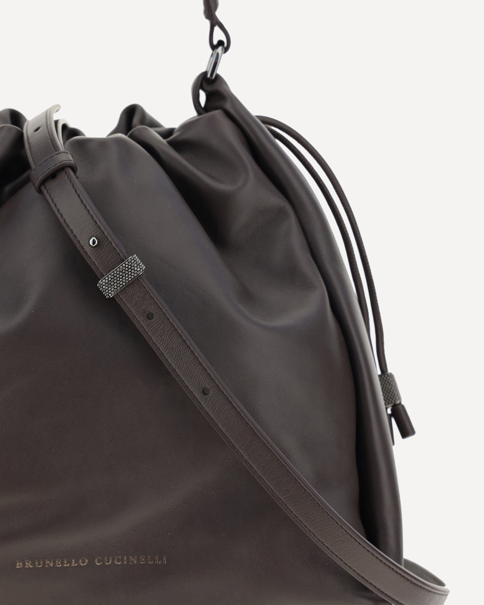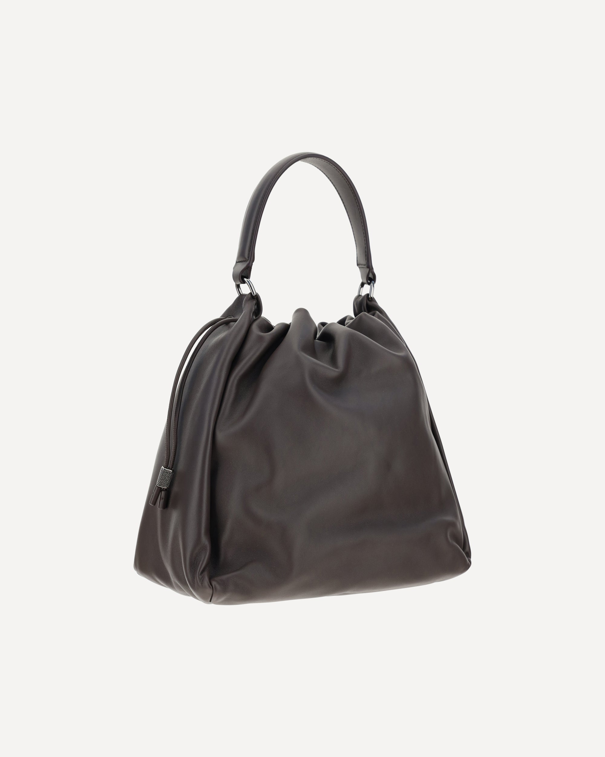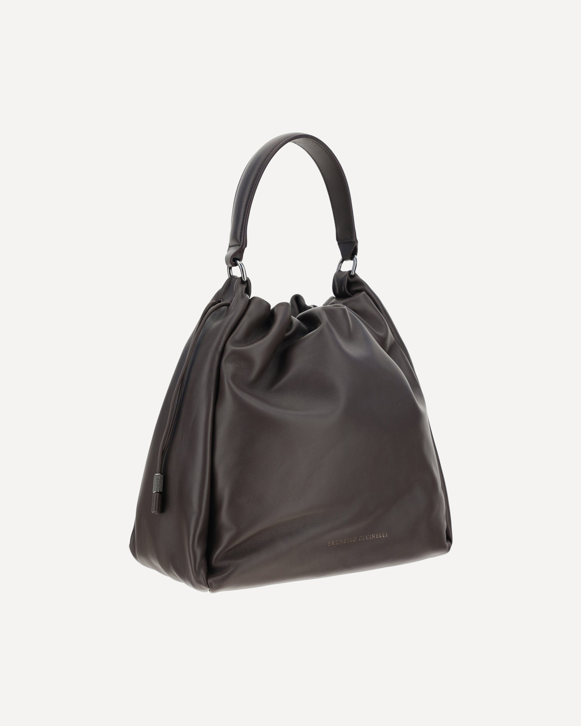 Leather Shoulder Bag by Brunello Cucinelli, top closure by drawstring, adjustable and removable flat handle at top, one compartment, iconic brand signature press-stamped on front.