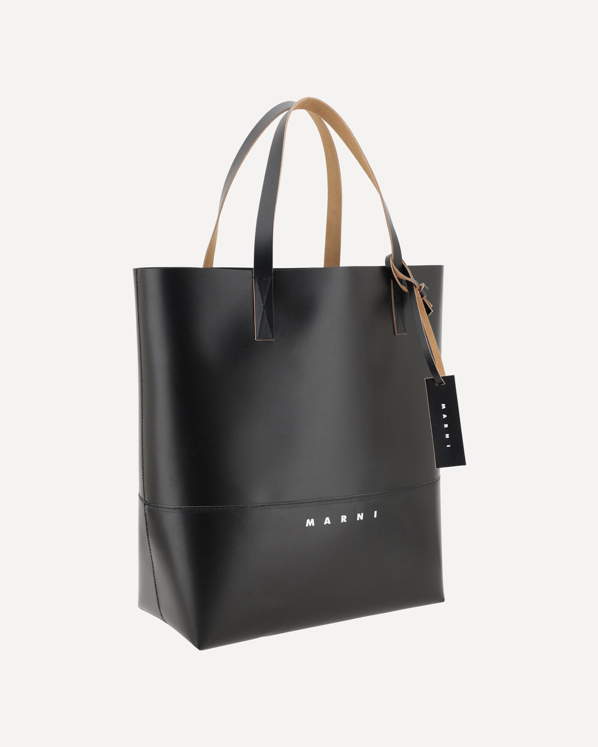 Shoulder Bag by Marni, two flat top handles, single interior compartment, contrasting iconic brand monogram on front, geometric design.