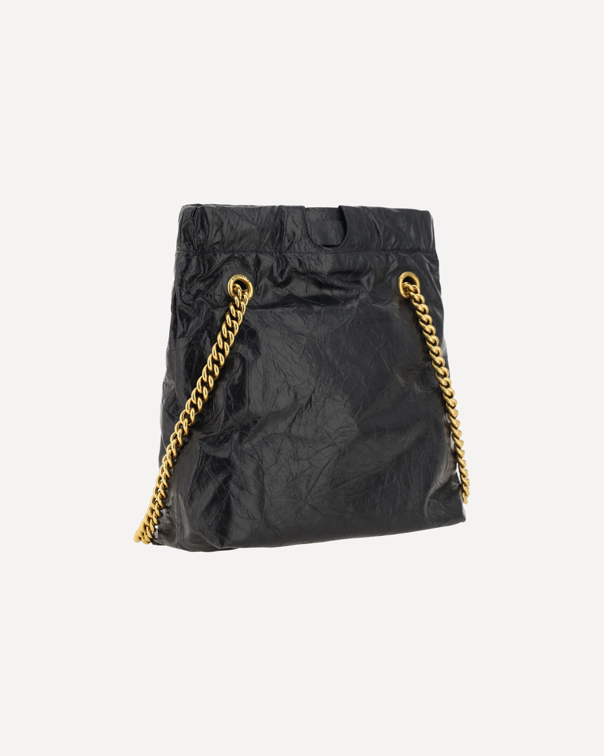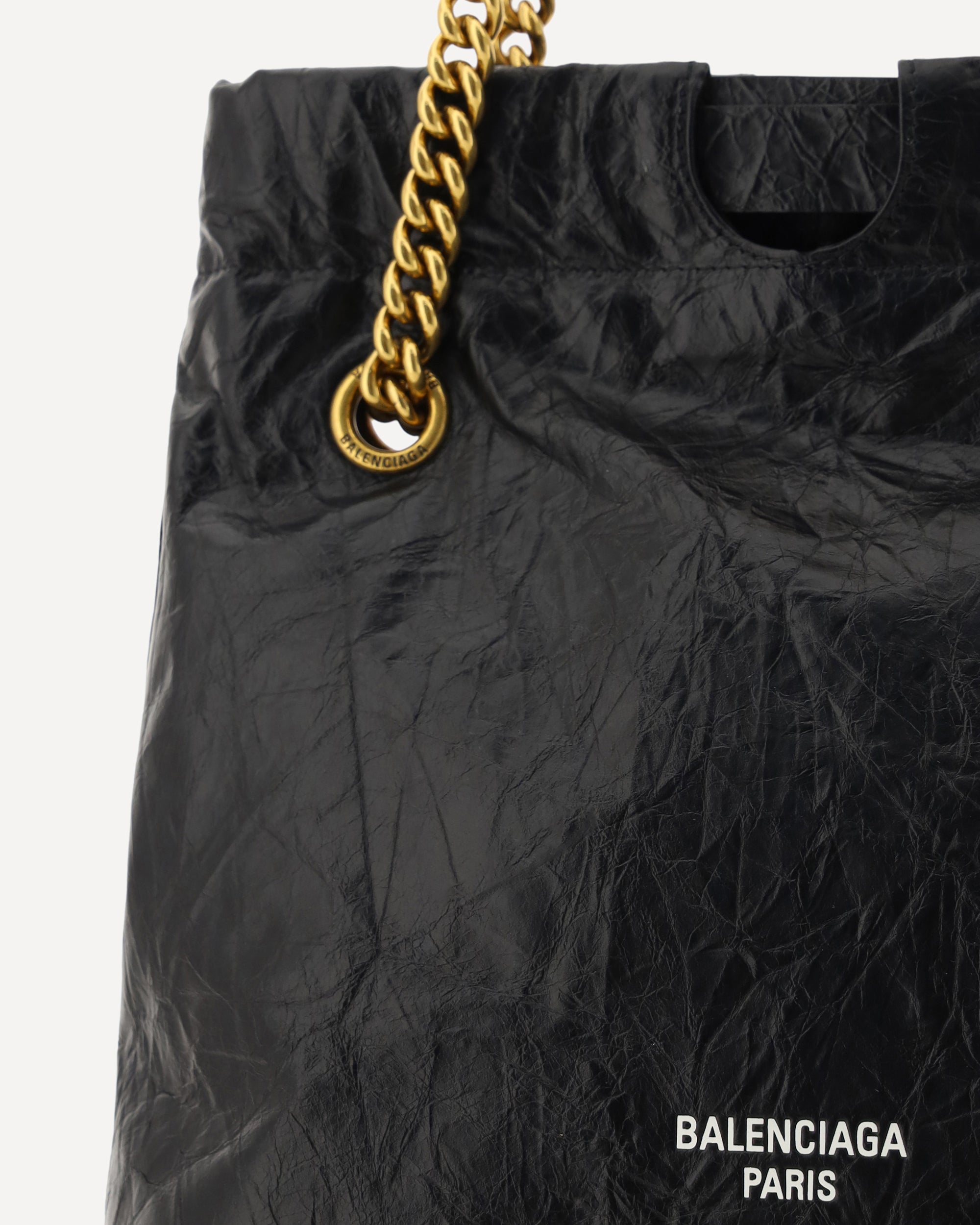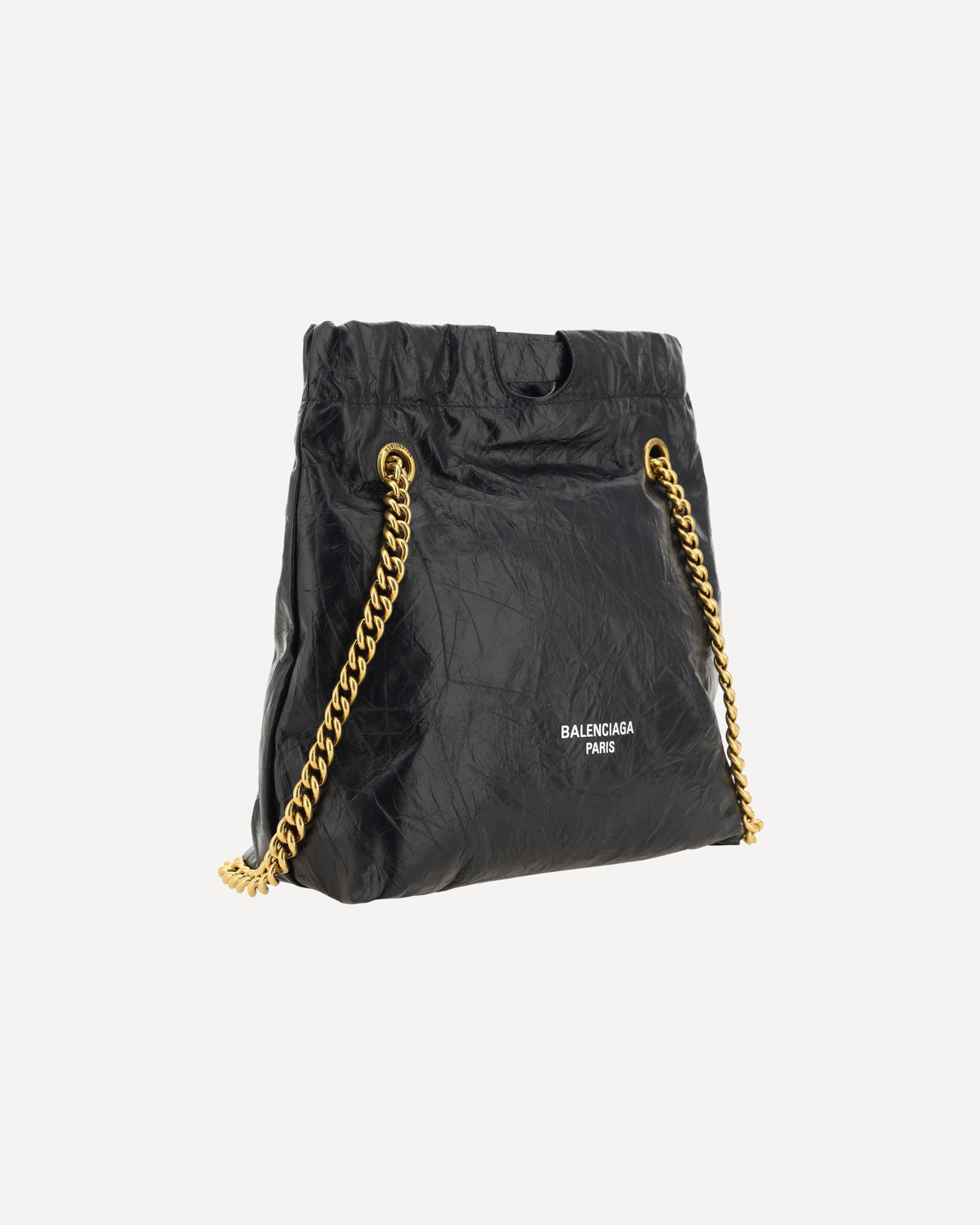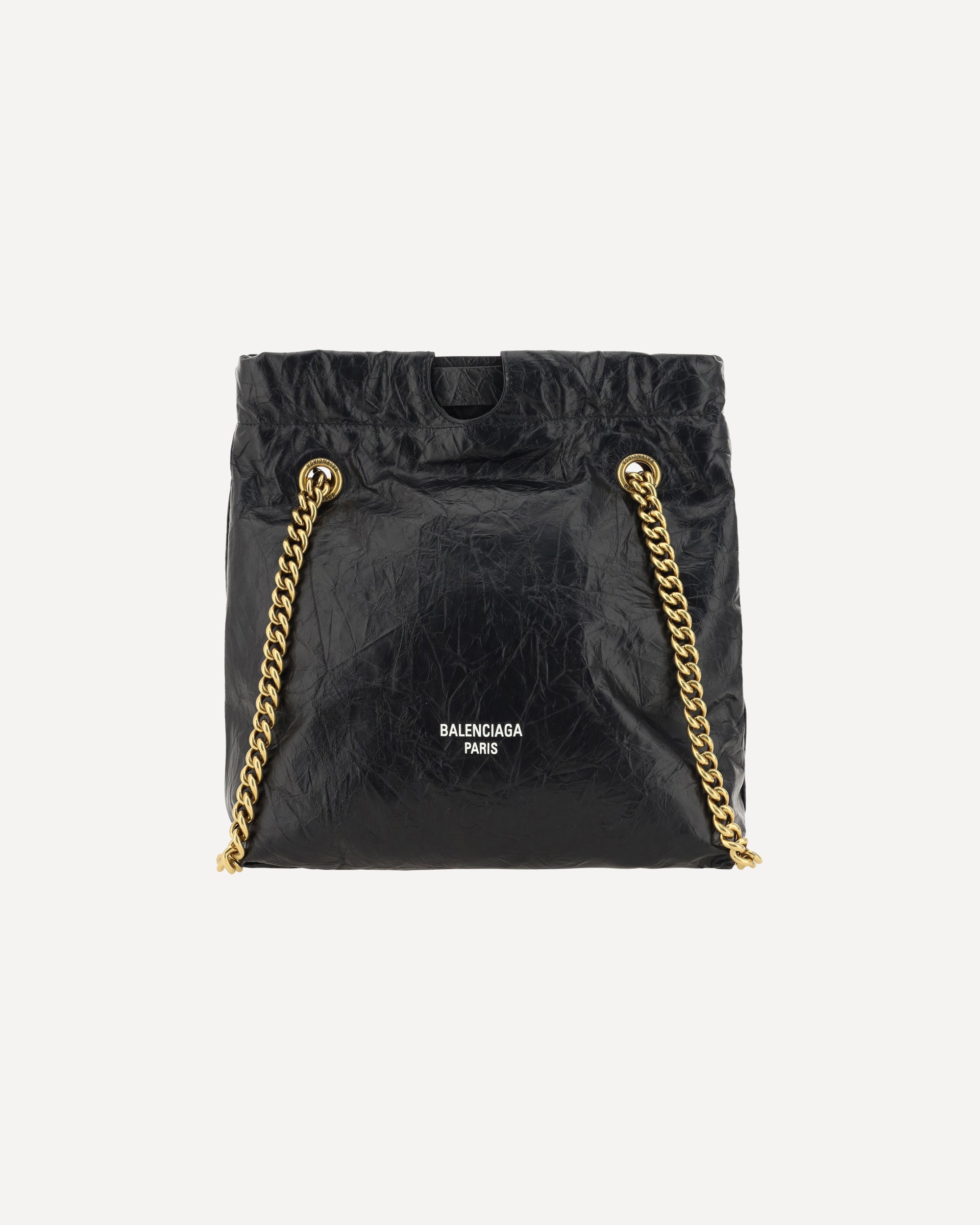 Calfskin Shoulder Bag by Balenciaga, sliding chain drawstring, wrinkled effect design, iconic contrasting logo on the front, single internal compartment.