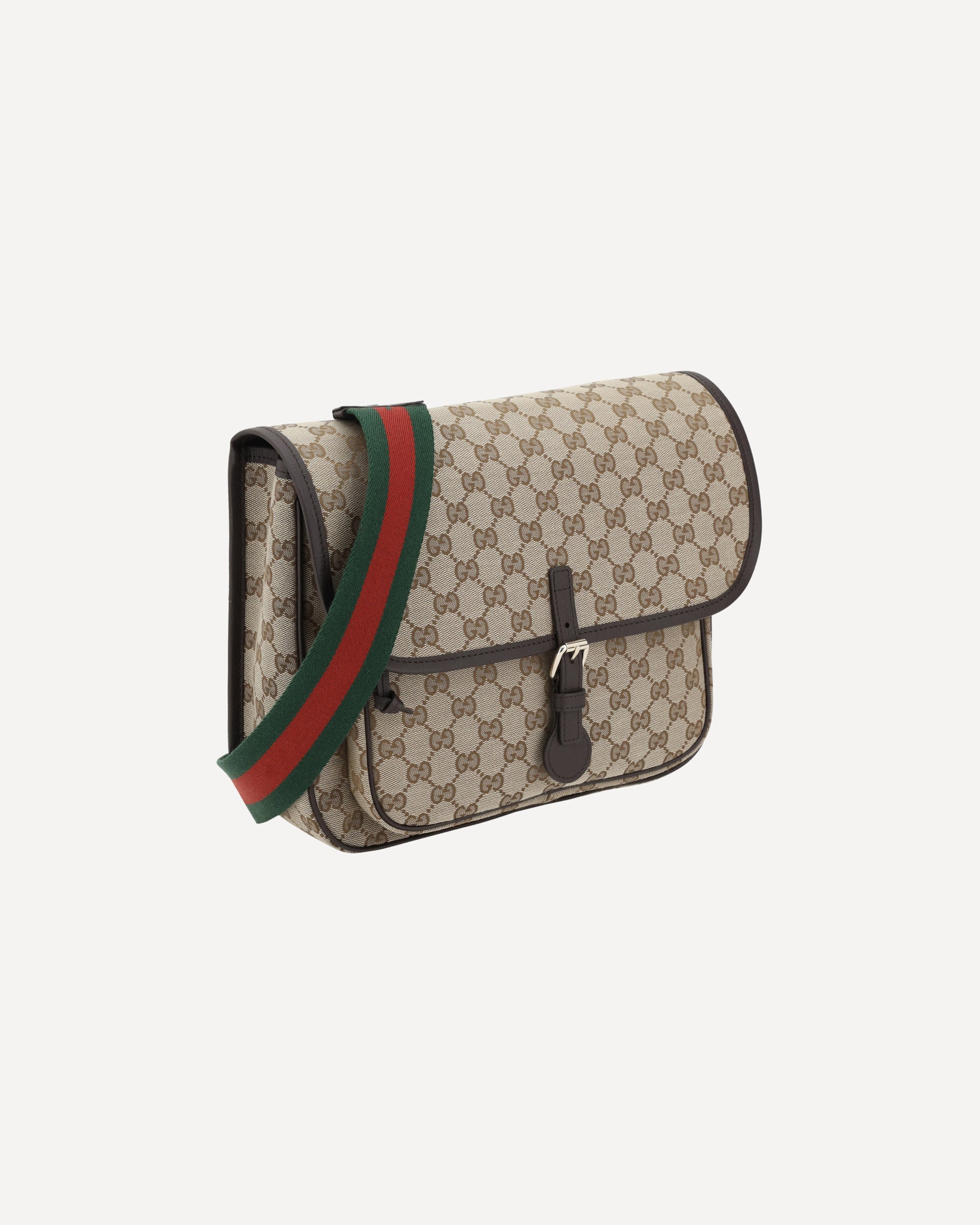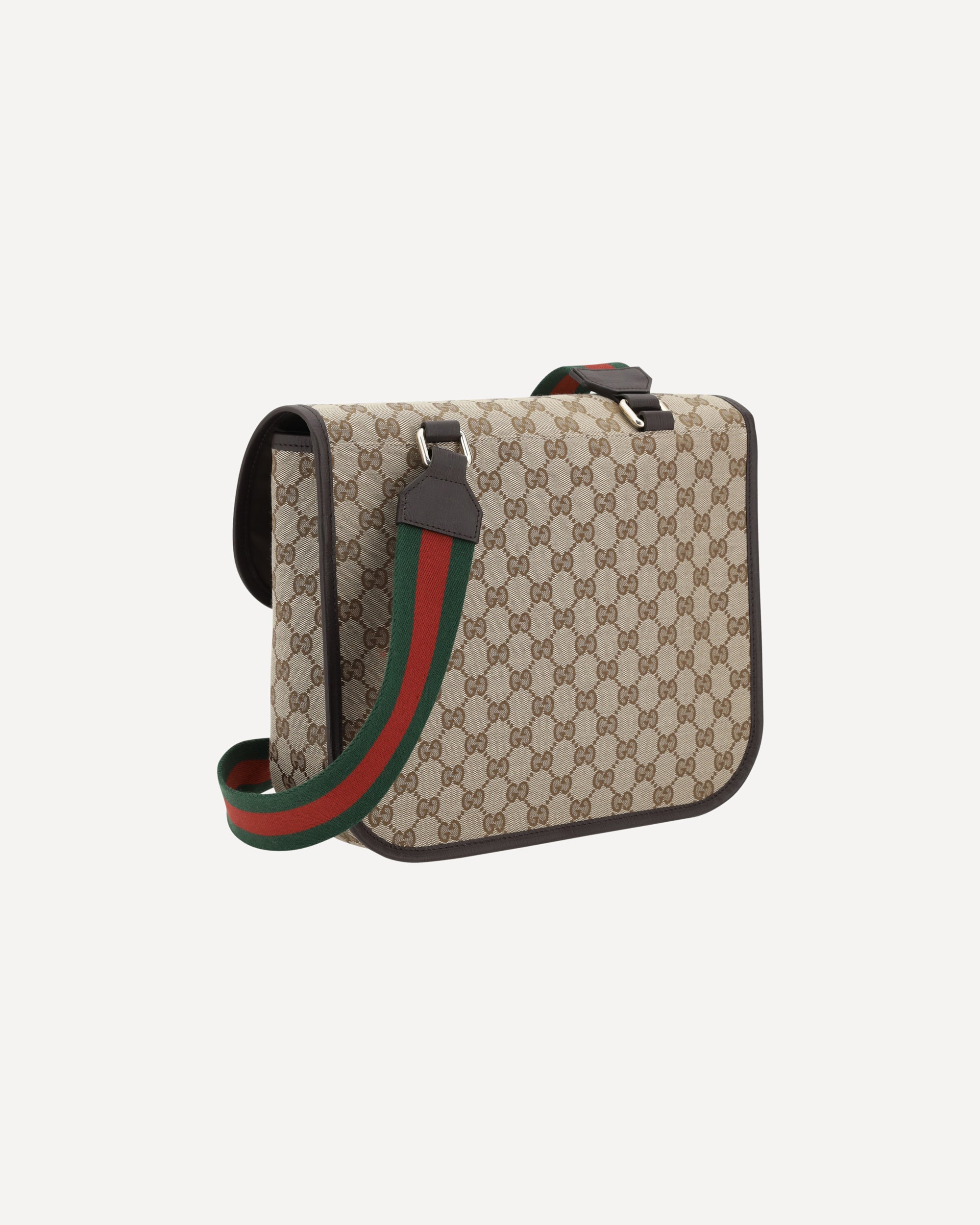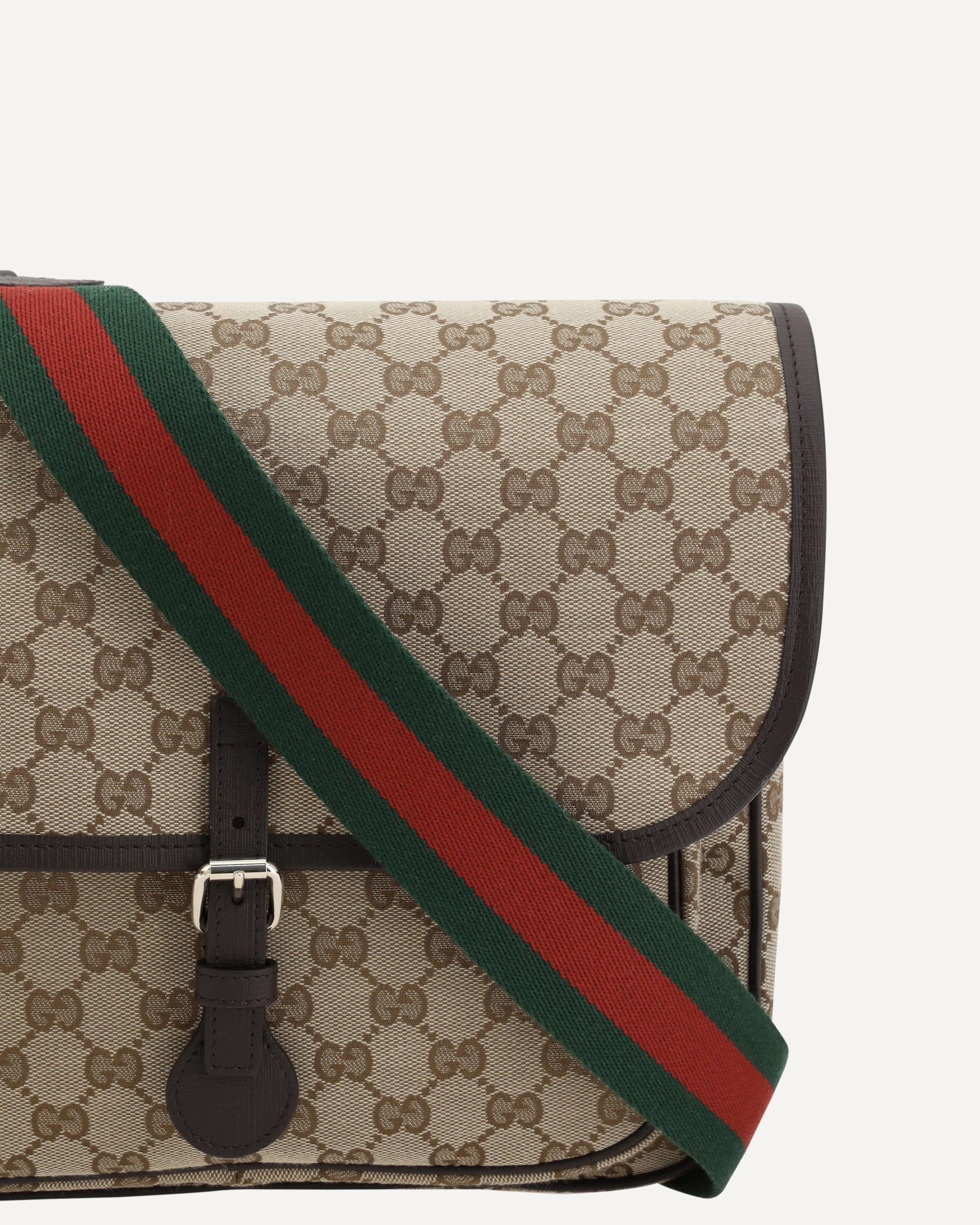 Shoulder Bag for Girl by Gucci, front flap closure with strap, single compartment, one back strap with bands of the brand's iconic colors, iconic all-over printed GG pattern.