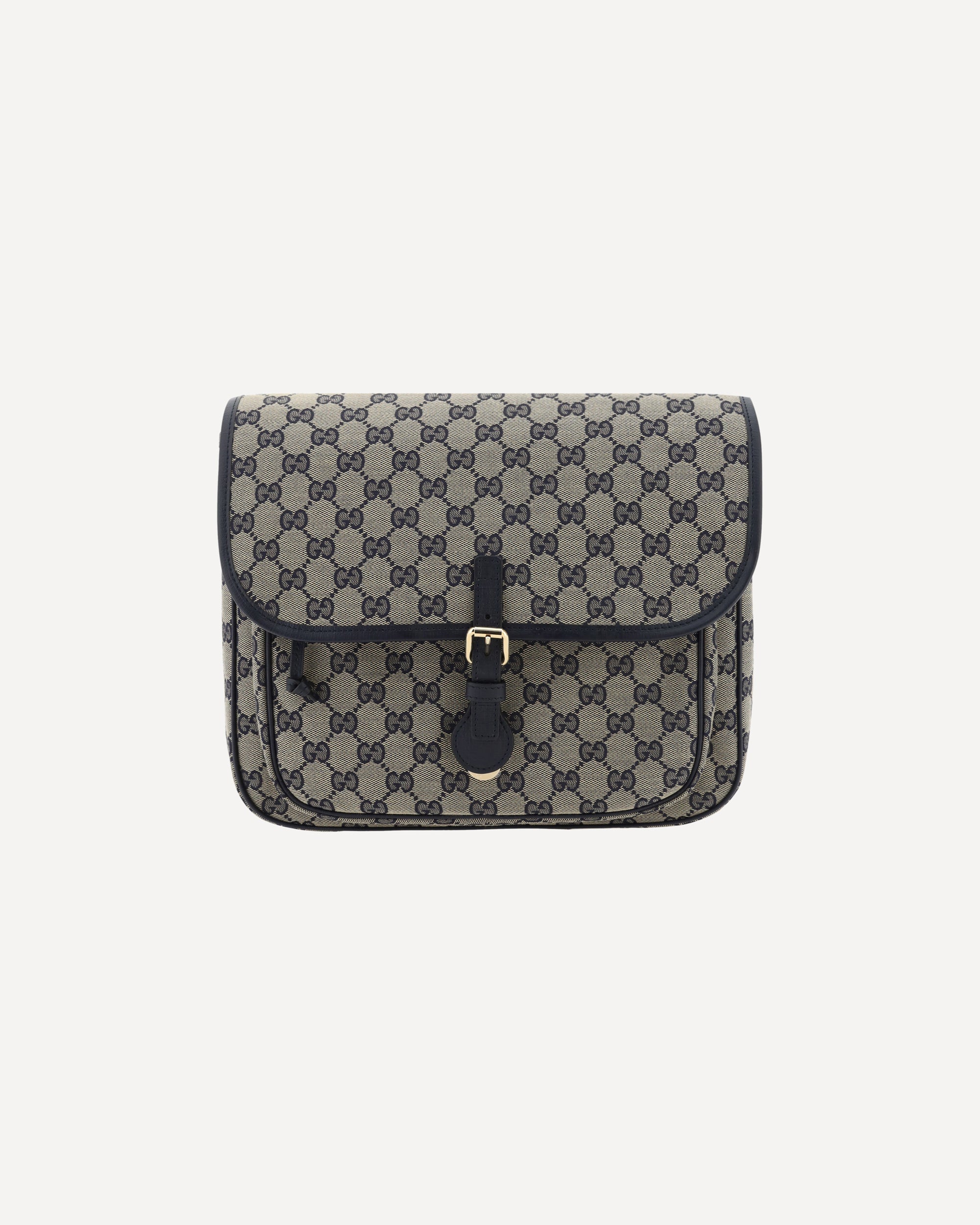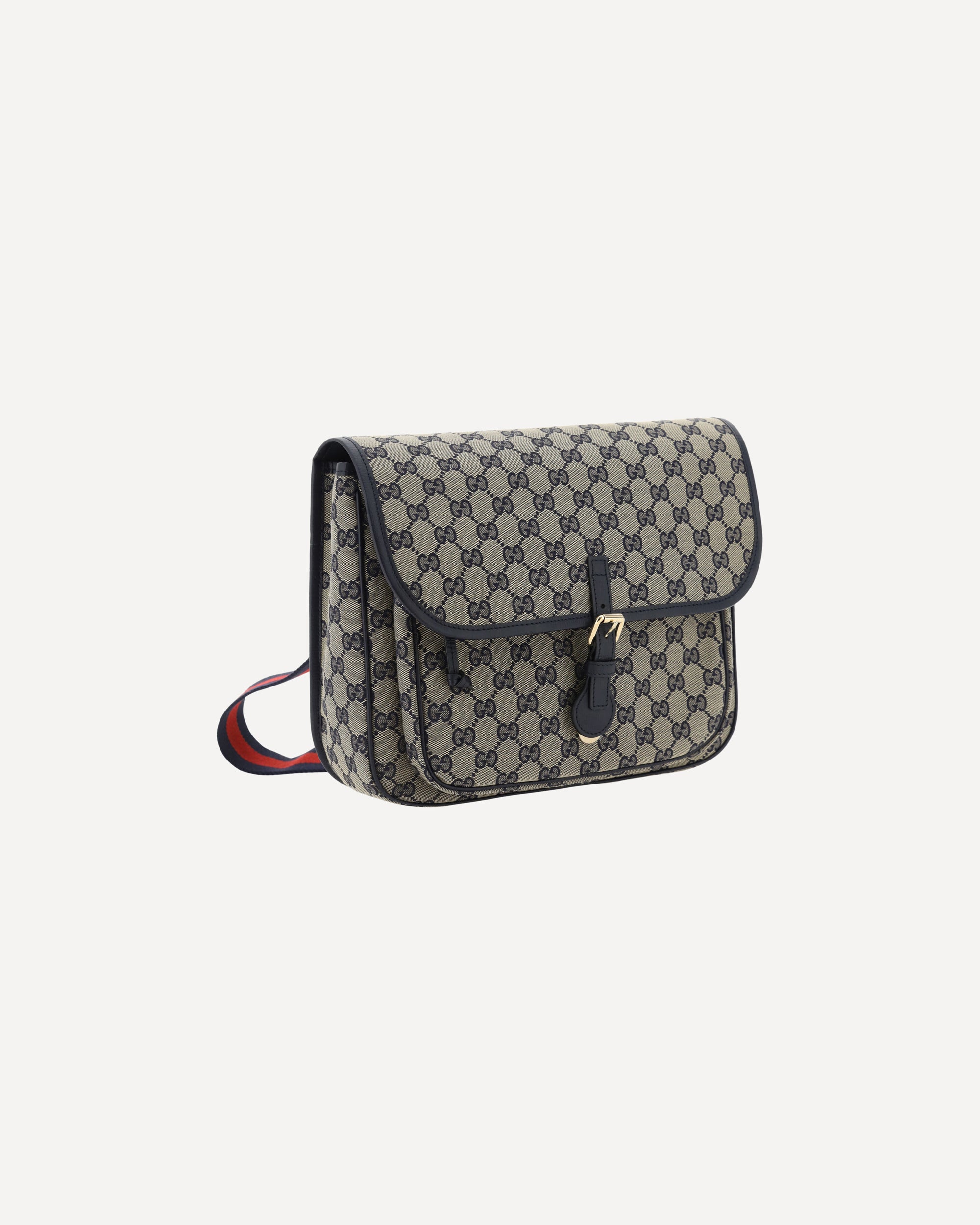 Shoulder Bag for Girl by Gucci, front flap closure with strap, single compartment, one back strap with bands of the brand's iconic colors, iconic all-over printed GG pattern.