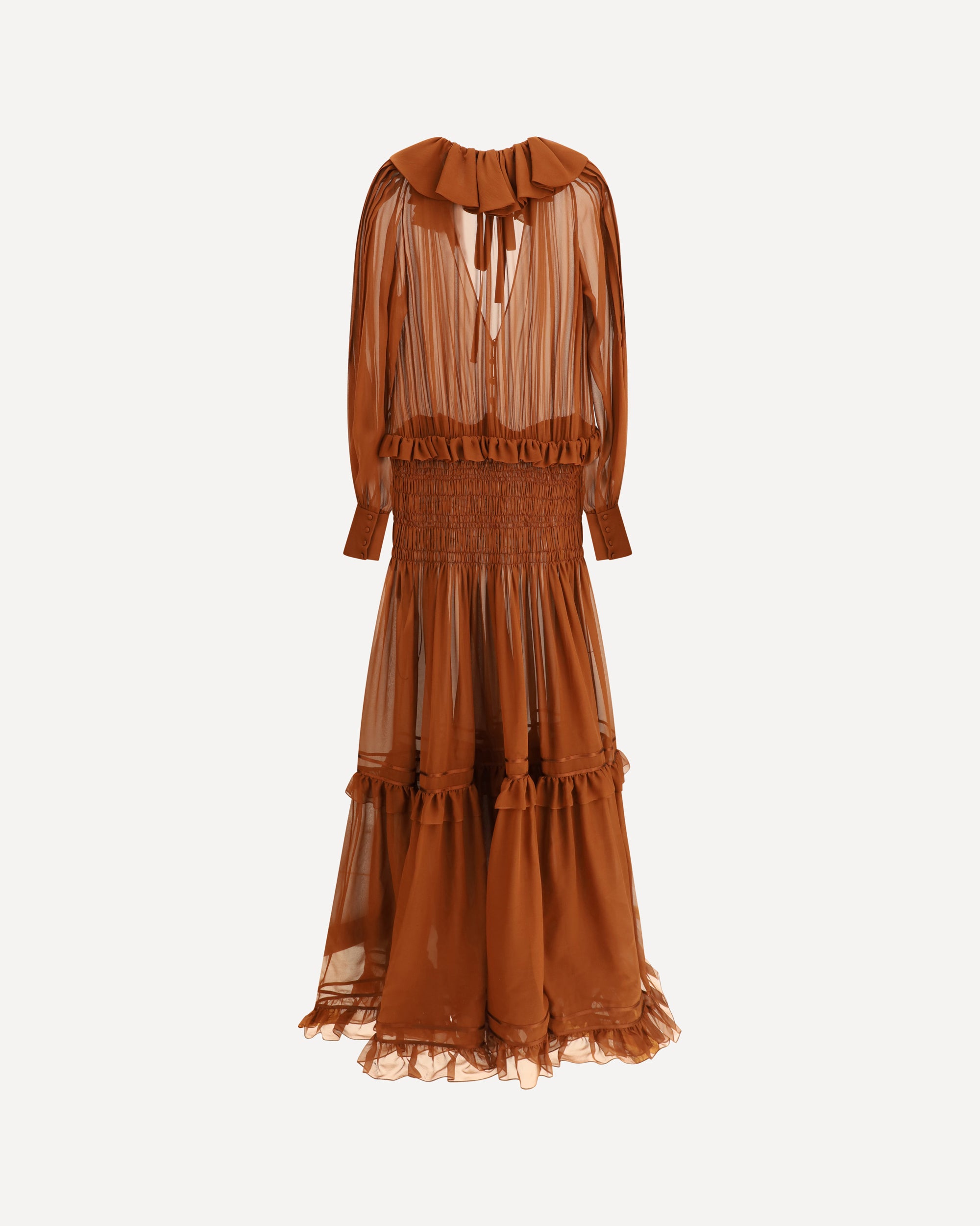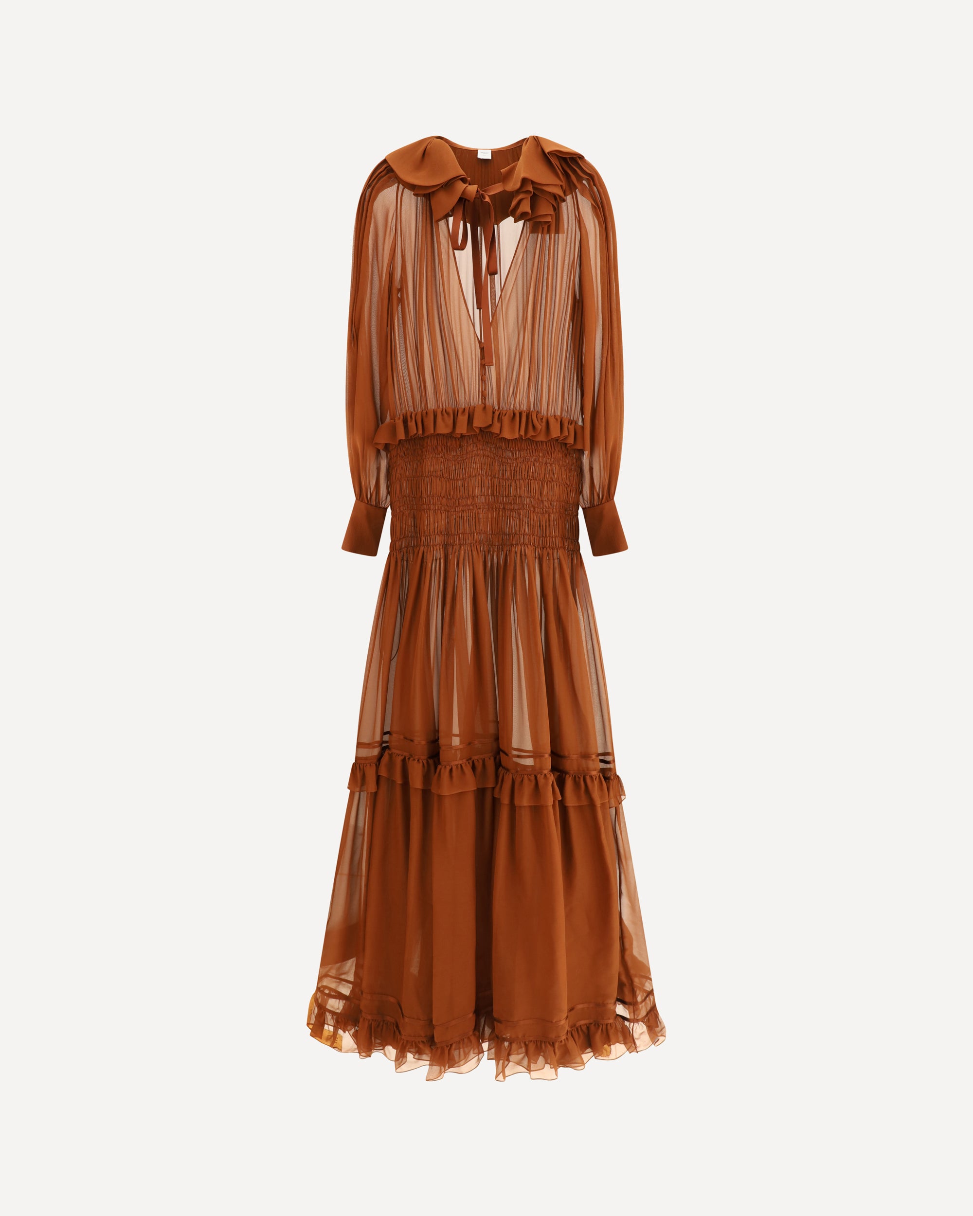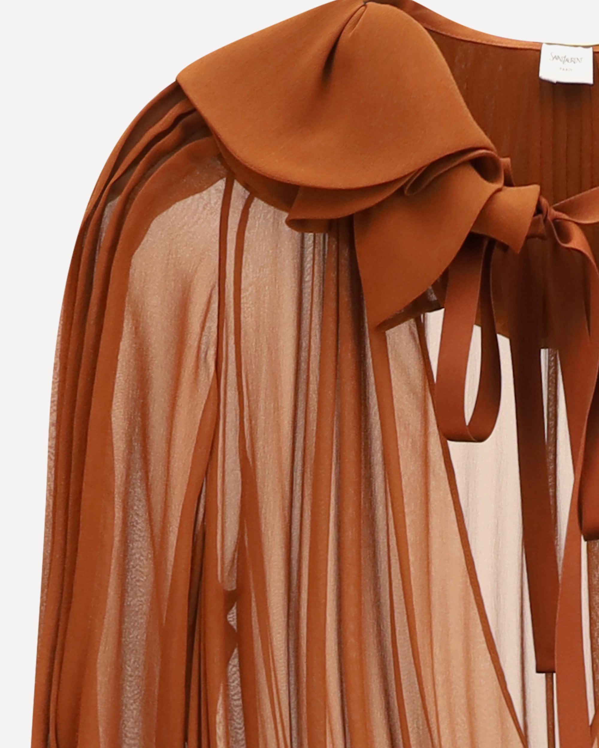 Saint Laurent's silk long dress has a romantic, retro appeal. Made of semi-transparent silk, it features long puff sleeves and a delicate Pierrot collar. The V-neckline on the front adds femininity, while the country-inspired skirt is enhanced by a corset-effect waist with smock stitch and ruffle trim that lends movement and lightness. An iconic garment perfect for special occasions.