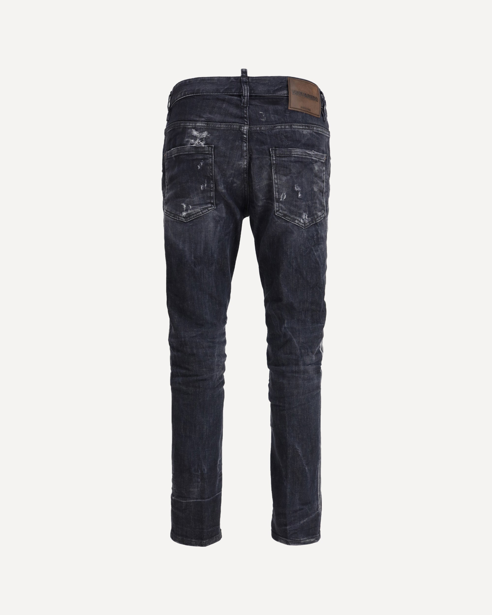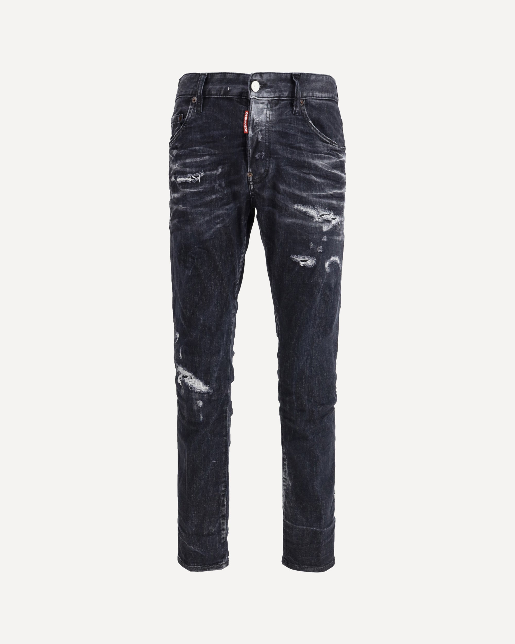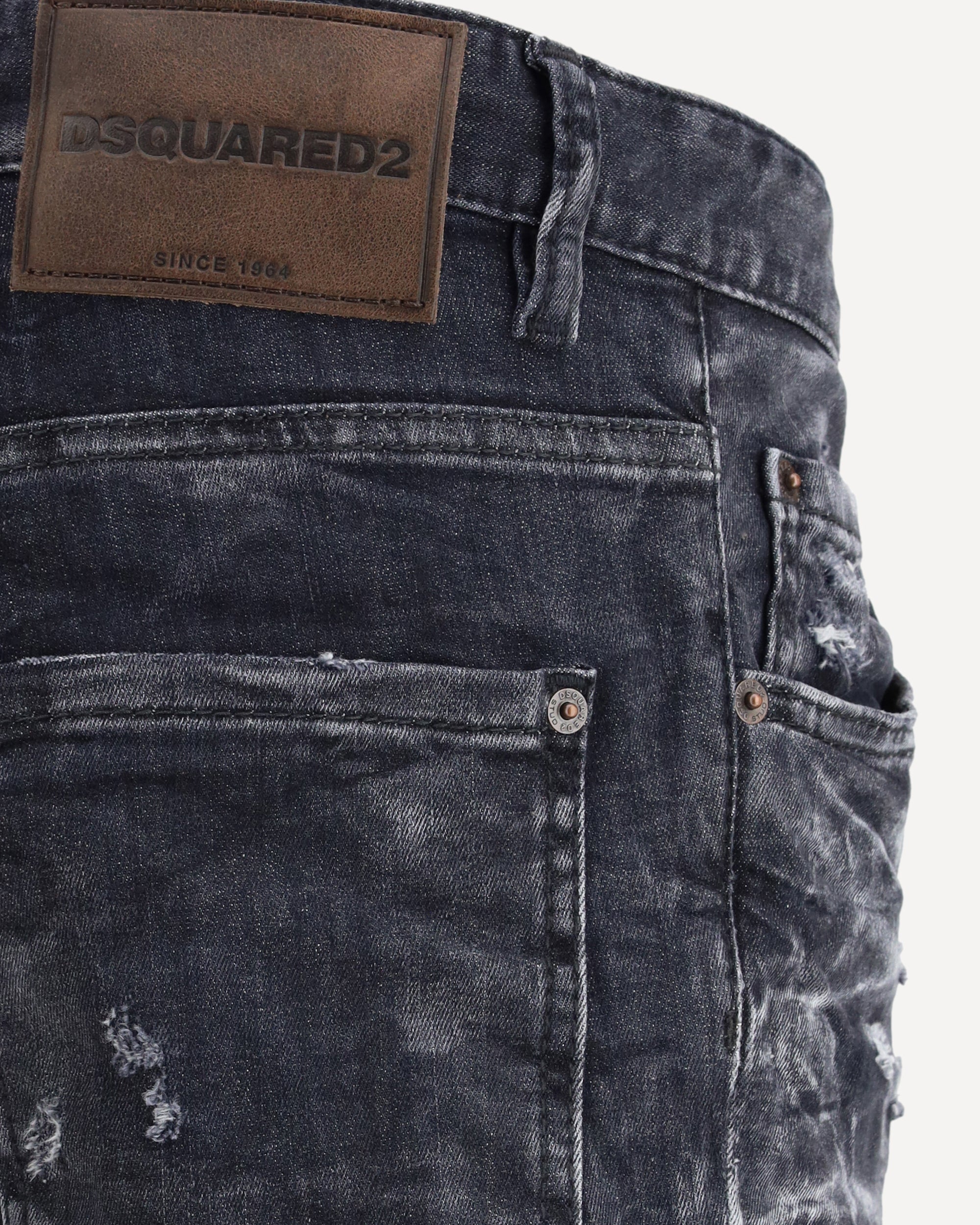 The Dsquared2 Skater Jeans in cotton are a vintage-style pair, with a worn effect that gives them a lived-in and dynamic appearance. The mid-rise waist and straight cut with five pockets offer a comfortable and versatile fit, while the front button closure adds a touch of originality. The belt loops at the waist allow for customization with a belt. A distinctive detail is the iconic leather patch with the brand's signature stamped on it, applied to the back, emphasizing the elegance and exclusive character of the piece.