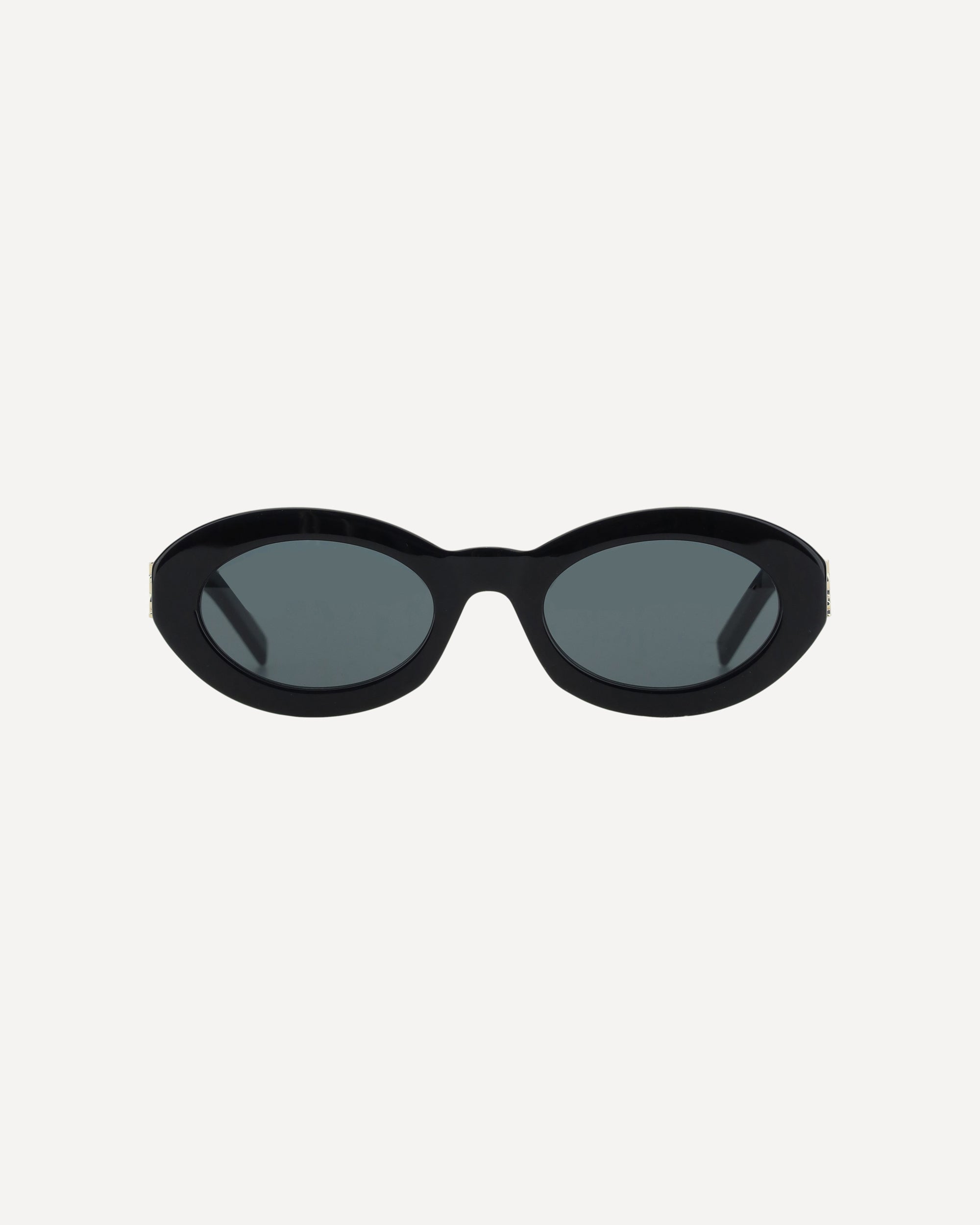 SL M136 Sunglasses by Saint Laurent, monochrome oval lens design, three-dimensional plaque with iconic brand logo applied on the crease between the lenses and acetate temples.