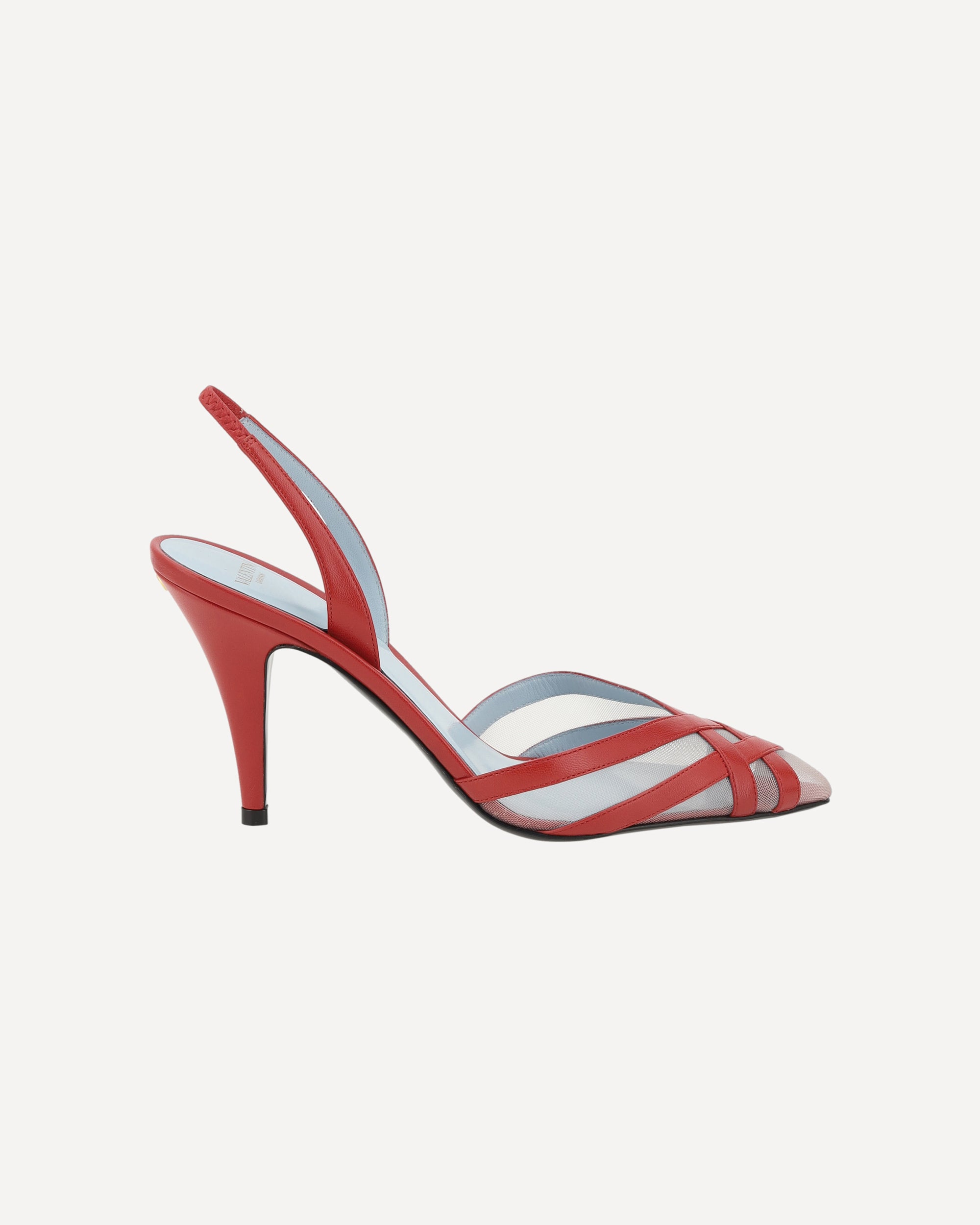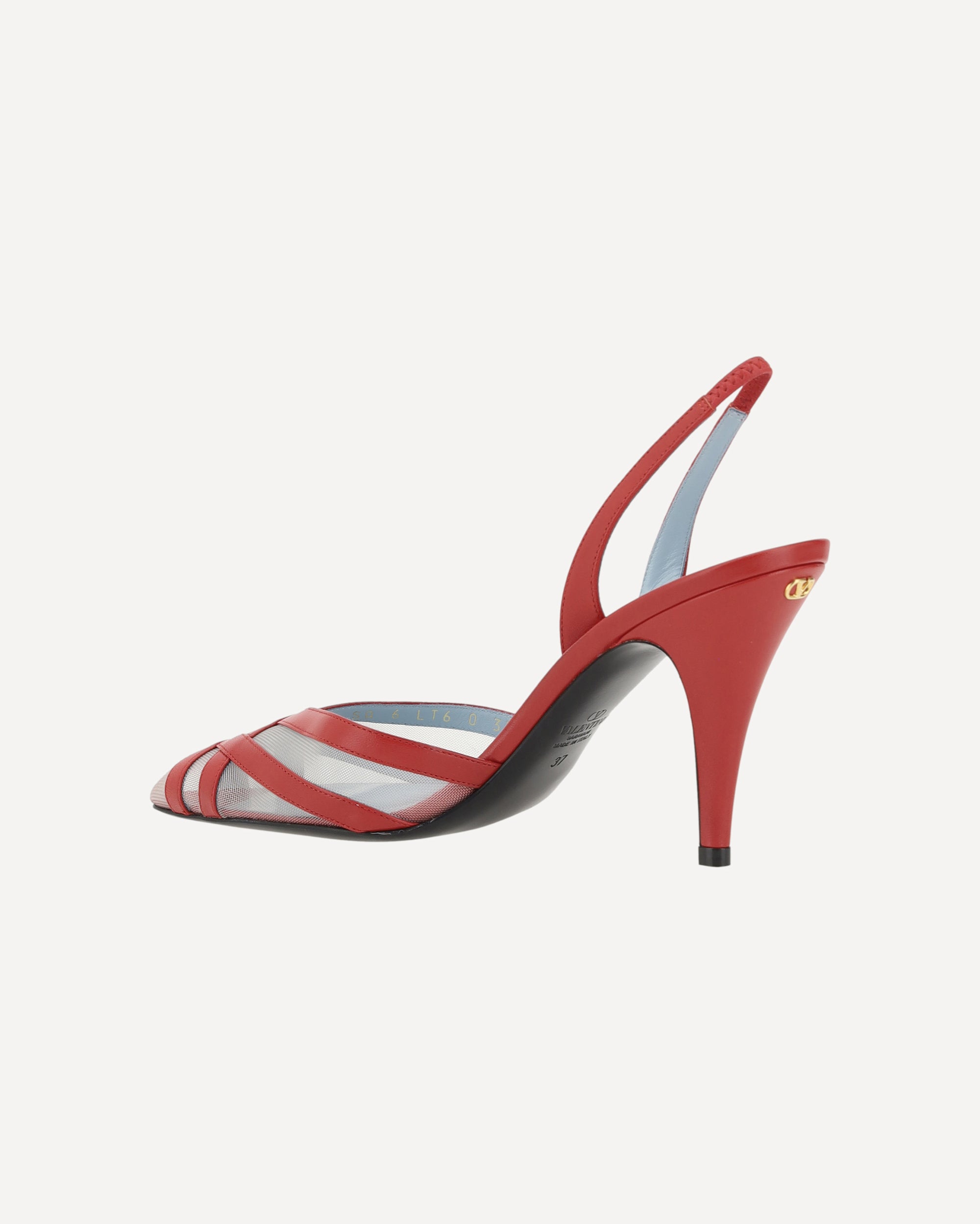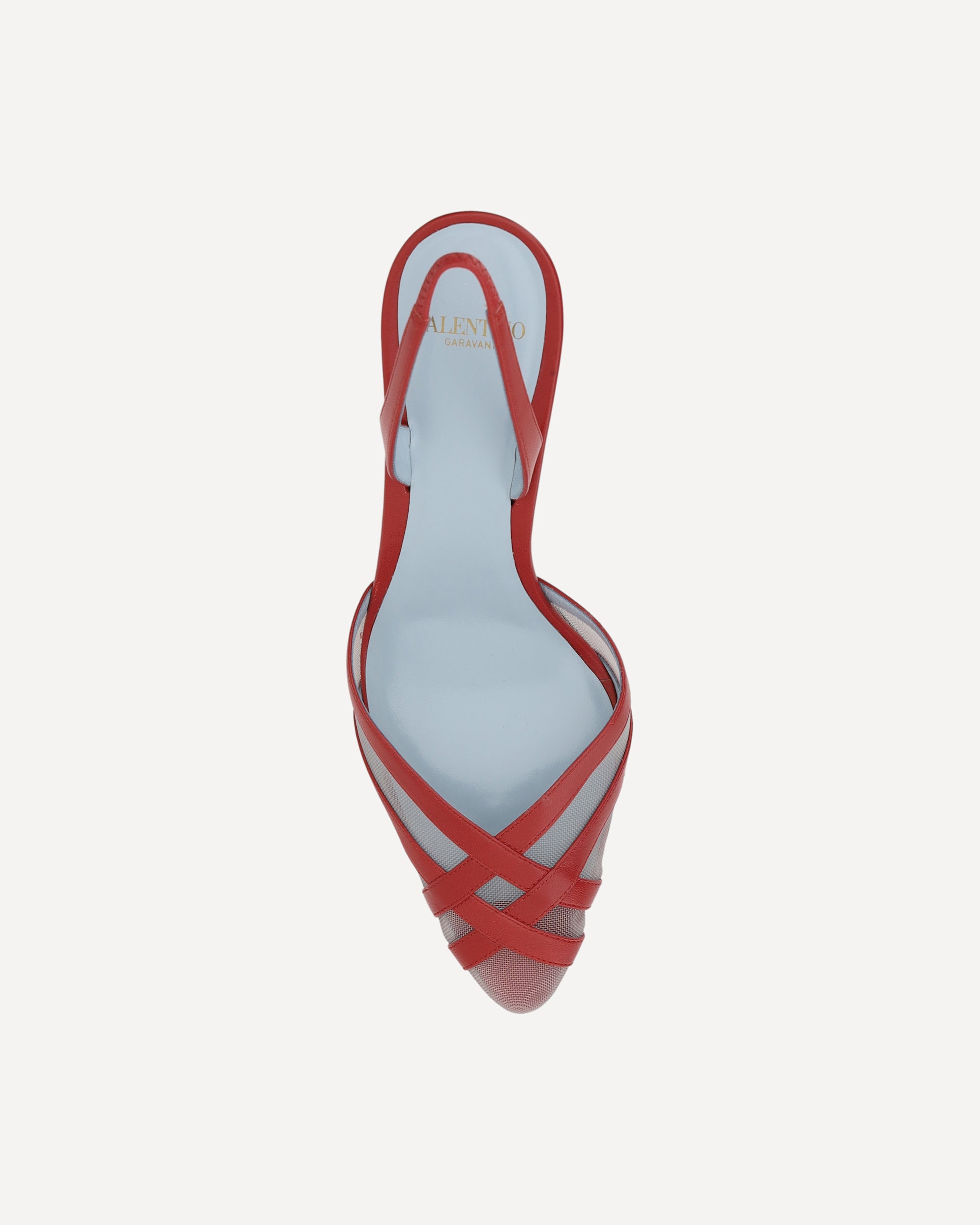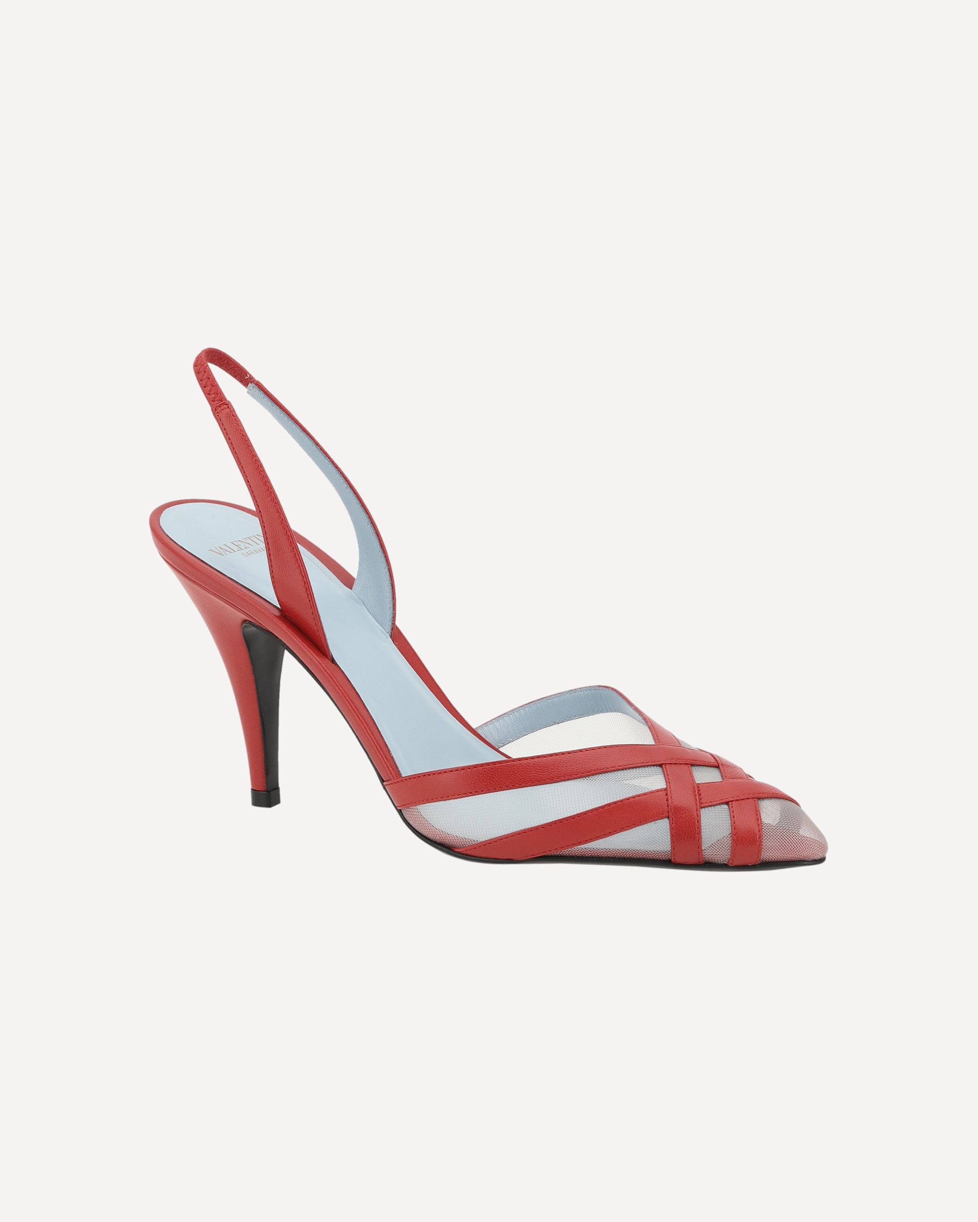 Valentino Garavani's leather Pumps are a pair of elegant and sophisticated shoes, perfect for adding a touch of class to any outfit. The almond toe gives a refined and slender shape, while the details in crossed leather with semi-transparent fabric create an elegant and modern contrast. The leather stiletto heel offers a touch of femininity and elongates the figure, while the logo insole adds a distinctive detail of the brand. The elasticated slingback guarantees a comfortable and secure fit, allowing you to wear them easily without sacrificing style.