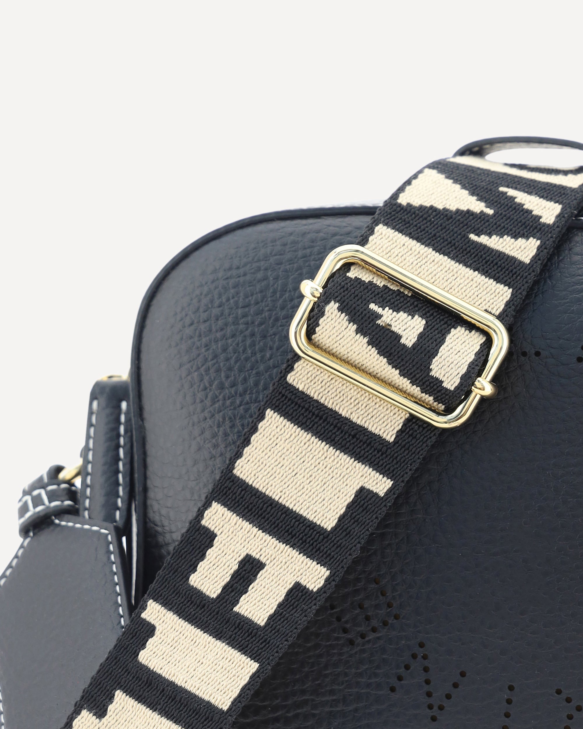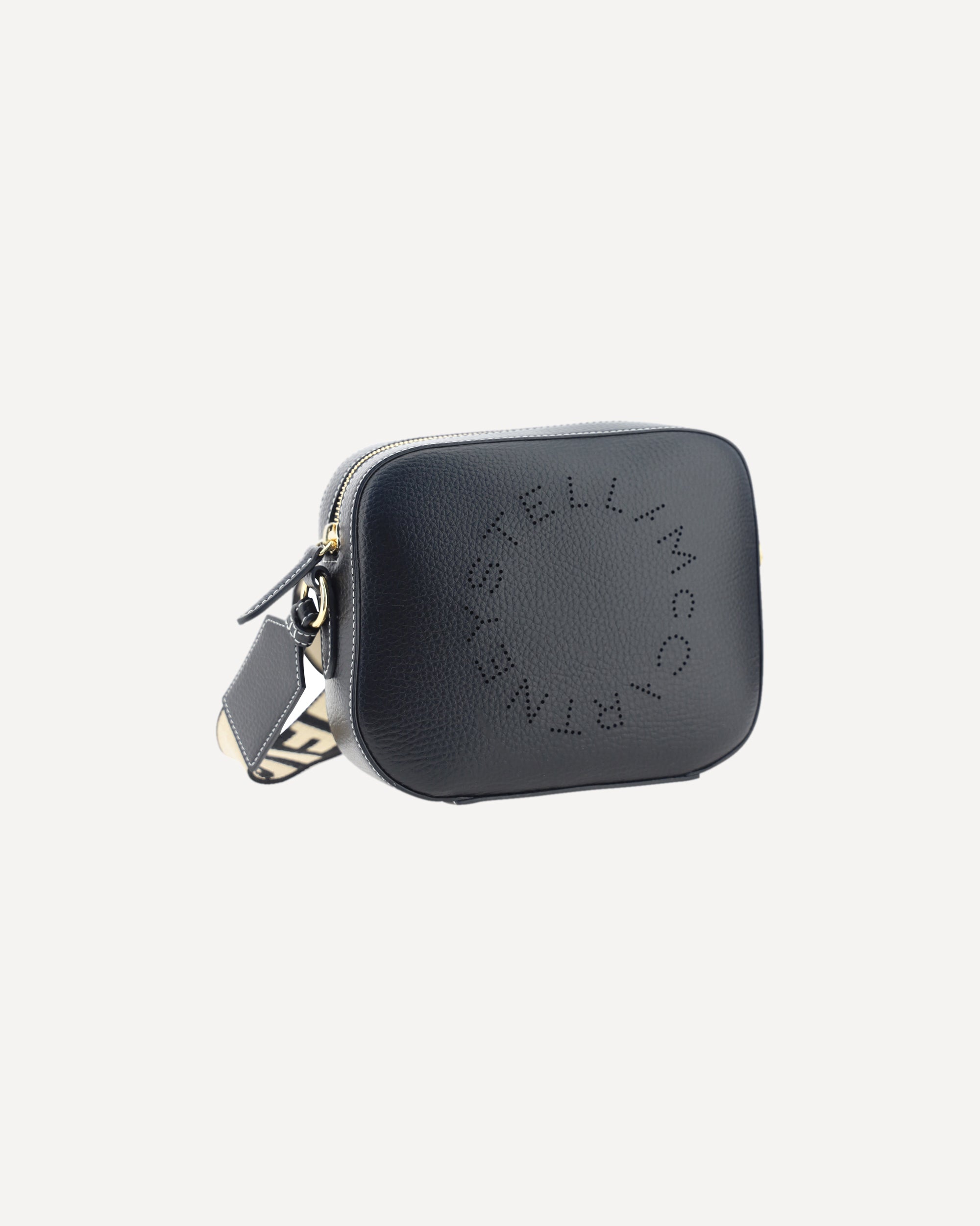 Small Camera Shoulder Bag by Stella McCartney, faux leather design, perforated iconic brand monogram detail on front, top zipper closure, removable and adjustable contrasting logoed webing shoulder strap.