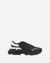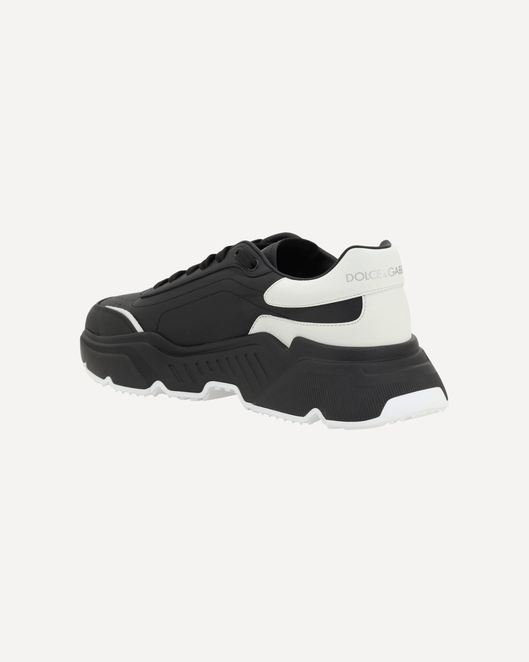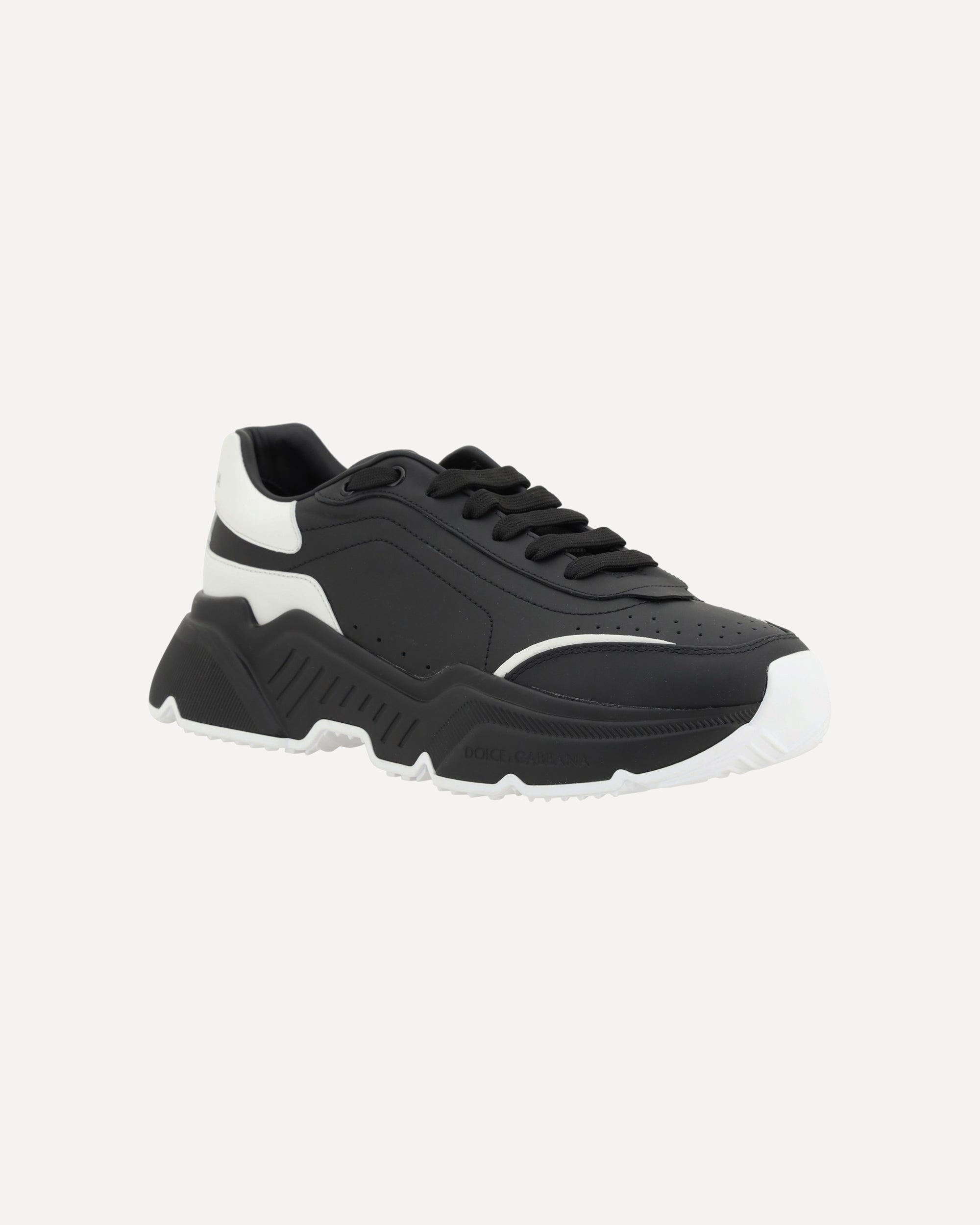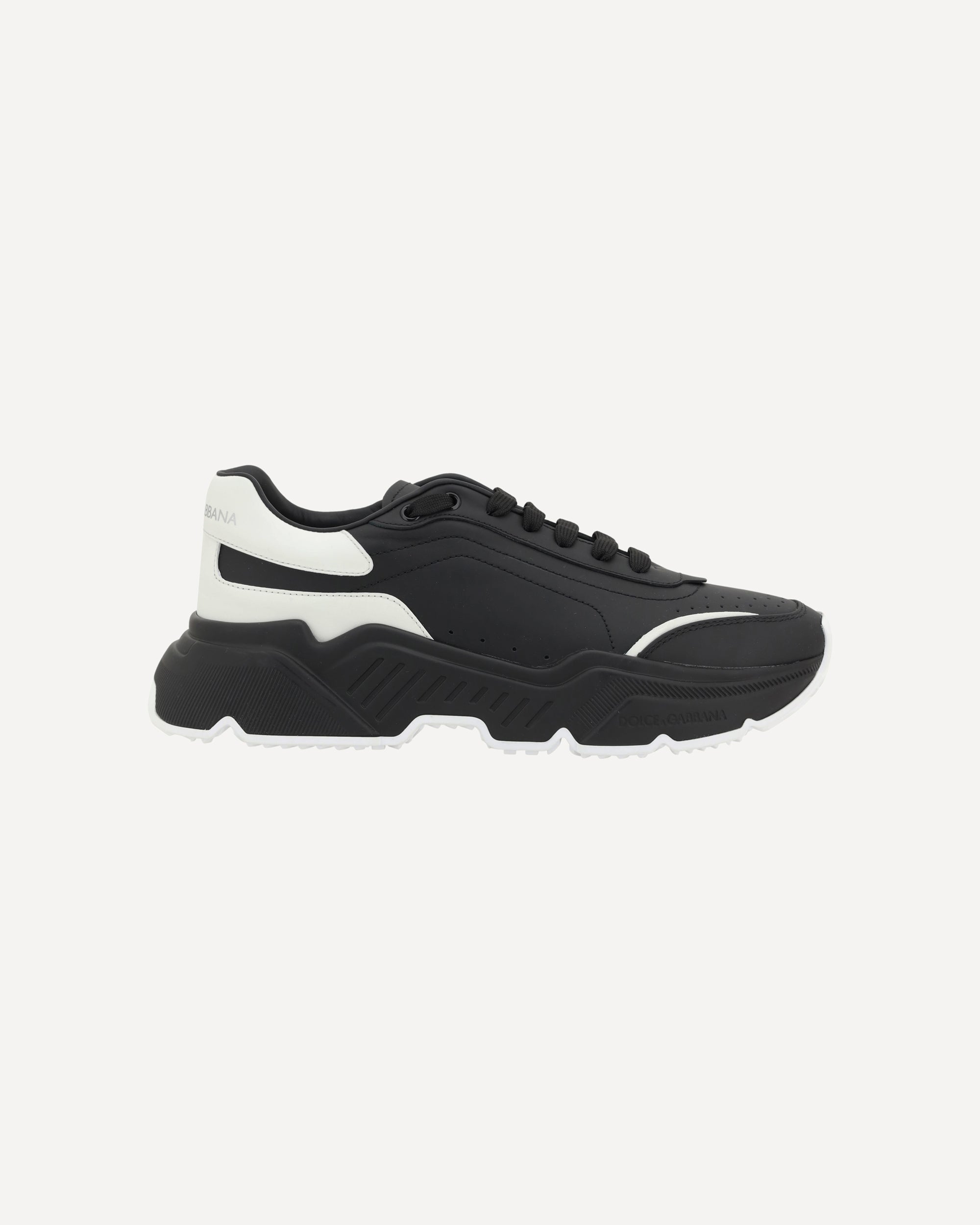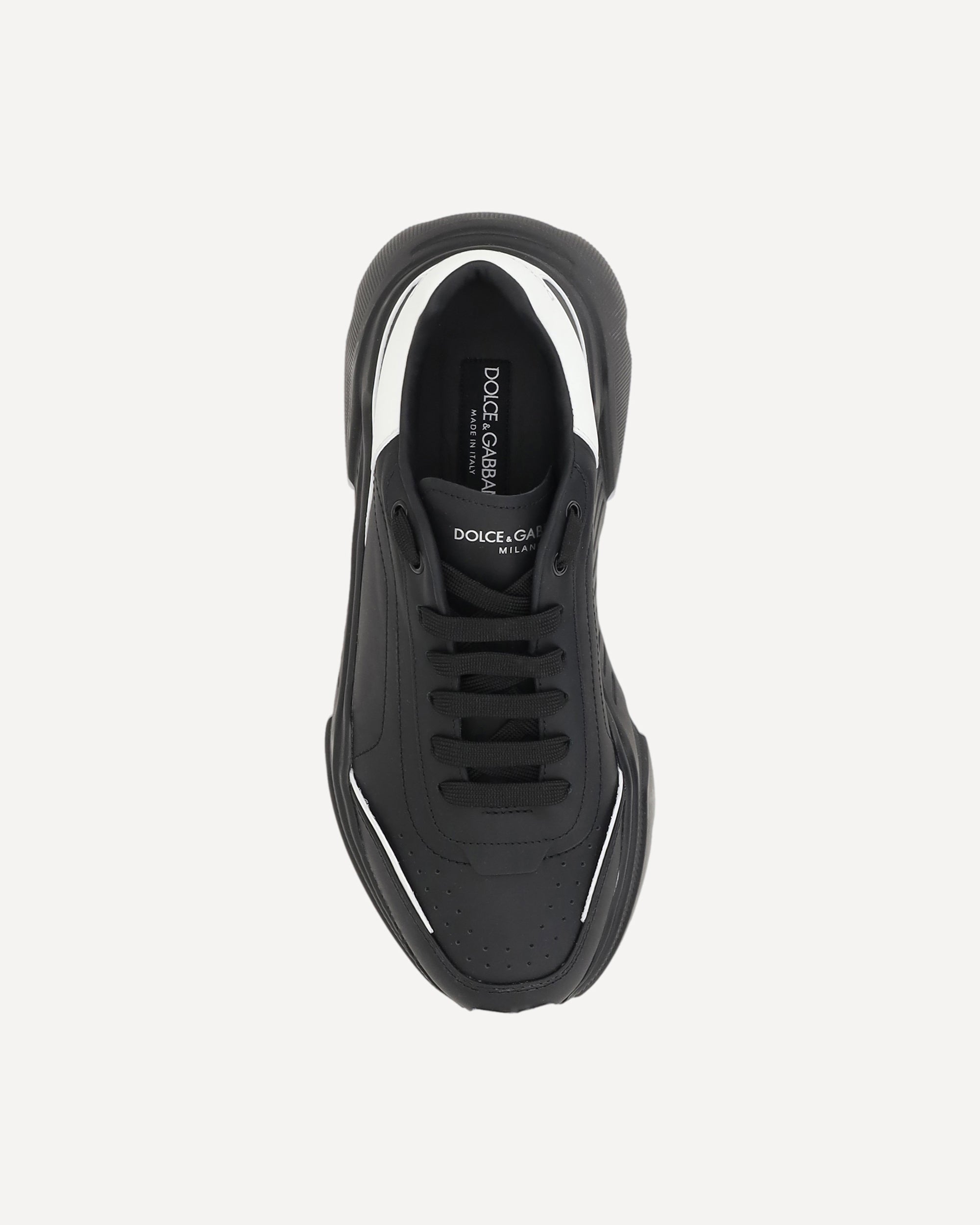 Leather Sneakers by Dolce&Gabbana featuring perforated elongated toe, lace-up closure, textured sole, iconic brand monogram printed in contrast at heel.