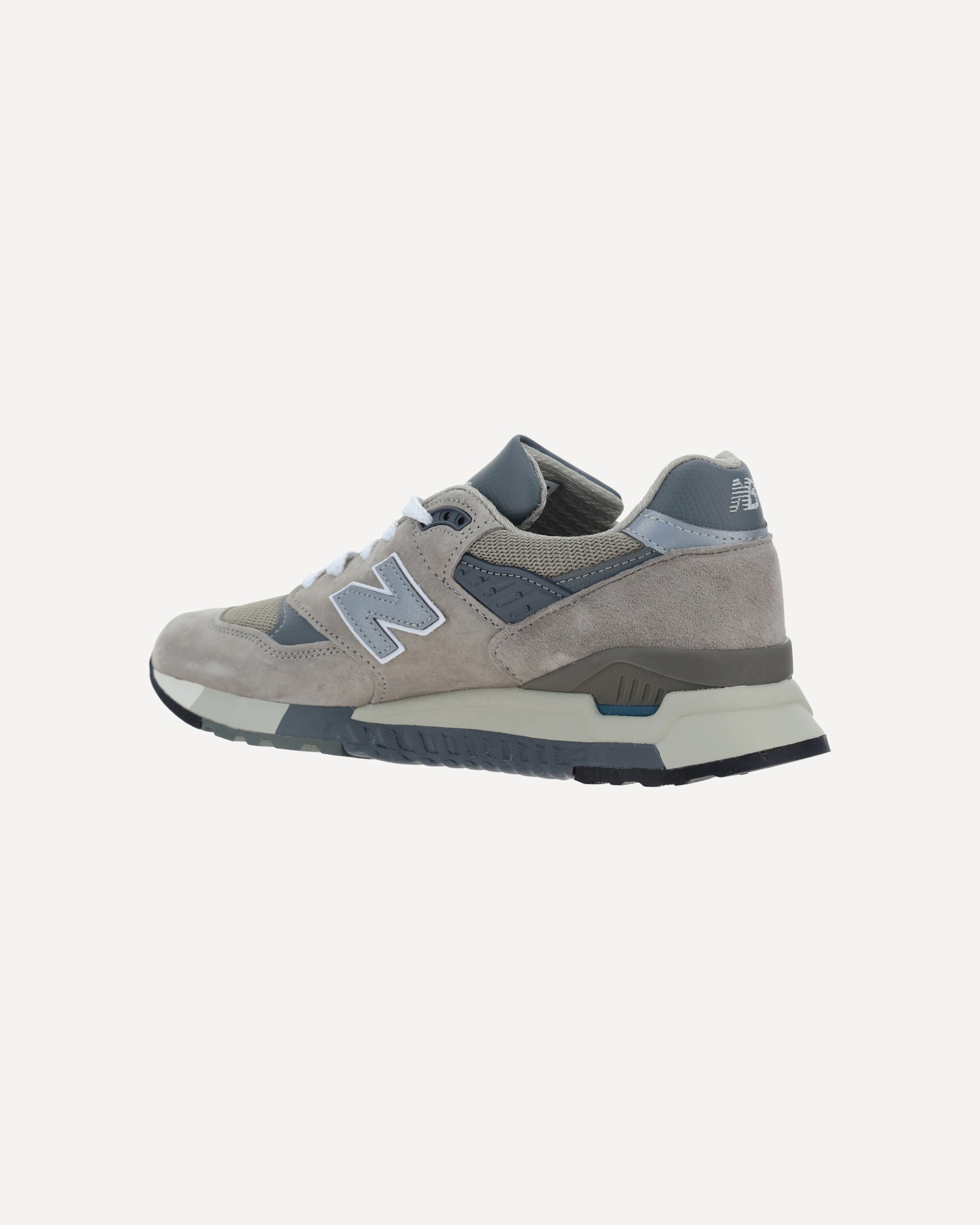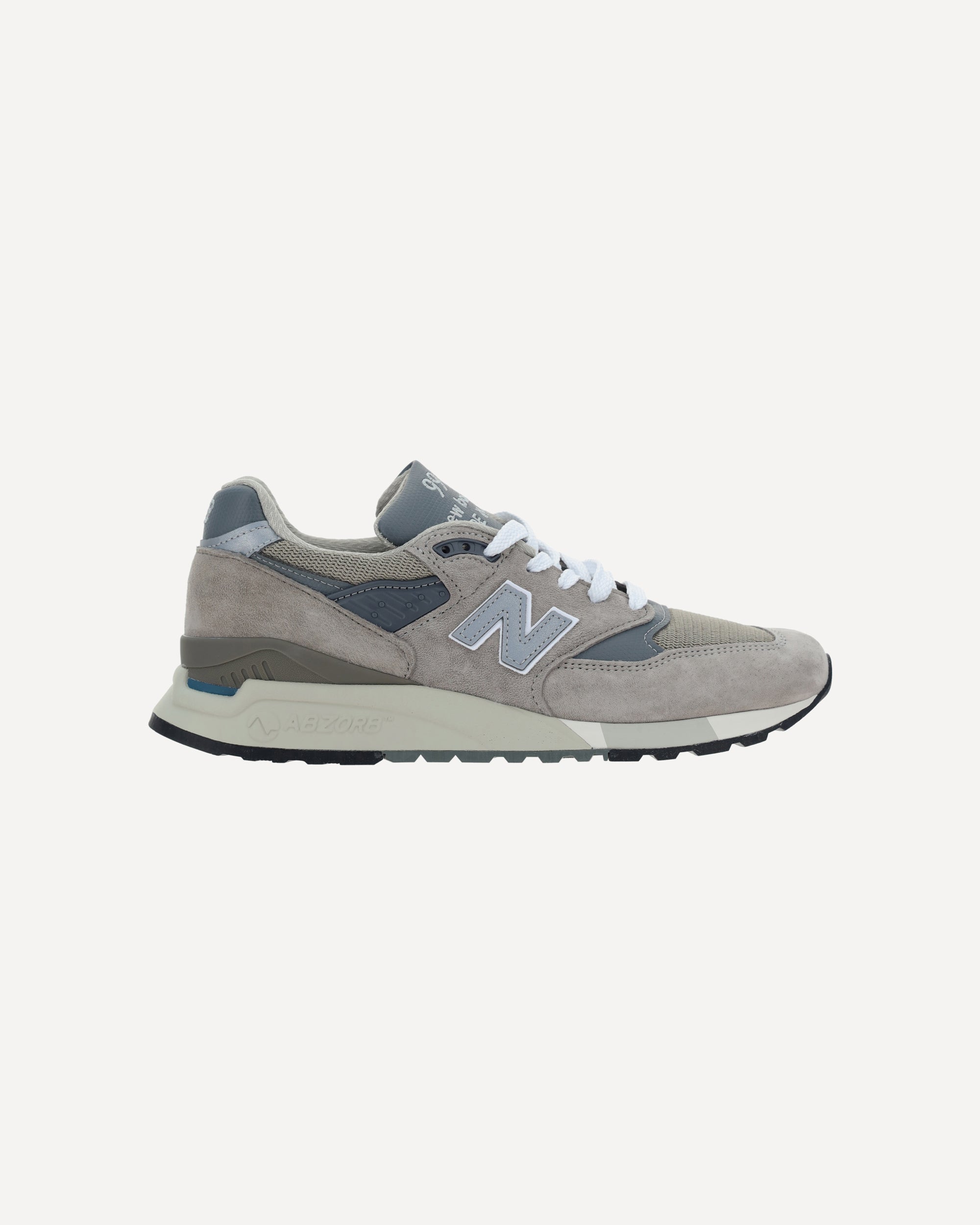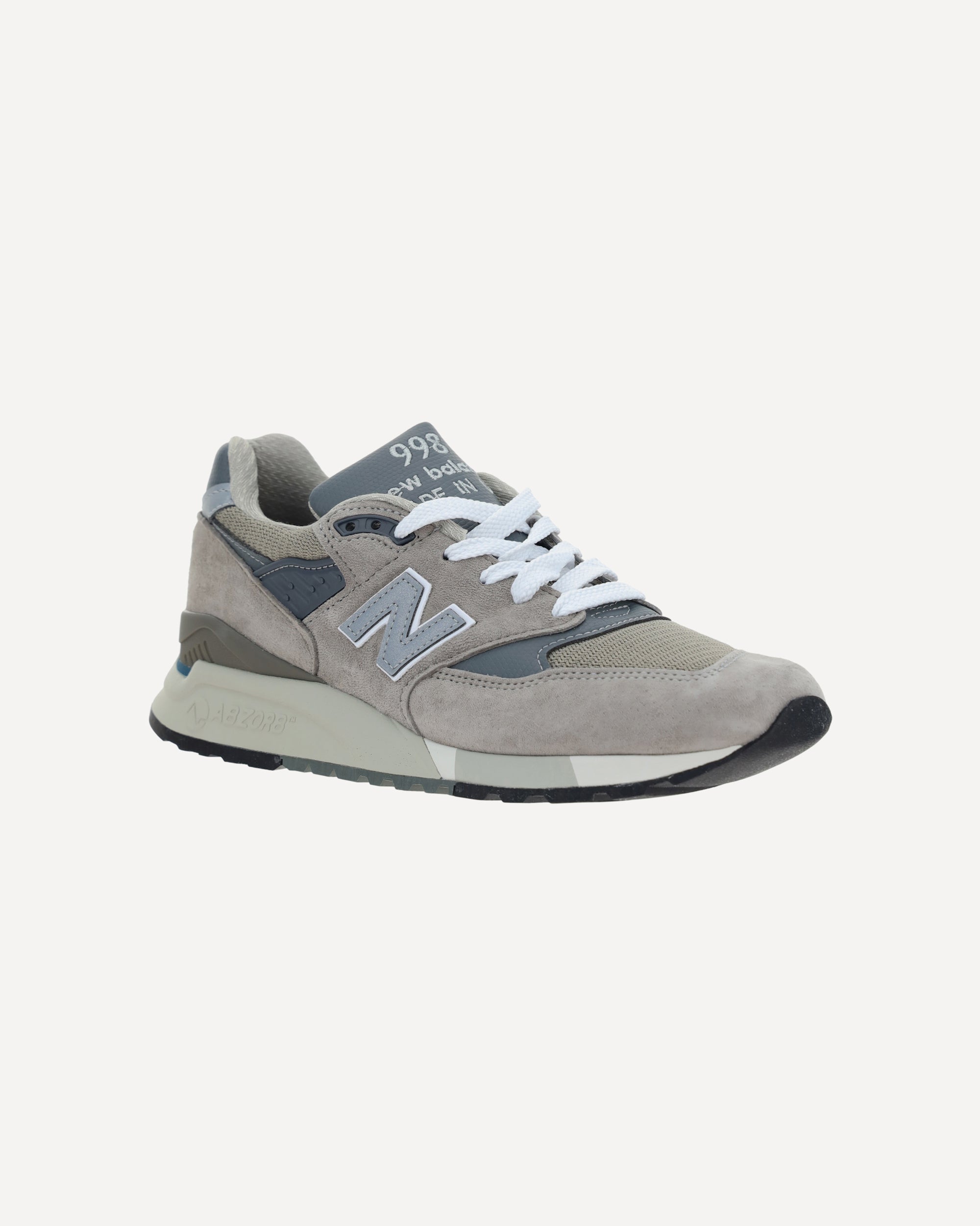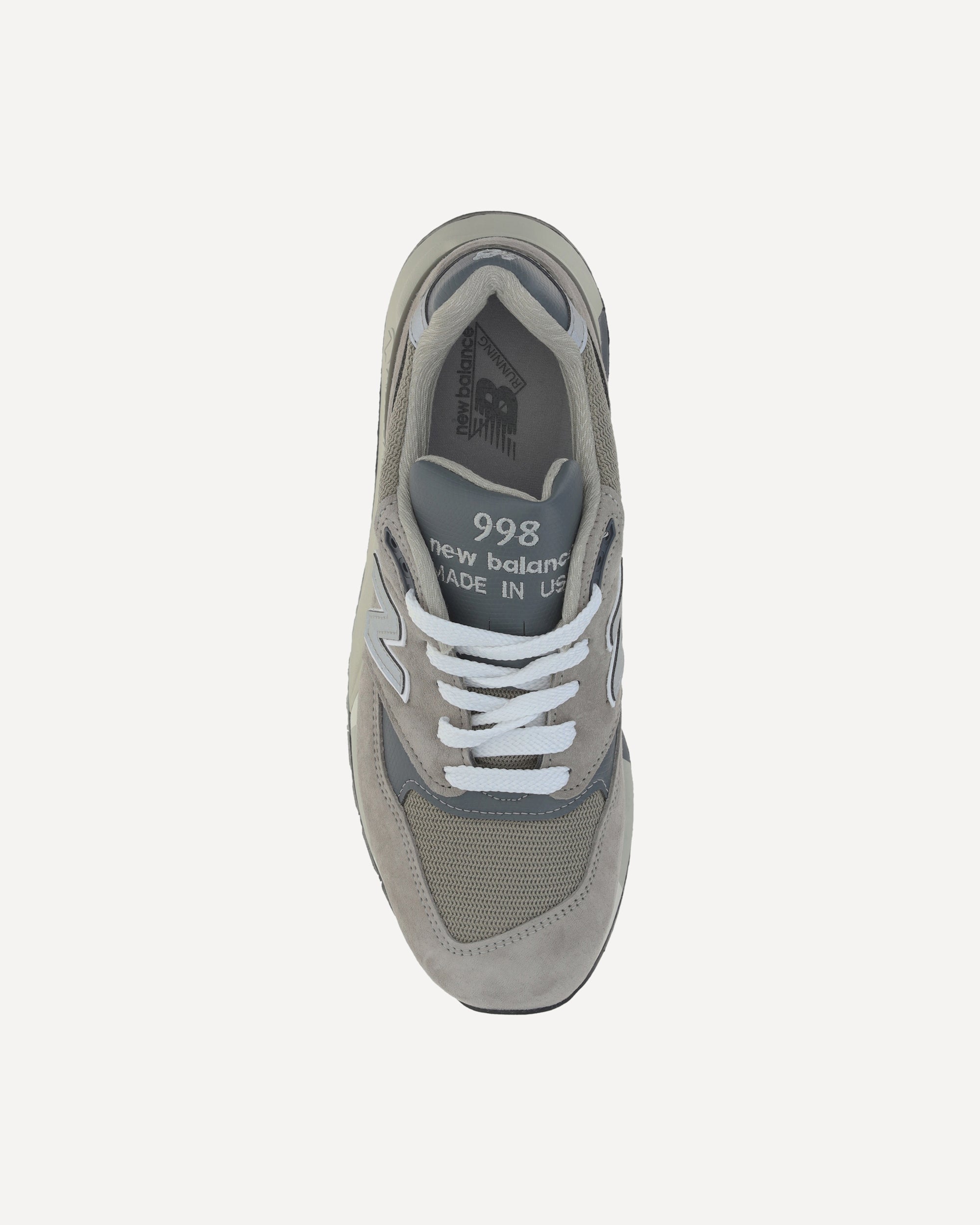 998 Sneakers by New Balance, mesh upper with suede detailing, lace-up front closure, elongated toe on front, raised and reinforced rubber sole, contrasting iconic brand monogram on side panels, contrasting logoed front tab.