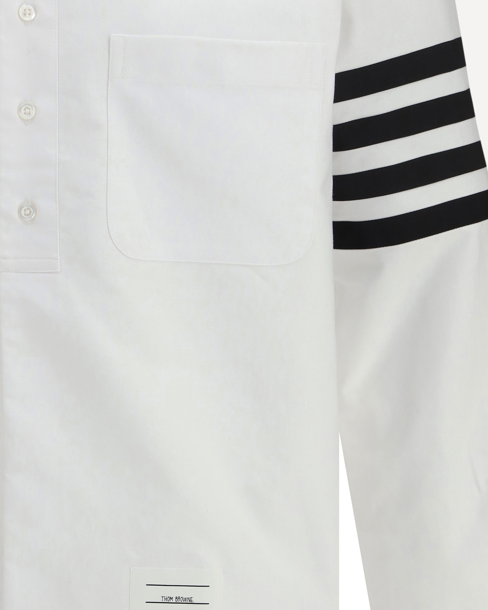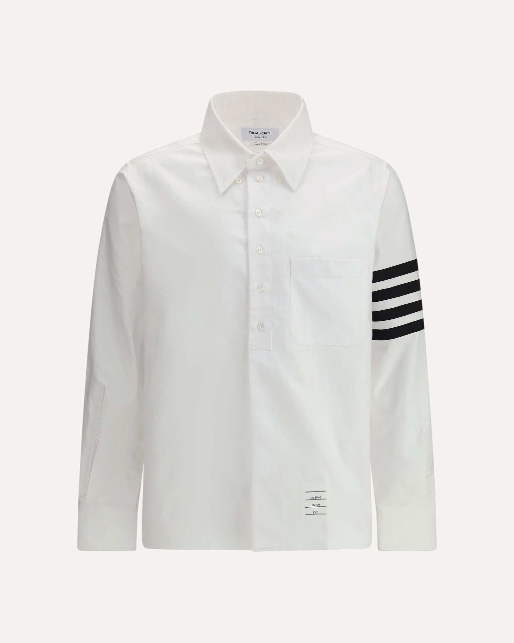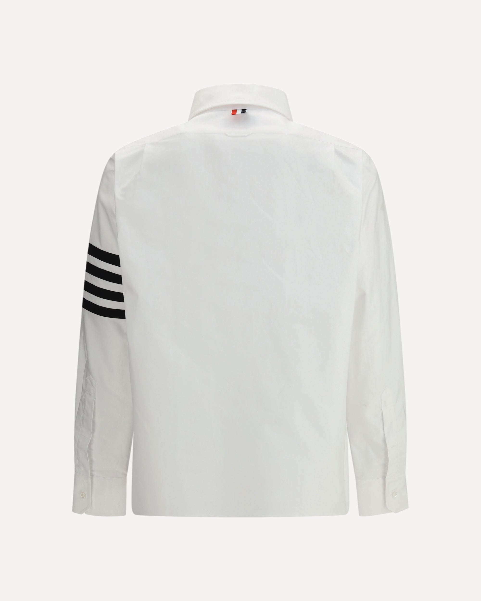 The cotton Shirt by Thom Browne is a garment that blends classic elegance with distinctive details. With a classic collar and front button closure, it features a clean, refined design. The iconic horizontal bands on one sleeve add a touch of originality, while the logo patch on the front and the patch pocket complete the look with a distinctive brand detail. Perfect for those seeking a sophisticated style but with a modern accent.
