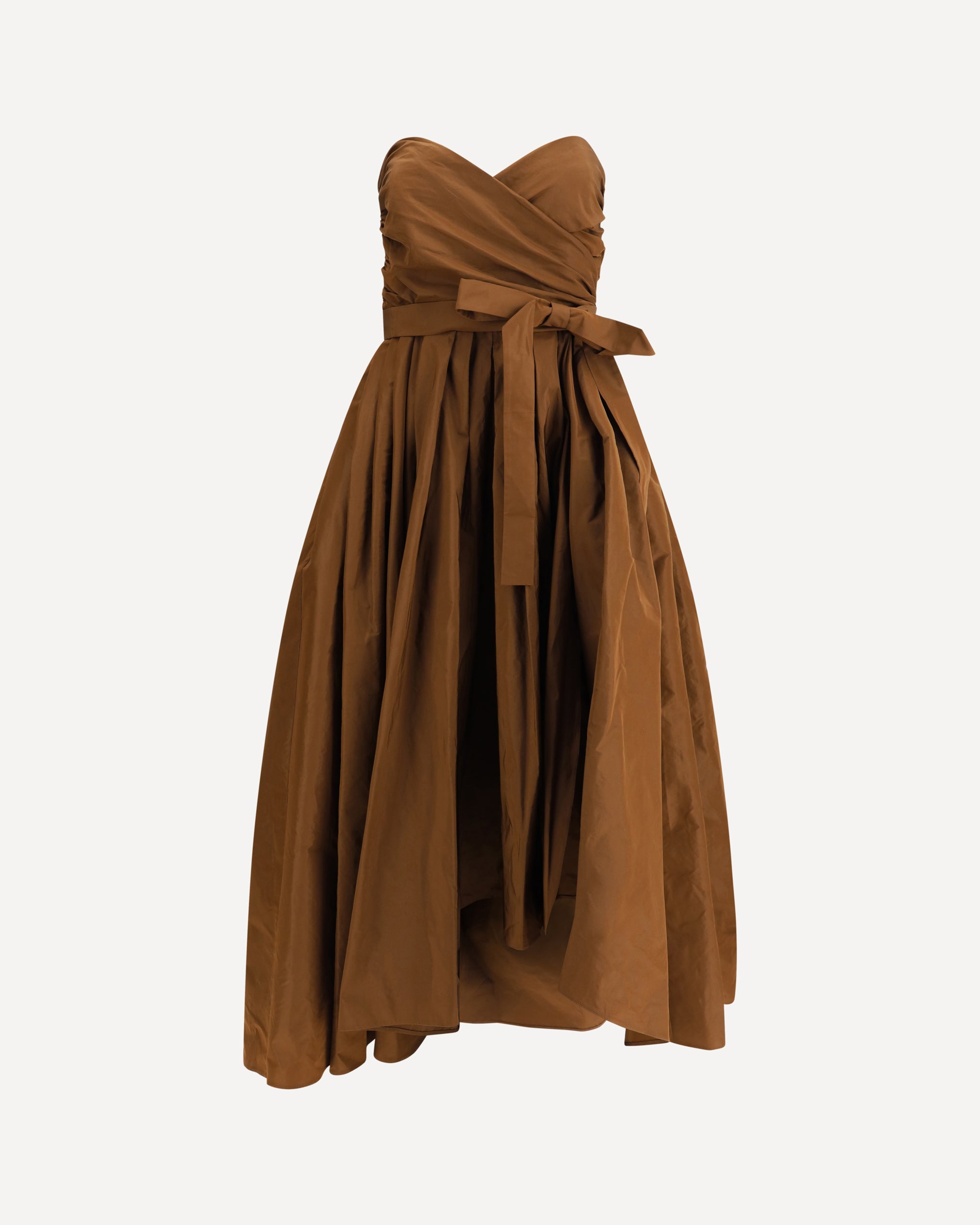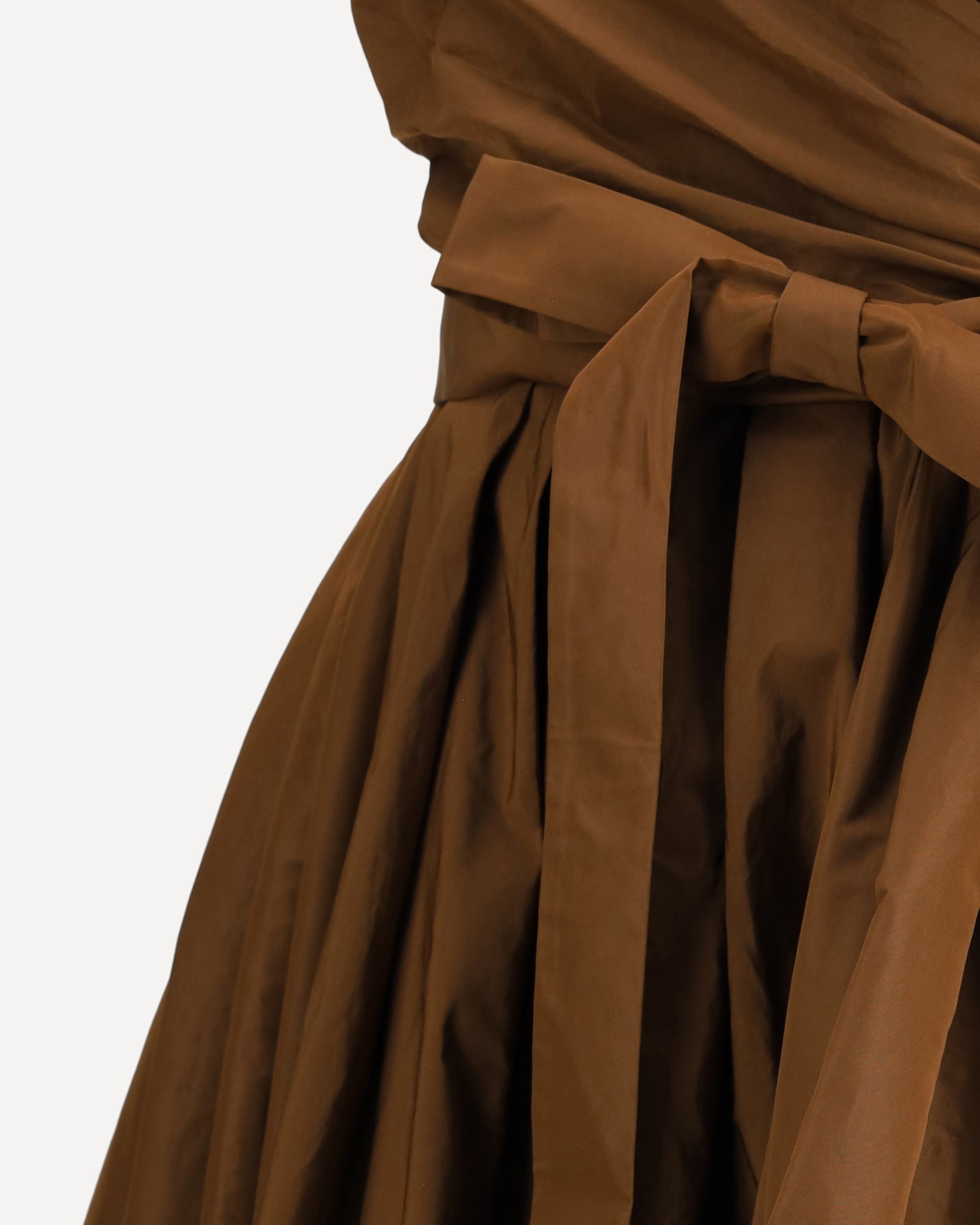 The Pinko strapless long dress has an elegant and feminine design. The side zip fastening ensures a precise fit, while the asymmetrical hem, shorter at the front, adds a touch of dynamism to the look. The adjustable bow on the front allows you to personalize the look of the dress, while the flared model slides delicately on the figure, creating a fluid and sophisticated movement.