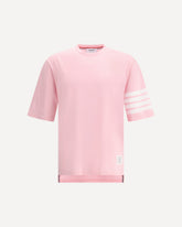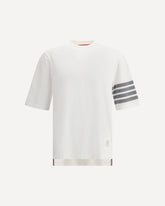 The Striped T-Shirt by Thom Browne features a classic and elegant design with a distinctive striped detail. Complemented by a logo plaque, a ribbed crew neck and a straight hem, this T-shirt combines simplicity and sophistication, making it a versatile garment for any occasion.