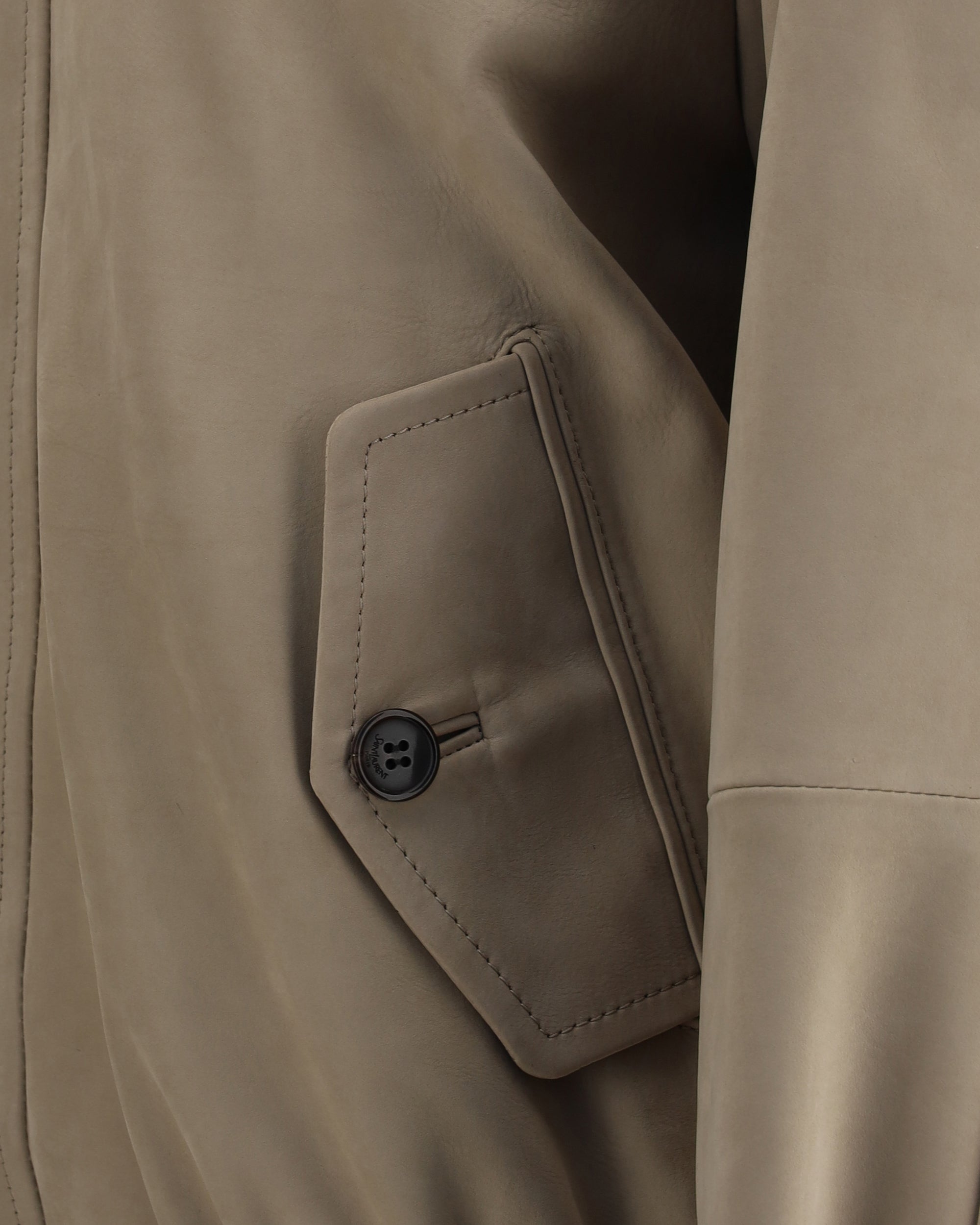 Saint Laurent's Suede Bomber Jacket is an iconic piece that blends the brand's rebellious spirit with timeless elegance. Crafted from soft suede, it features a classic collar that echoes the style of vintage jackets, while the front zipper and two-button closure adds a functional and gritty touch. The two side welt pockets with flap and buttons are practical, well-finished details that enhance the design with understated sophistication. The elasticized hem ensures a snug and comfortable fit, emphasizing the garment's sporty and modern cut.