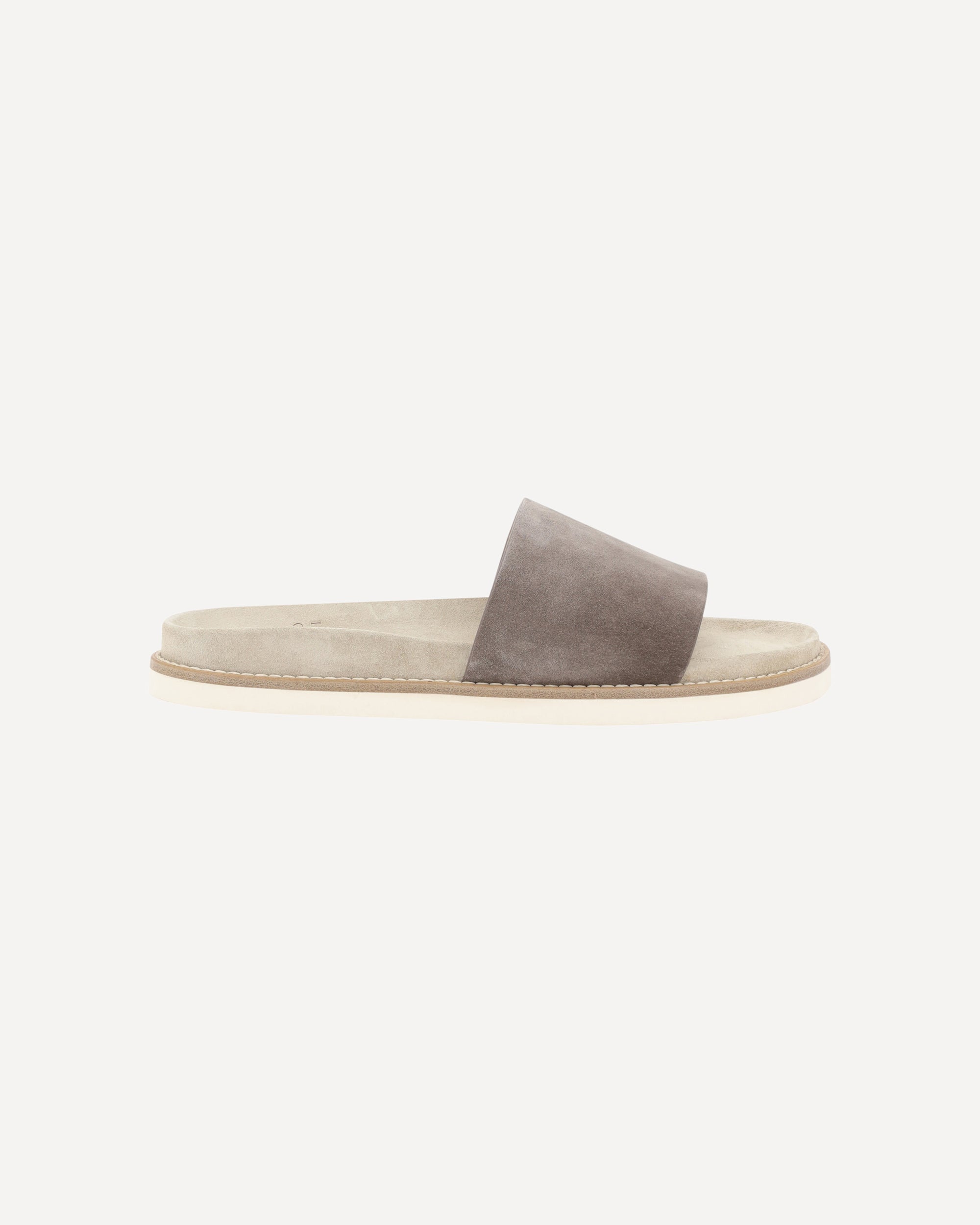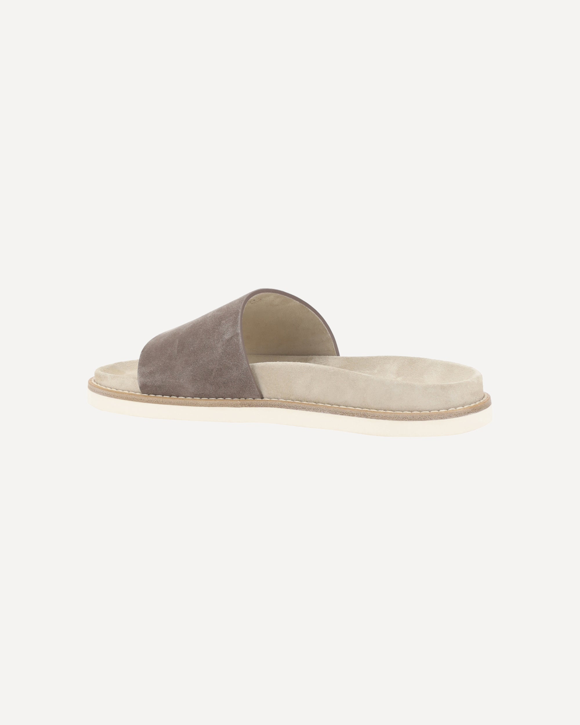 Brunello Cucinelli's Slippers combine elegance and comfort with a soft suede design. The contrasting flat sole adds a modern and versatile touch, making them perfect for a casual yet sophisticated look. An ideal accessory for those looking for refined style without sacrificing practicality.