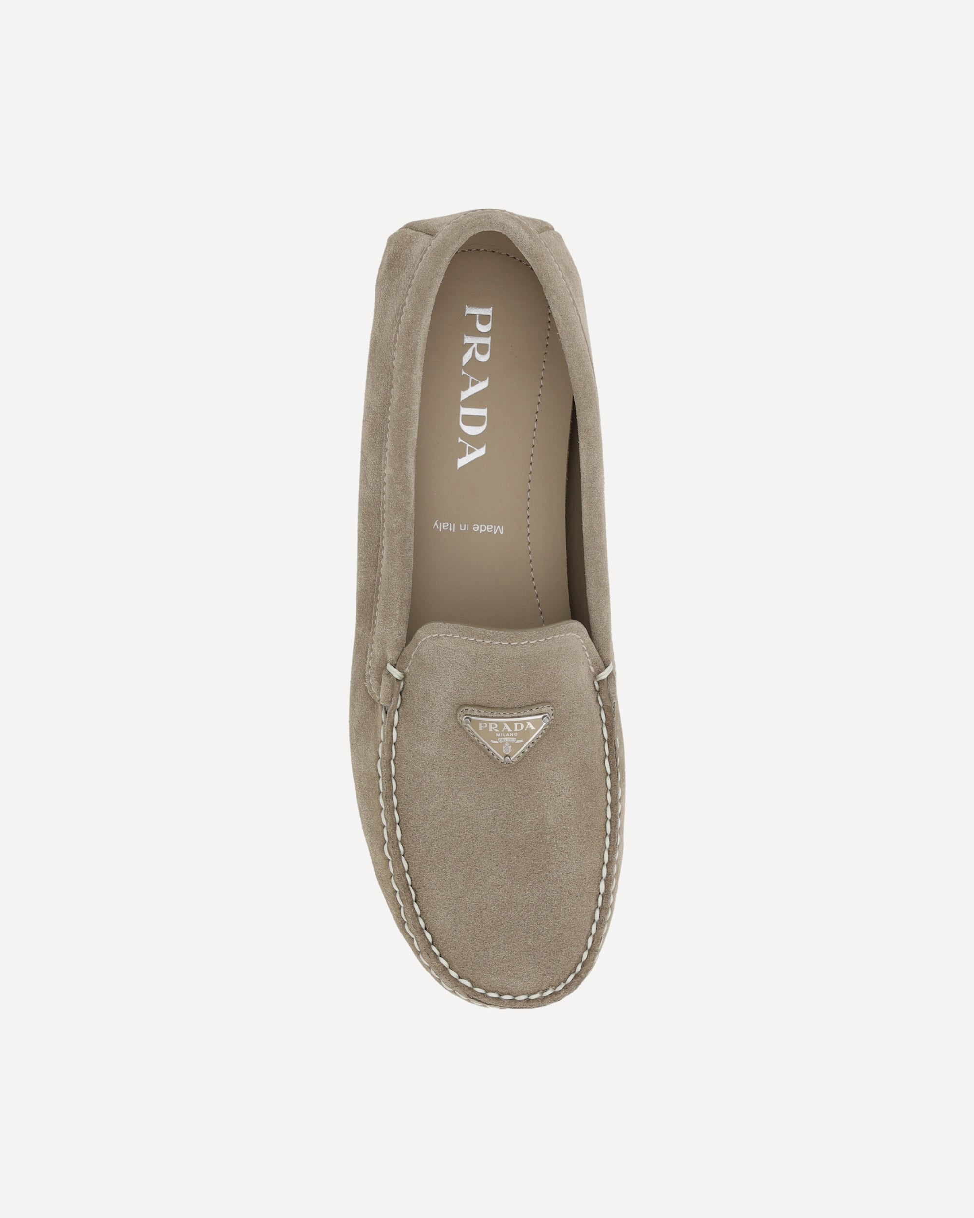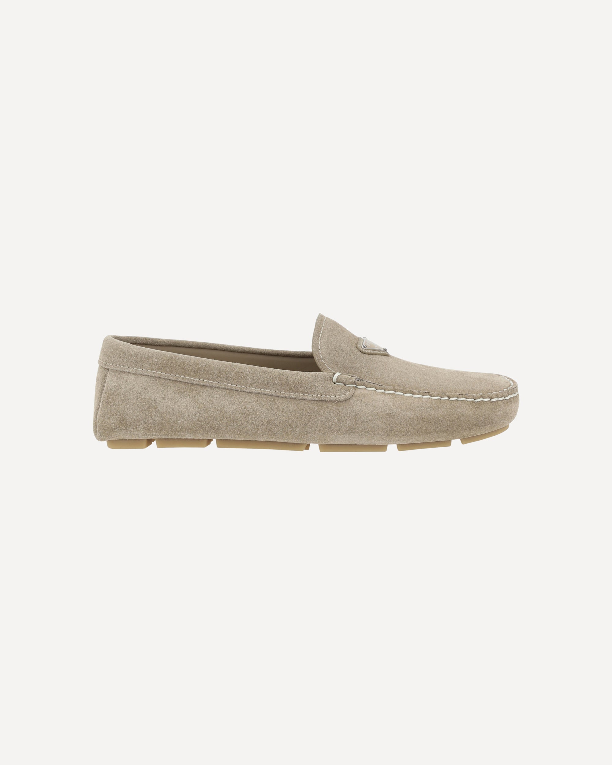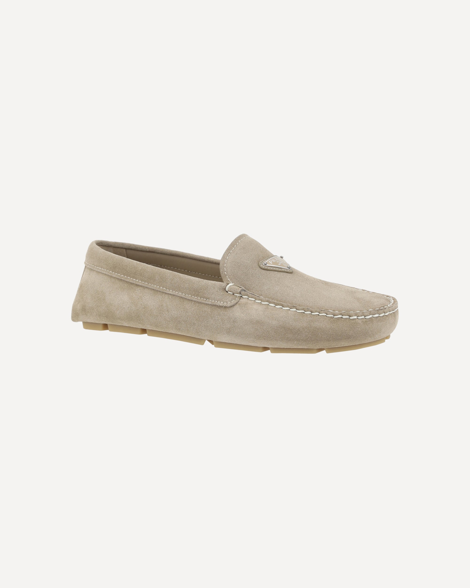 Prada's suede Loafers feature a round toe for comfort and a sleek design. The iconic logoed triangular plaque is applied to the front, adding a distinctive brand detail. The flat rubber sole ensures a stable and durable walk, while the logoed insole confirms the brand's authenticity, completing the sophisticated and versatile look of these loafers.