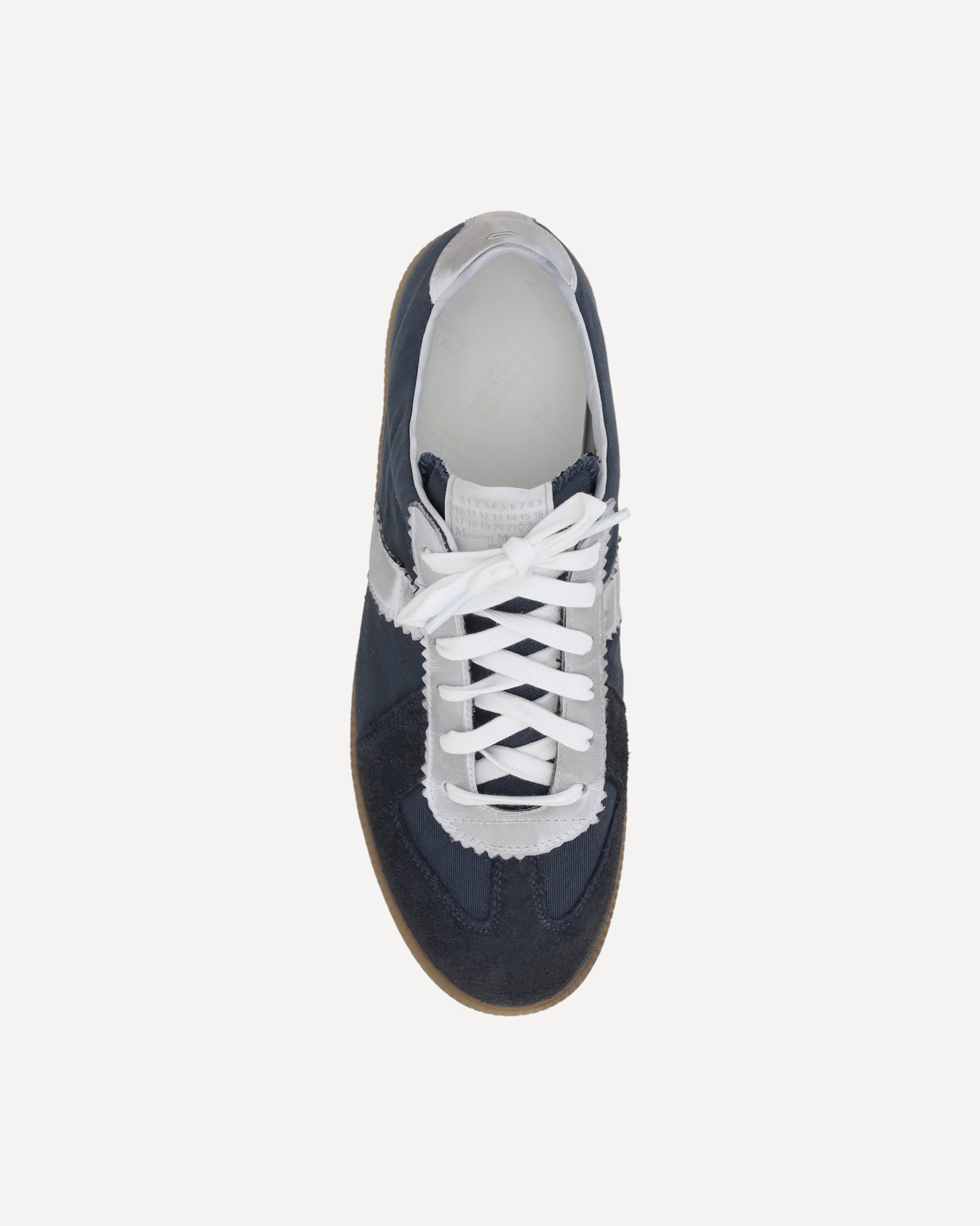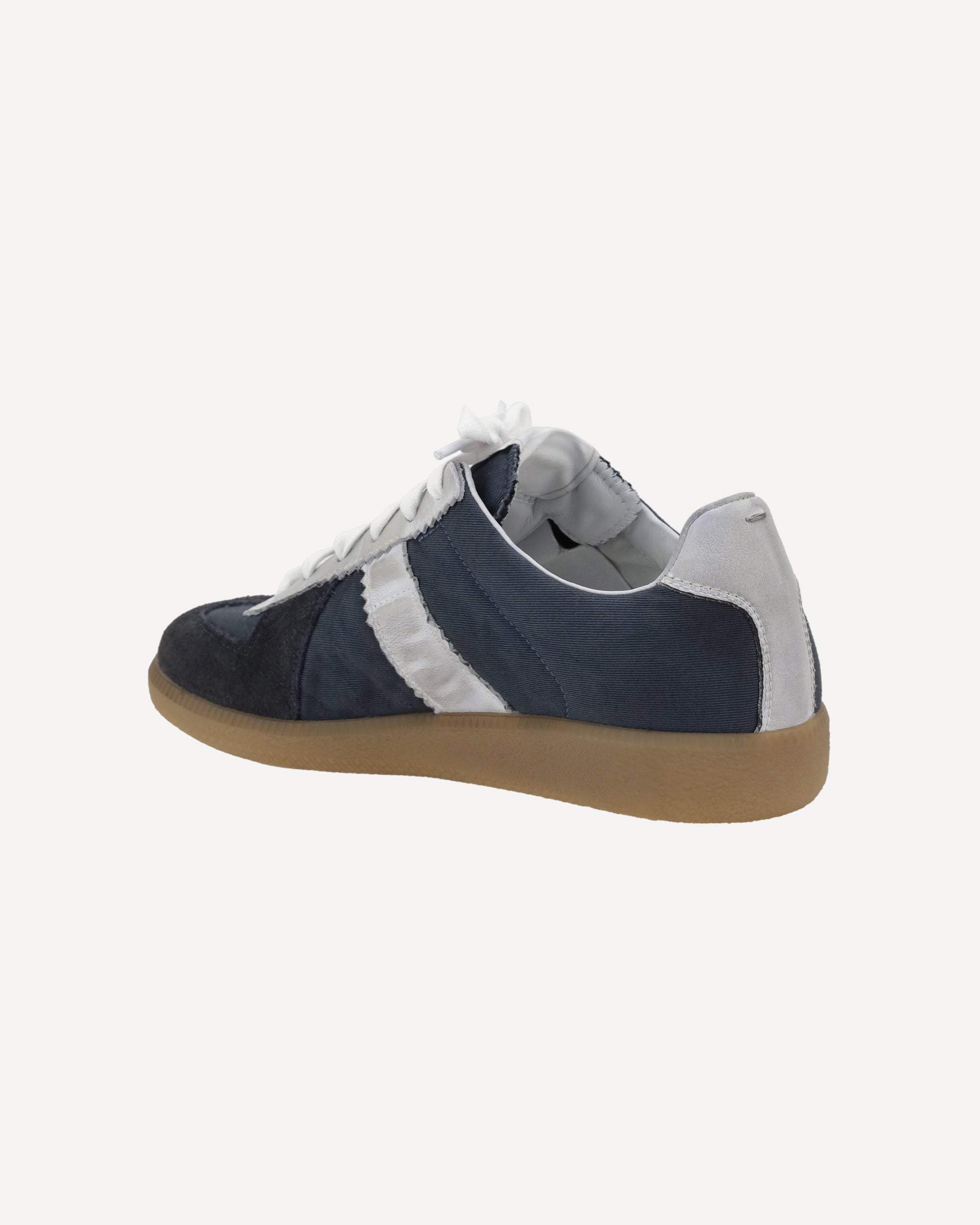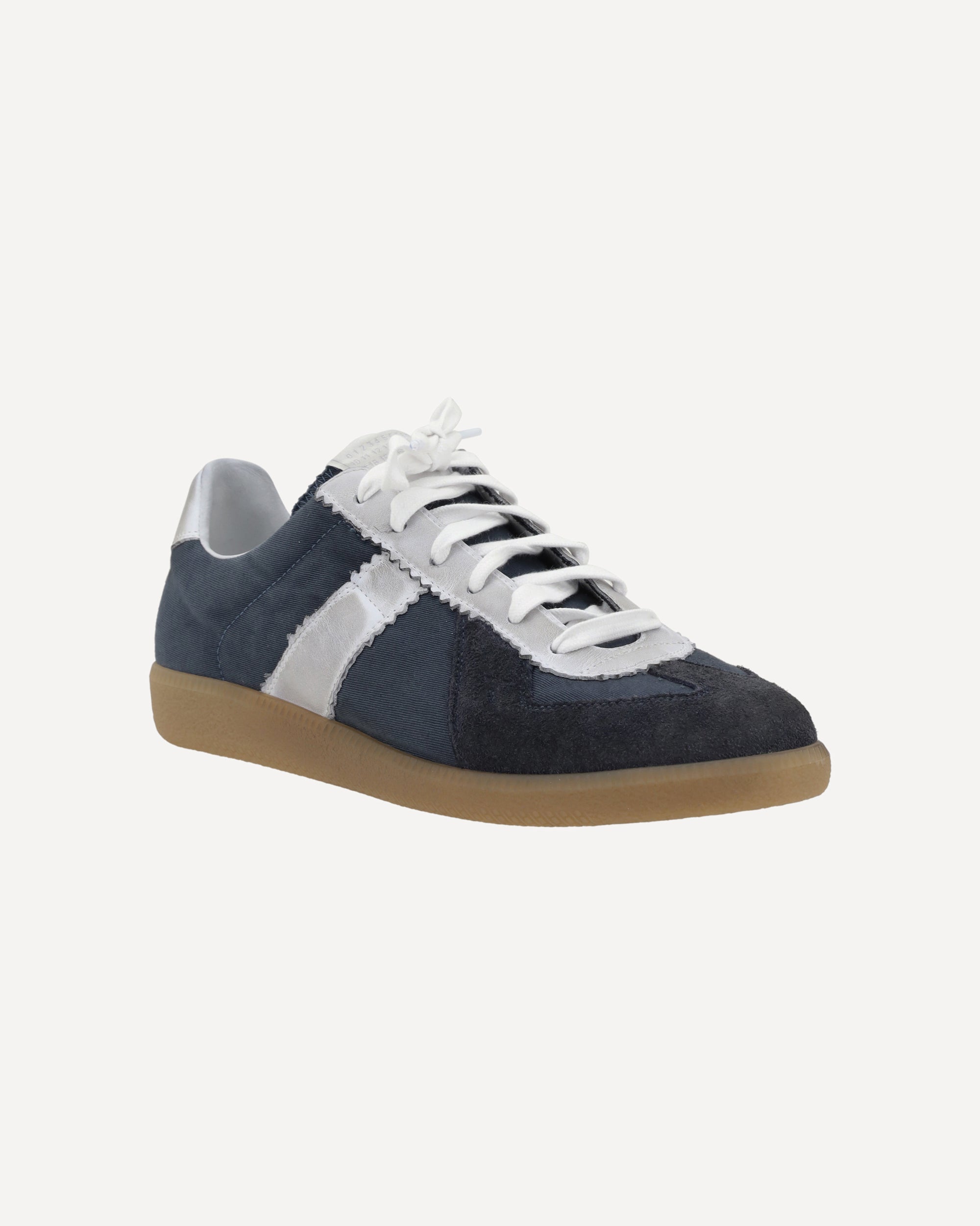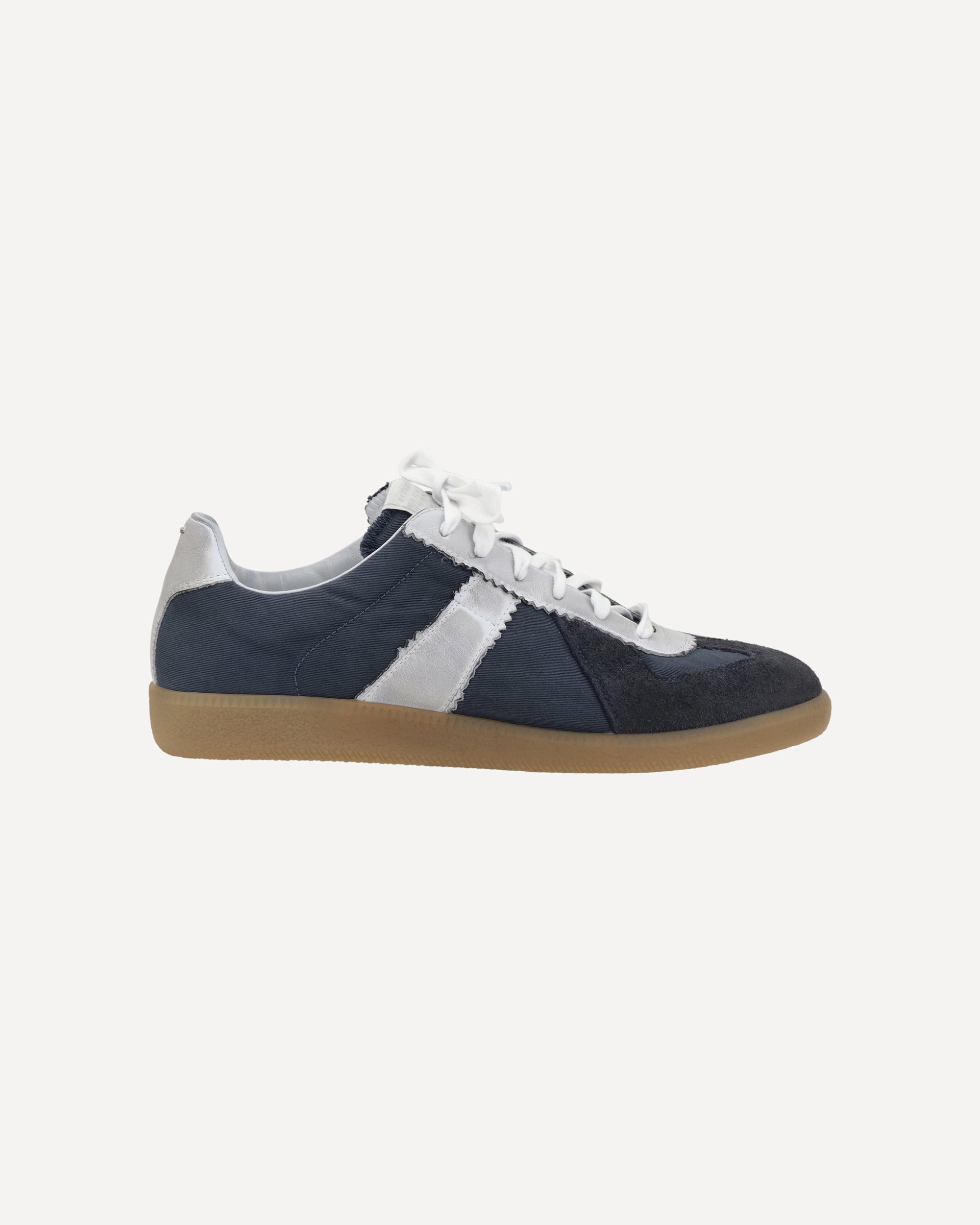 The Margiela Sneakers feature suede details on the round toe, adding a touch of elegance and texture to the design. The front lace-up closure allows for an adjustable fit, while the contrasting slanted band on the side panels provides a distinctive detail. The branded insole guarantees quality and comfort, while the flat sole ensures stability and practicality. A pair of modern and versatile sneakers, perfect for a casual yet sophisticated look.