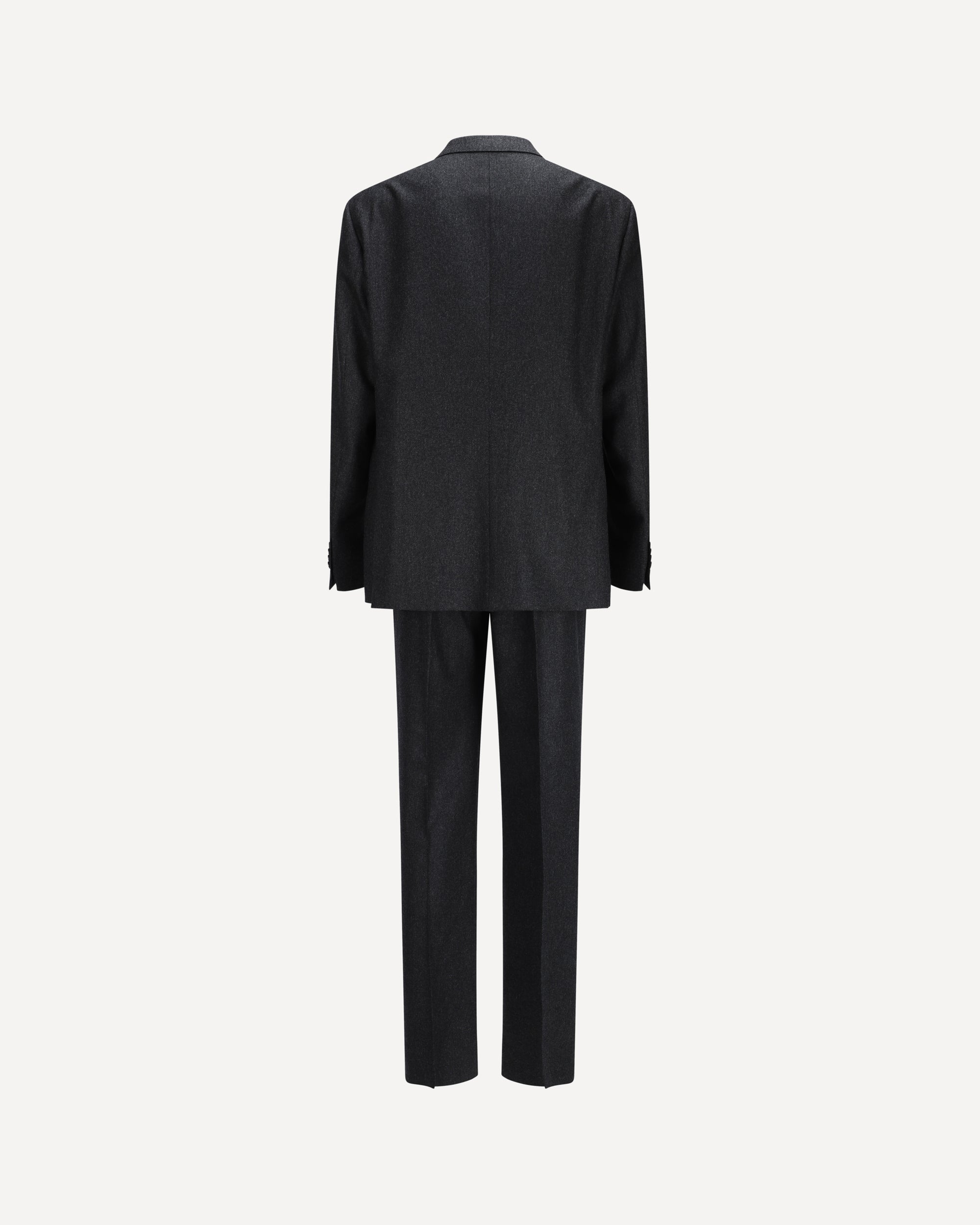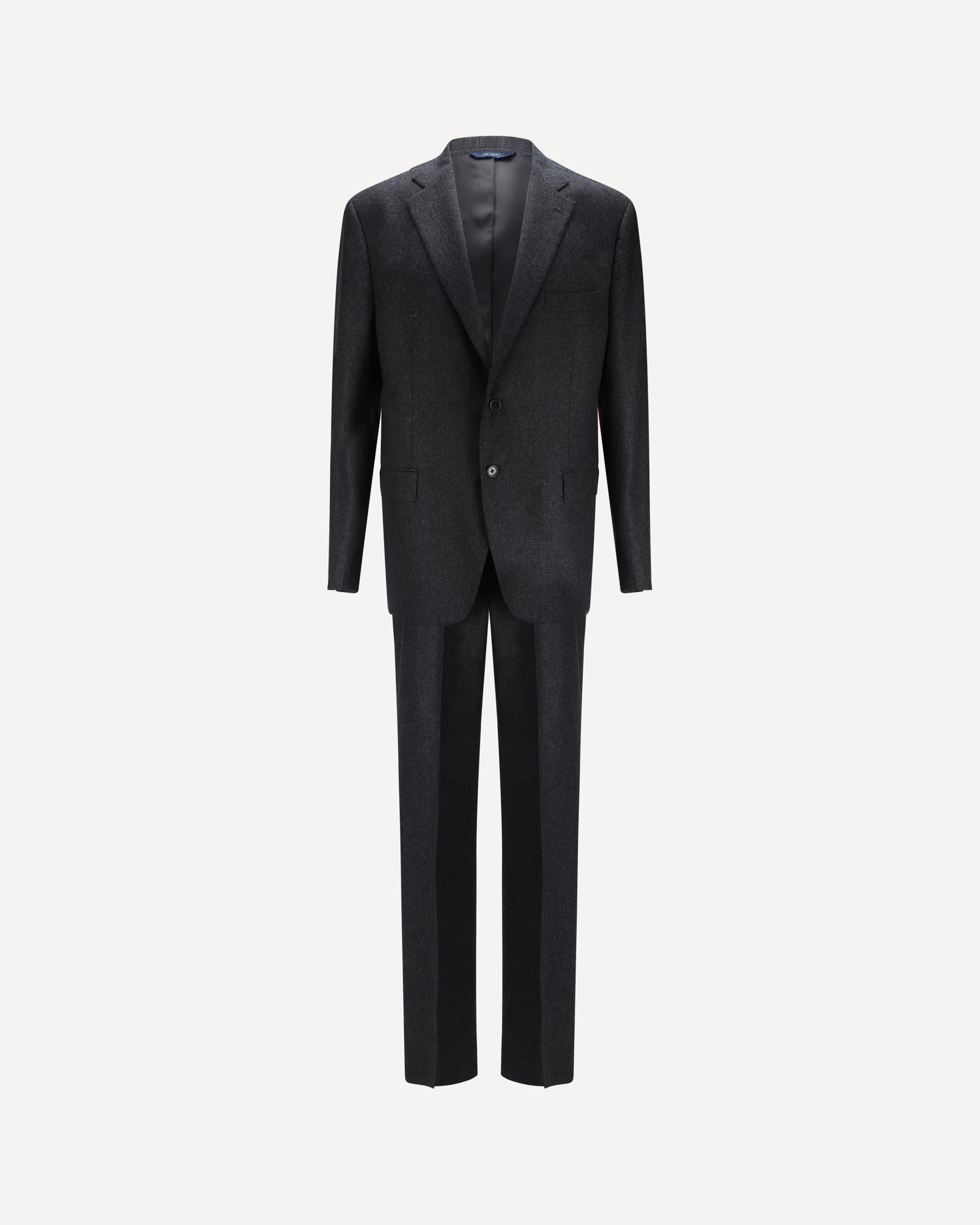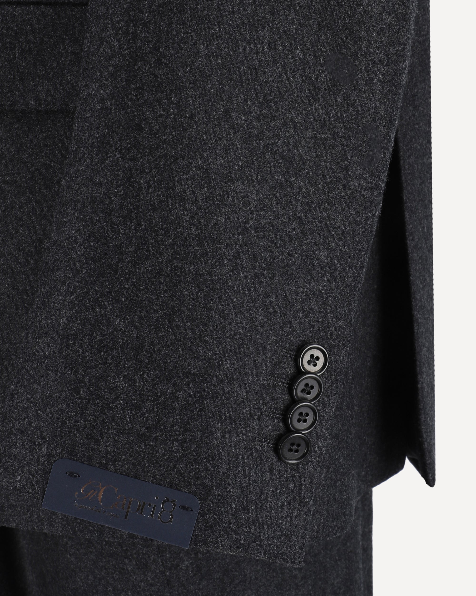 Suit in Virgin Wool by Gi Capri, consisting of jacket and pants, mélange pattern. Wool blazer jacket, front button closure, two welt pockets with patch flap on front, one slit pocket on front, classic lapels. Classic wool pants, front zipper and button closure, two side slash pockets, two welt pockets on back, belt loops waistband.