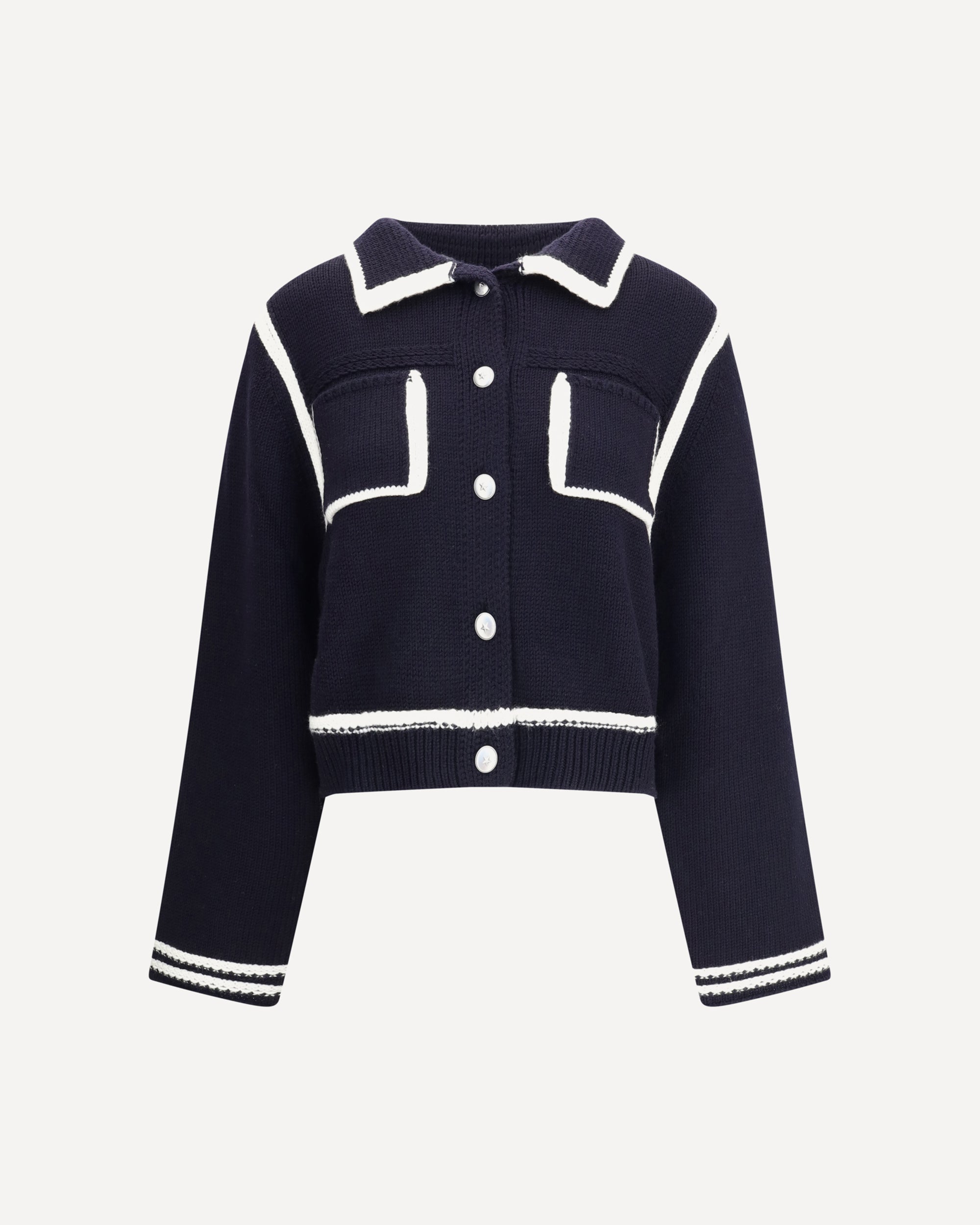 The Pinko Cardigan is a garment with a retro and refined taste. Defined by contrasting profiles, it is completed by a classic collar, front closure with buttons, ribbed hem and cuffs. The two patch pockets on the front add a practical and decorative touch.