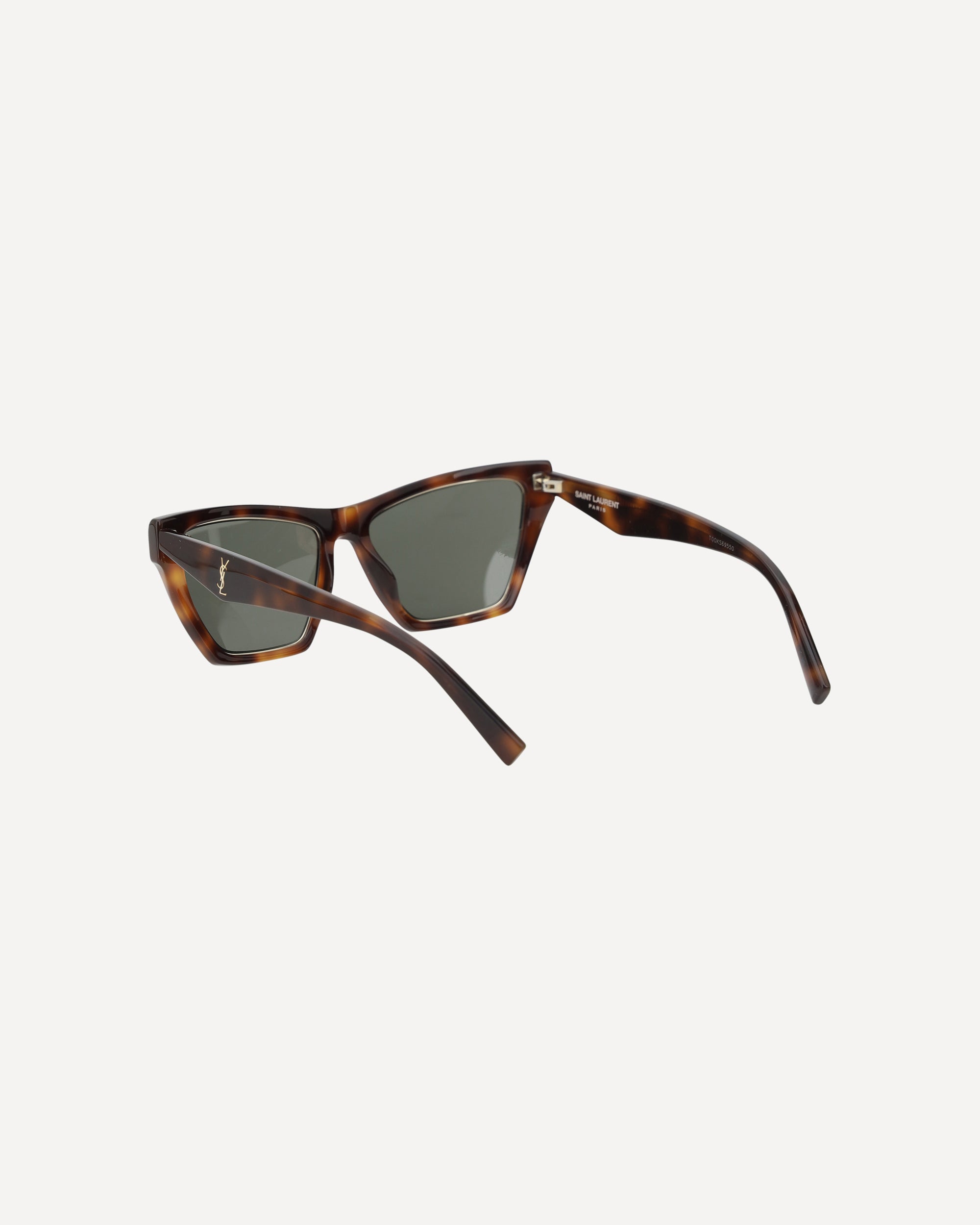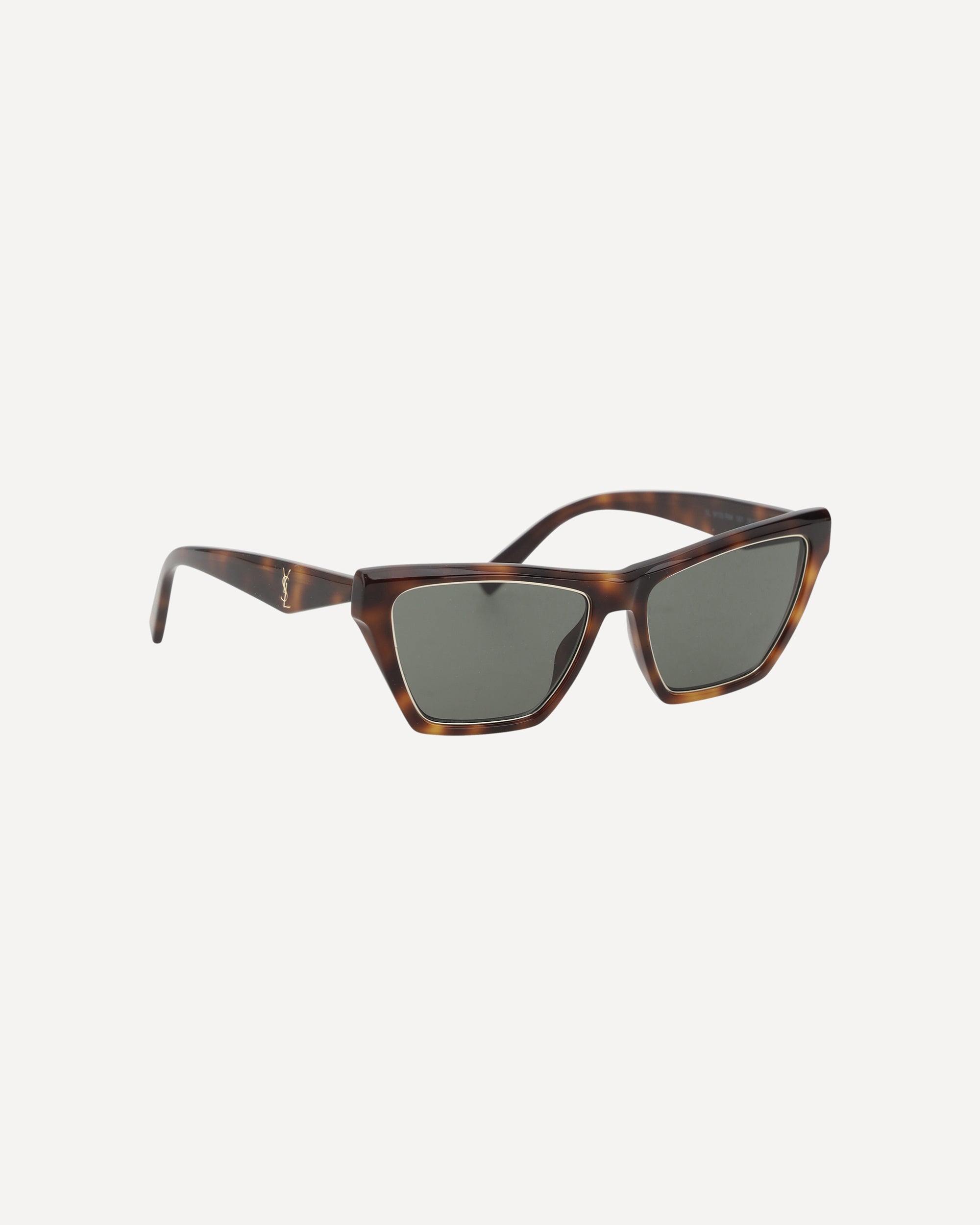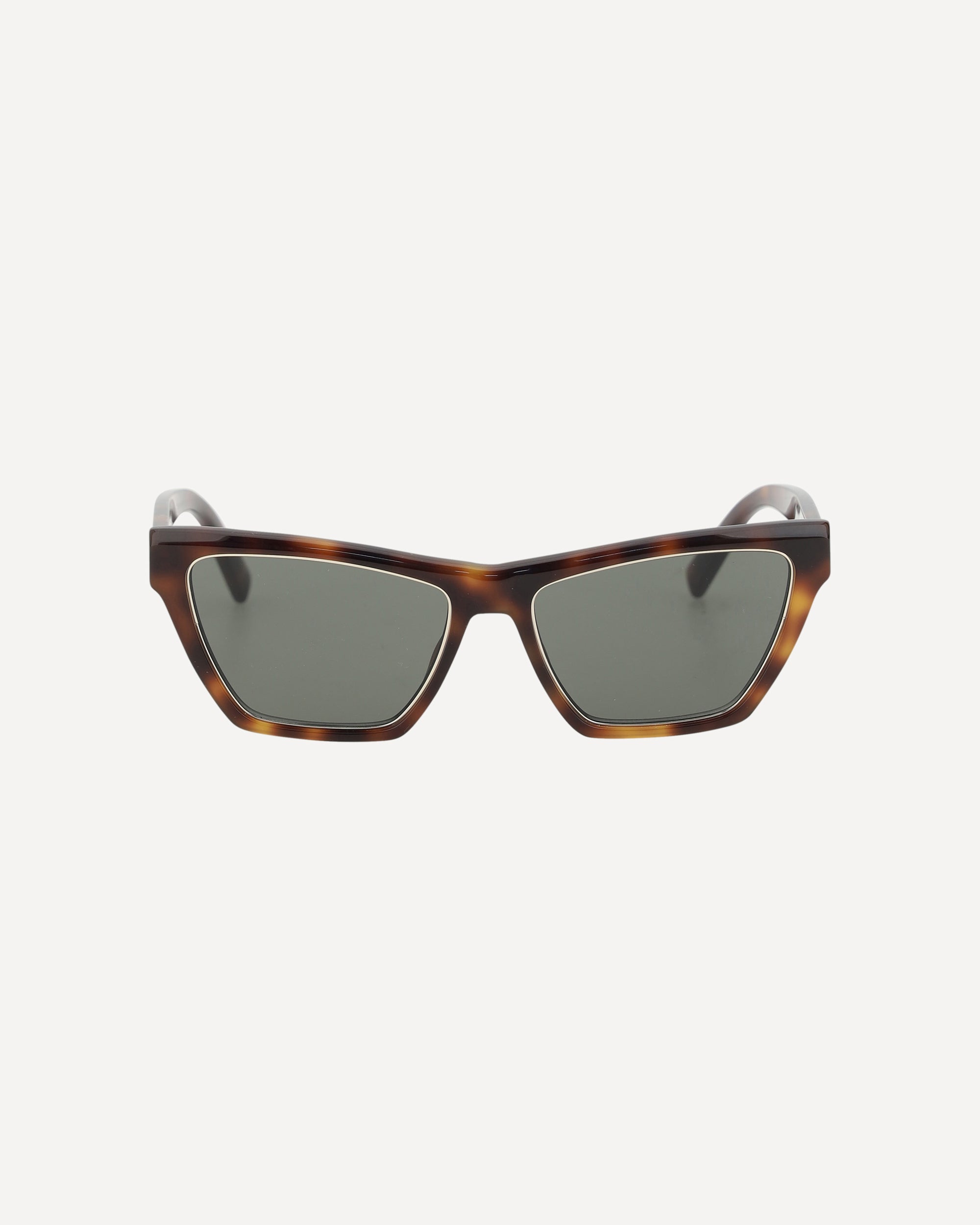 The Saint Laurent Sunglasses feature a square and rectangular design, characterized by a tortoiseshell frame that adds a touch of sophistication and timeless class. The combination of strong lines and the tortoiseshell pattern gives these glasses a sophisticated look, ideal for those seeking an elegant style but with personality. The iconic logo of the brand, applied on the side, offers a distinctive detail that expresses the authenticity and luxury of the brand.