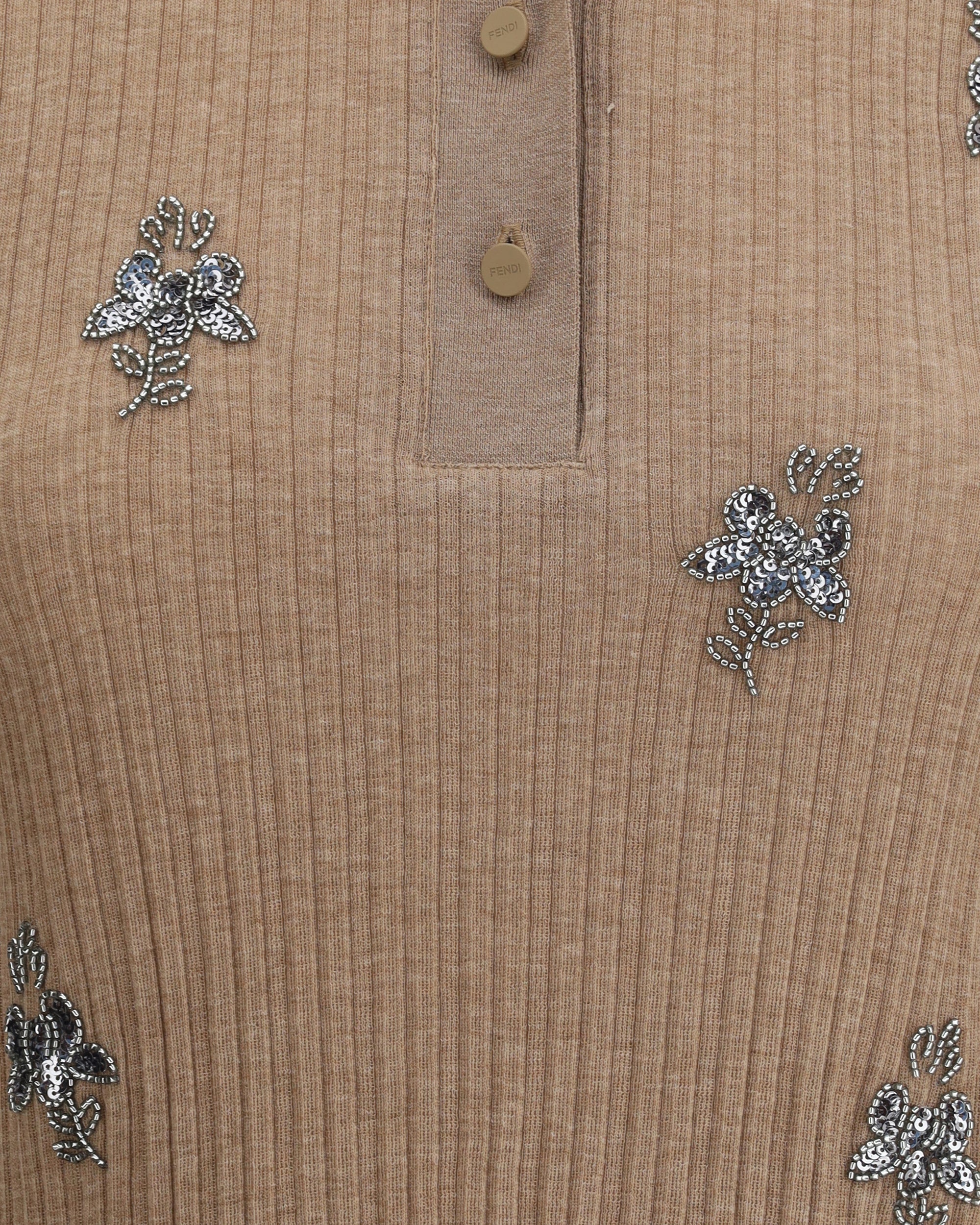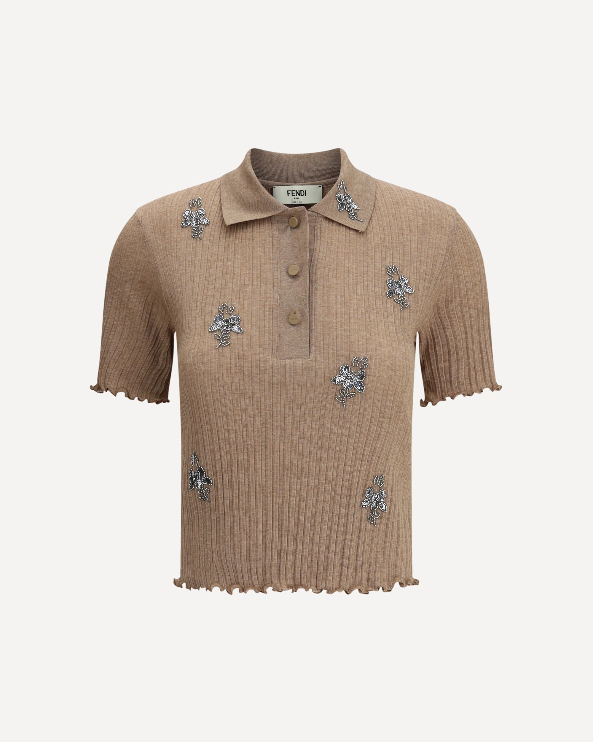 Fendi's Polo T-shirt reinterprets a classic with sophisticated and feminine details. Crafted with a ribbed collar and three-button front closure, it is embellished with a delicate lettuce hem and embellished with beaded and sequin appliqués for a bright and sophisticated touch.