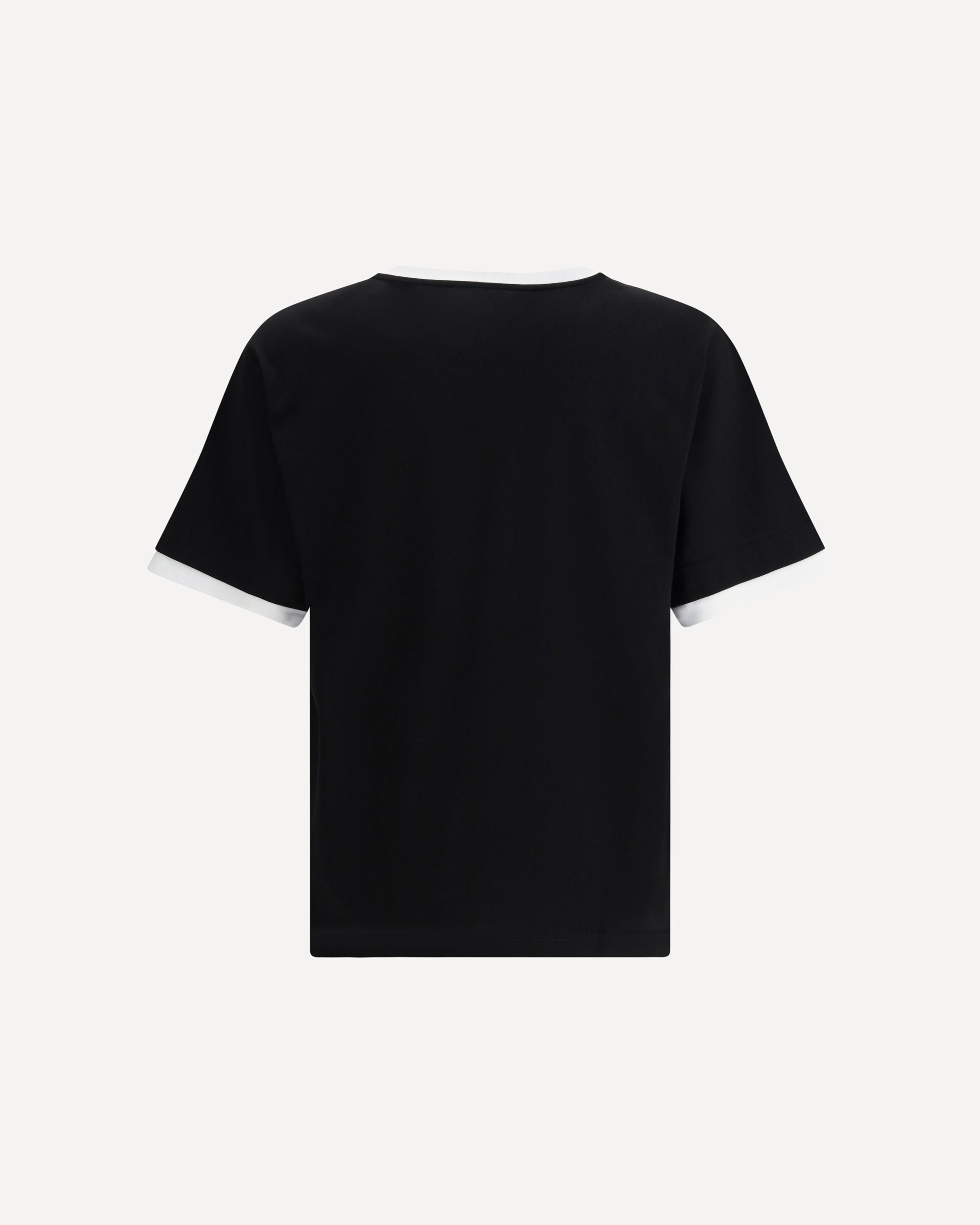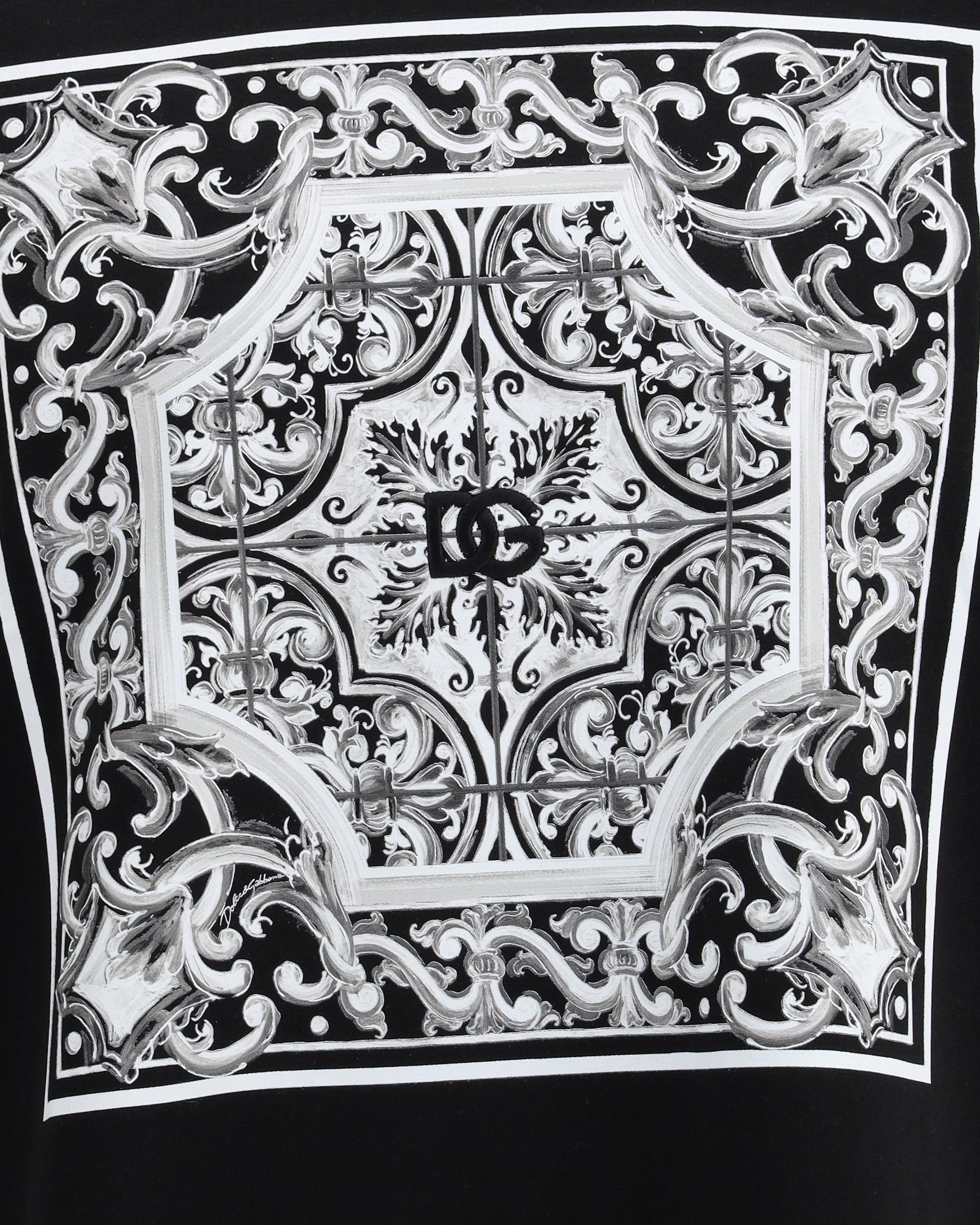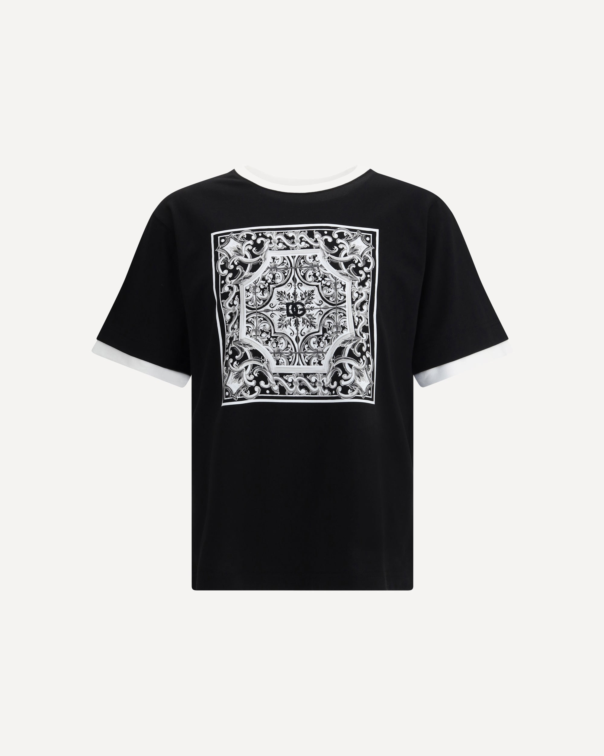 Dolce&Gabbana's T-Shirt is a masterpiece of style that combines classic elegance with modernity. Featuring a refined baroque print on the front, this T-shirt captures the essence of the brand's bold and sophisticated design. Contrasting hems add a dynamic touch, while the ribbed crew neck and logo embroidery on the front lend distinctive detail and impeccable comfort.