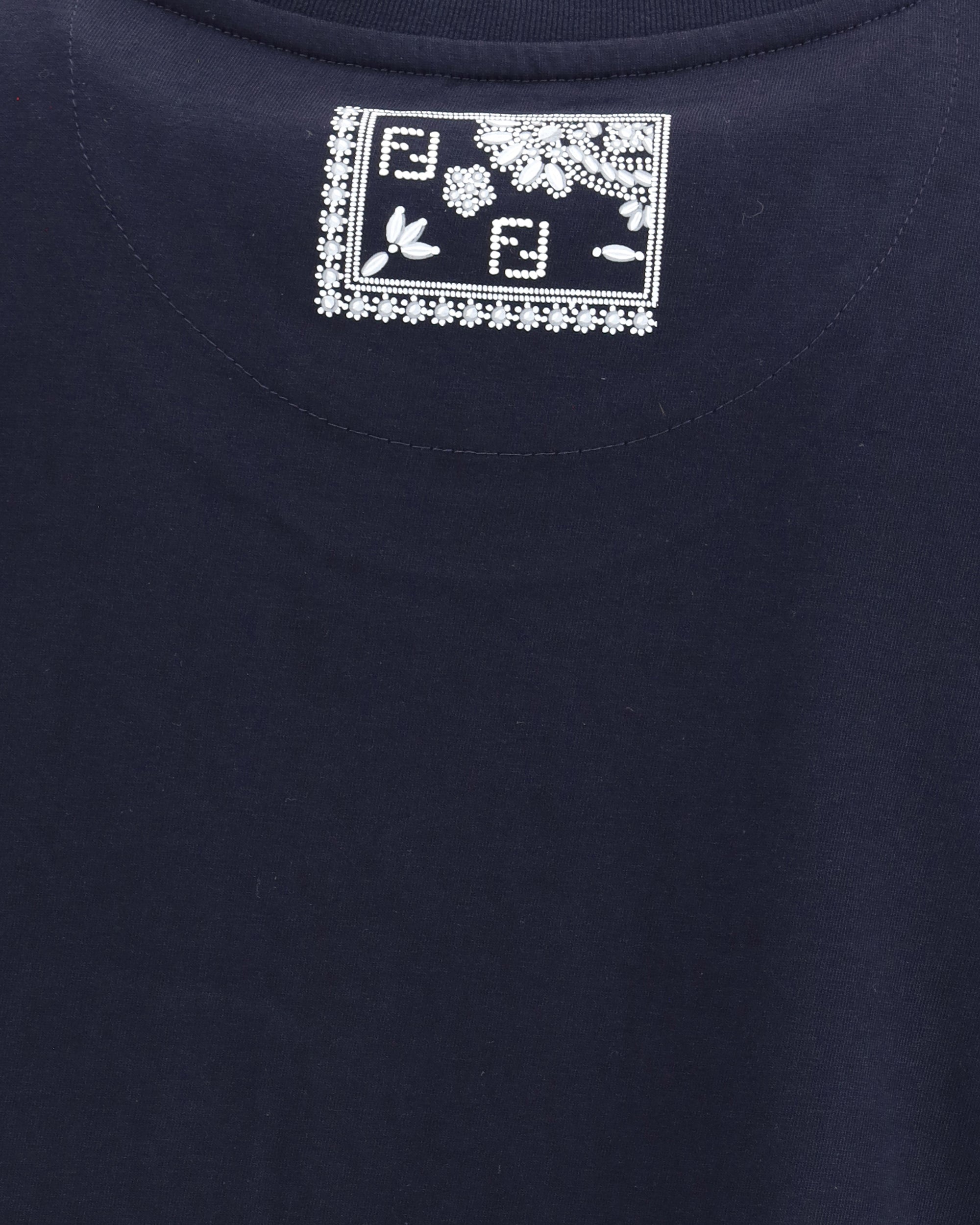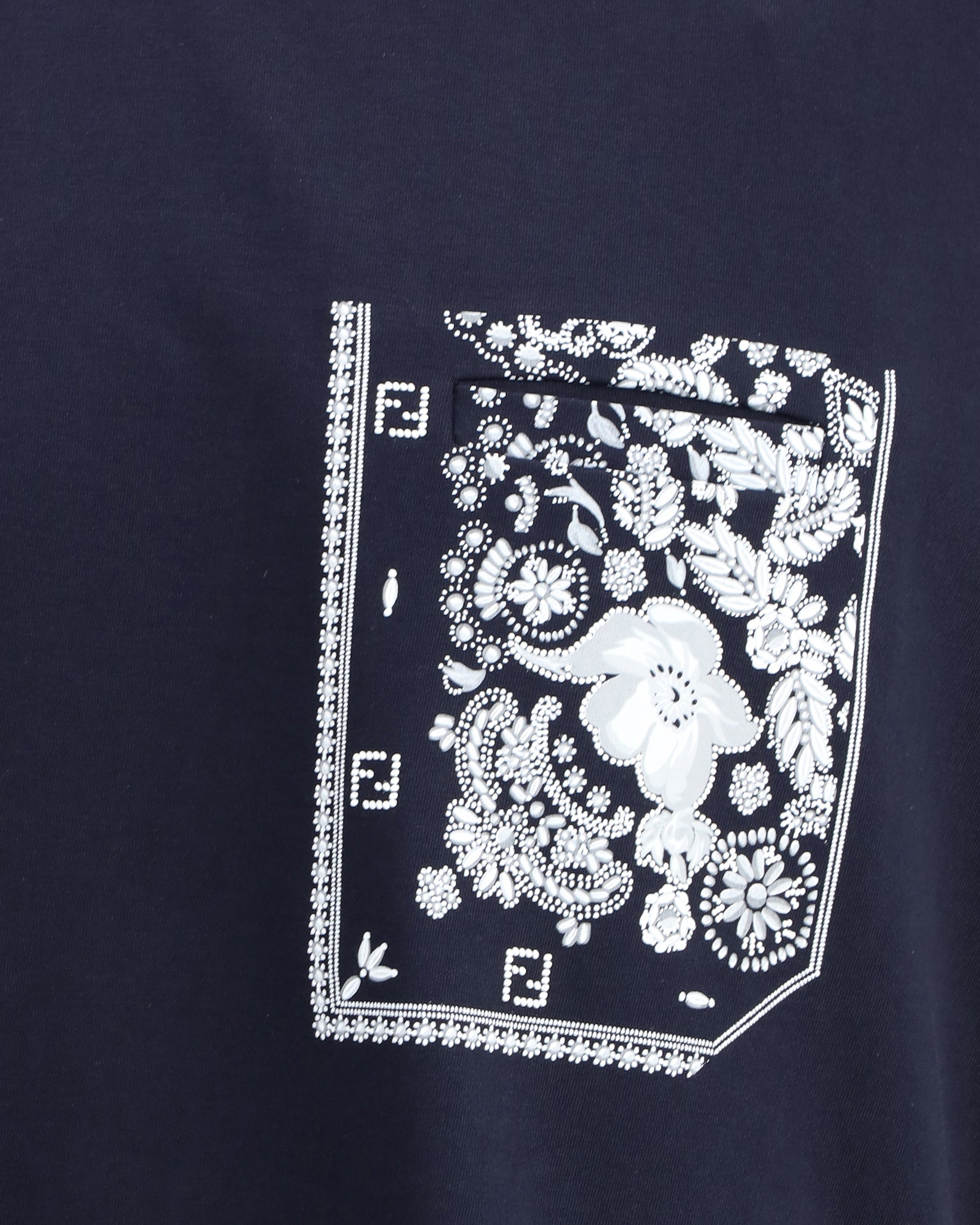 Cotton T-Shirt by Fendi features a distinctive design with attention to detail. The front is enhanced by a slit pocket embellished with a contrasting bandana print, which gives a graphic and contemporary touch. The garment is completed by the iconic monogram patch applied on the chest, the unmistakable signature of Fendi style.