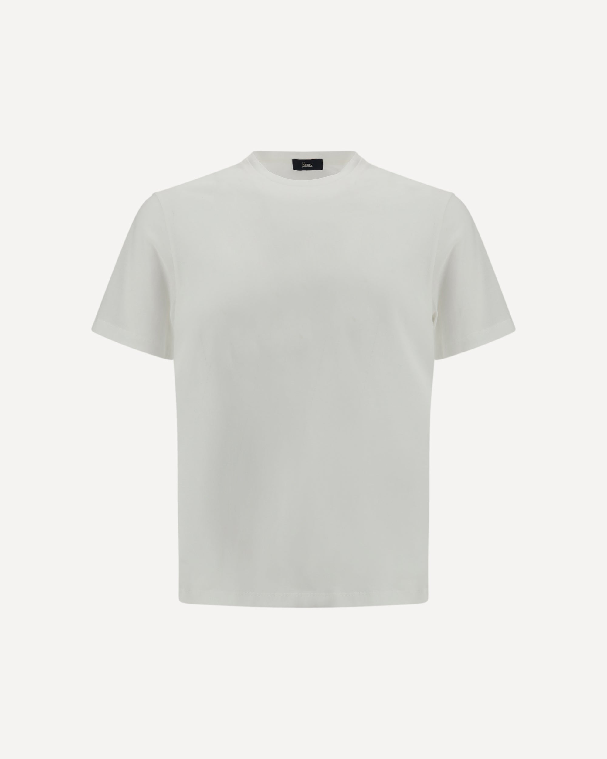 The T-shirt by Herno is crafted from lightweight jersey voile crêpe, providing a regular fit and refined comfort. It features a ribbed crew neck, short sleeves, and an elegant silver-tone metal logo plaque at the back of the neck, adding a subtle yet distinctive touch to its minimalist design.