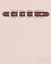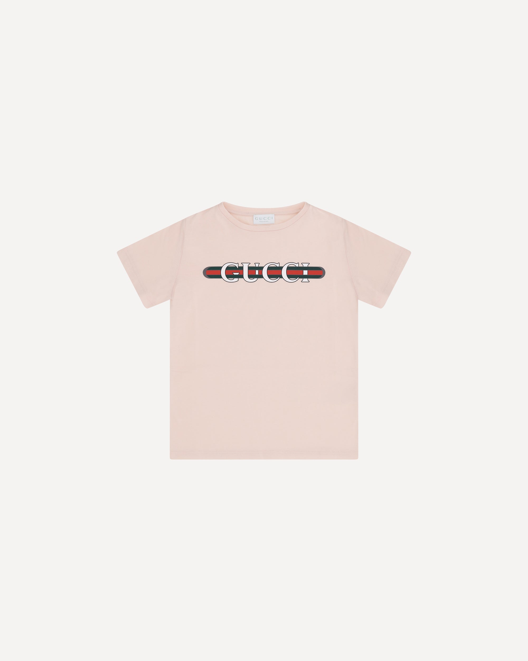 Gucci's cotton children's T-shirt is a stylish and comfortable garment featuring a classic ribbed collar that ensures a perfect and comfortable fit. The brand's iconic signature contrasting print on the front gives the garment a distinctive and luxurious touch. Made of high-quality cotton, this T-shirt is ideal for a casual yet stylish look,
