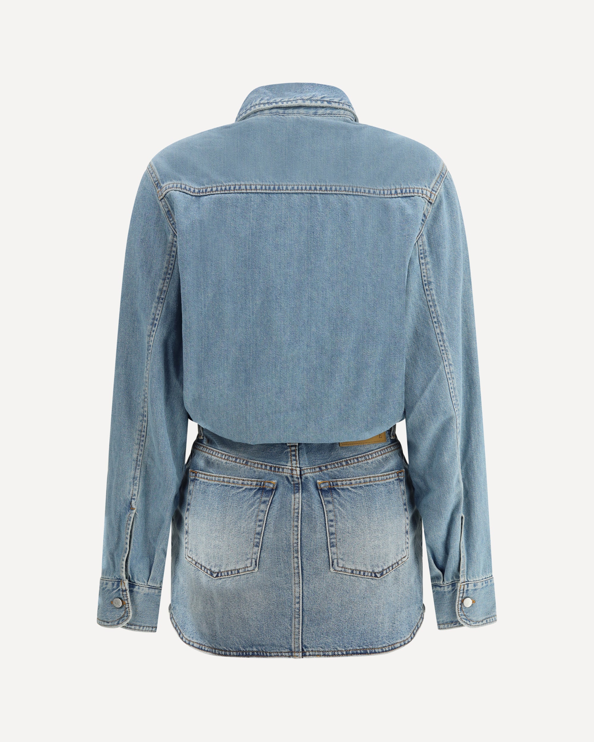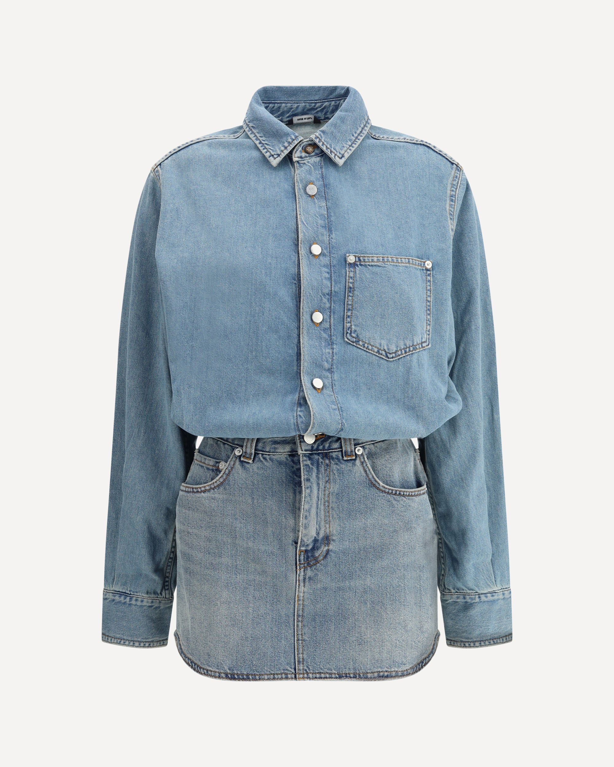 Haikure's Tamu denim Dress combines the design of a shirt with that of a skirt, creating a dynamic and contemporary look. The classic collar and front snap closure recall the style of the shirt, while the skirt, featuring five pockets, offers a touch of practicality and casual style. The button and zipper closure, along with belt loops on the waistband, allows for an adjustable fit.
