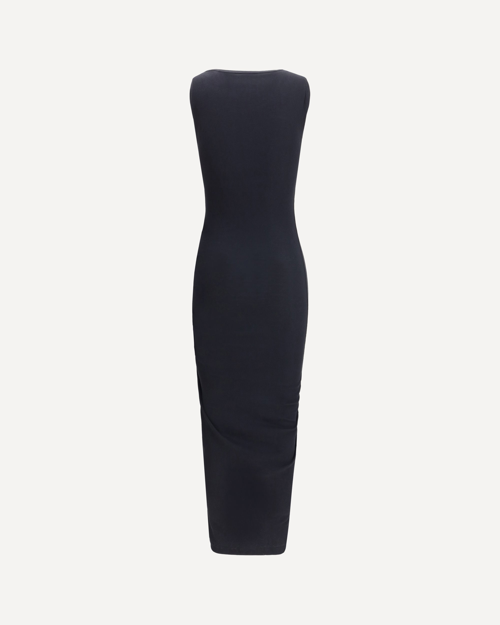 Loewe's cotton tank top Dress is an essential garment reinterpreted with sculptural taste and refined details. Made of lightweight ribbed stretch cotton, it follows the silhouette naturally, enhancing it thanks to the asymmetrical draping that gives dynamism and movement. The metal decoration with LOEWE engraving, applied with discreet elegance, adds a distinctive and contemporary touch. The medium length makes it versatile and suitable for both casual and more sophisticated settings, for a minimal but never mundane style.