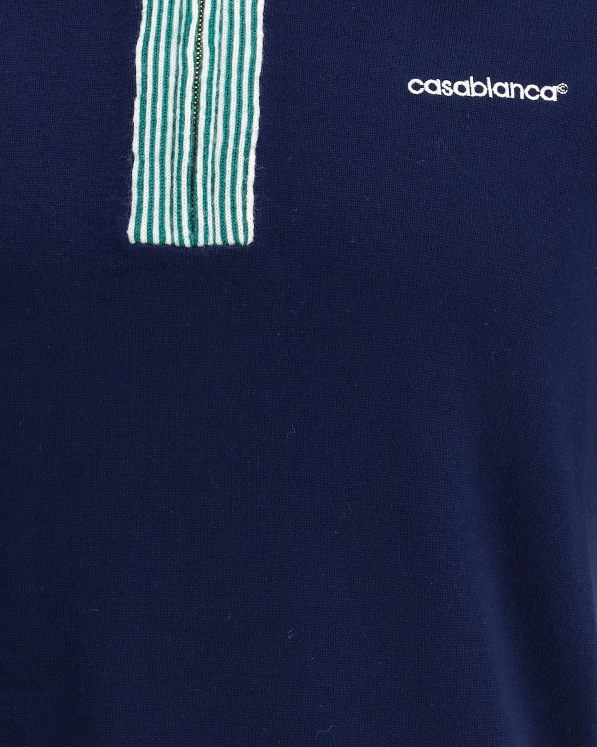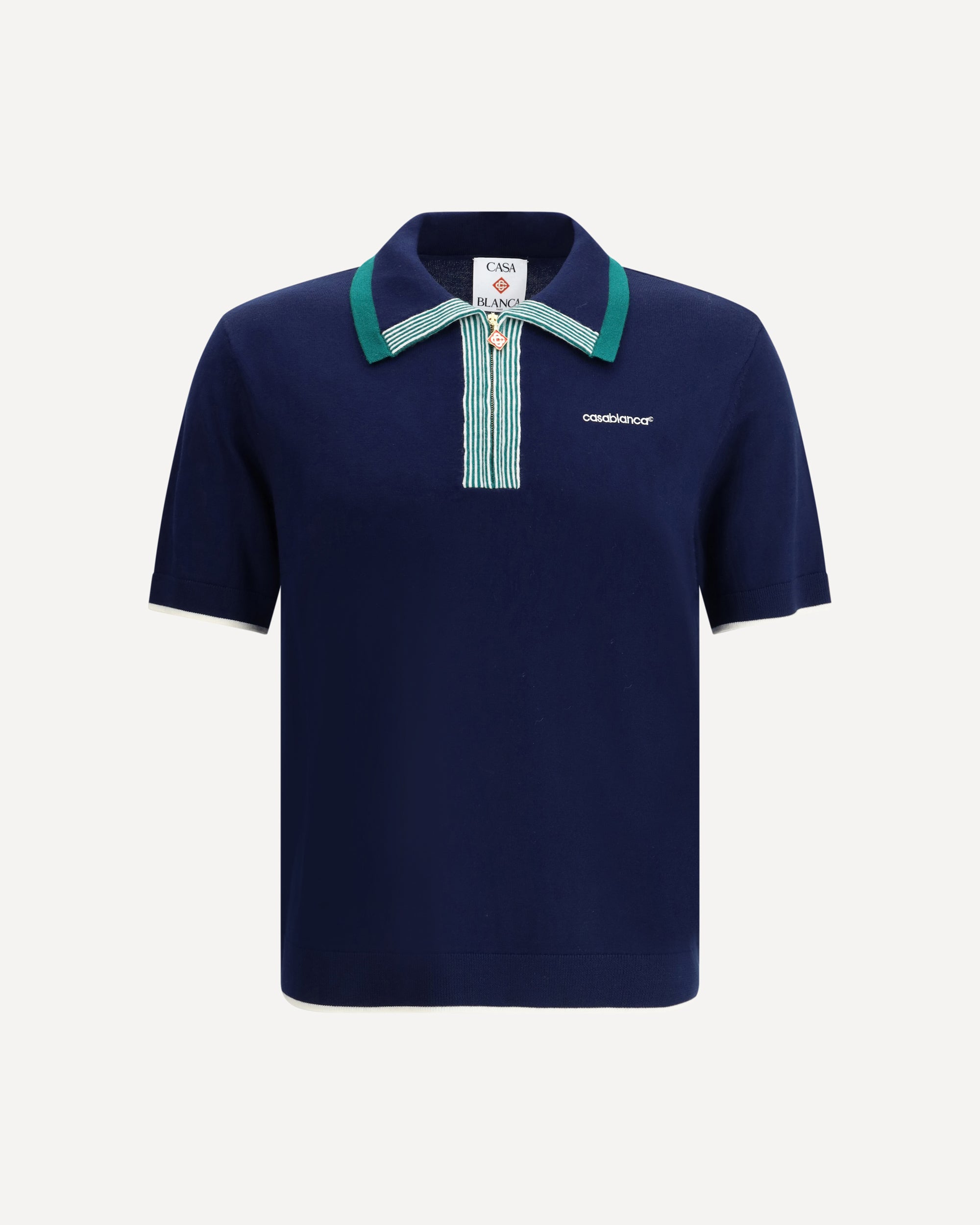 Casablanca's Merino wool Polo Shirt features a contrasting classic collar, adding a touch of elegance to the design. The zipper on the front offers practicality and a modern accent. The brand's iconic, contrasting monogram on the front adds a distinctive detail. The ribbed hemline completes the look, ensuring a comfortable, finished fit. A sophisticated and versatile garment perfect for a casual-chic look.