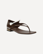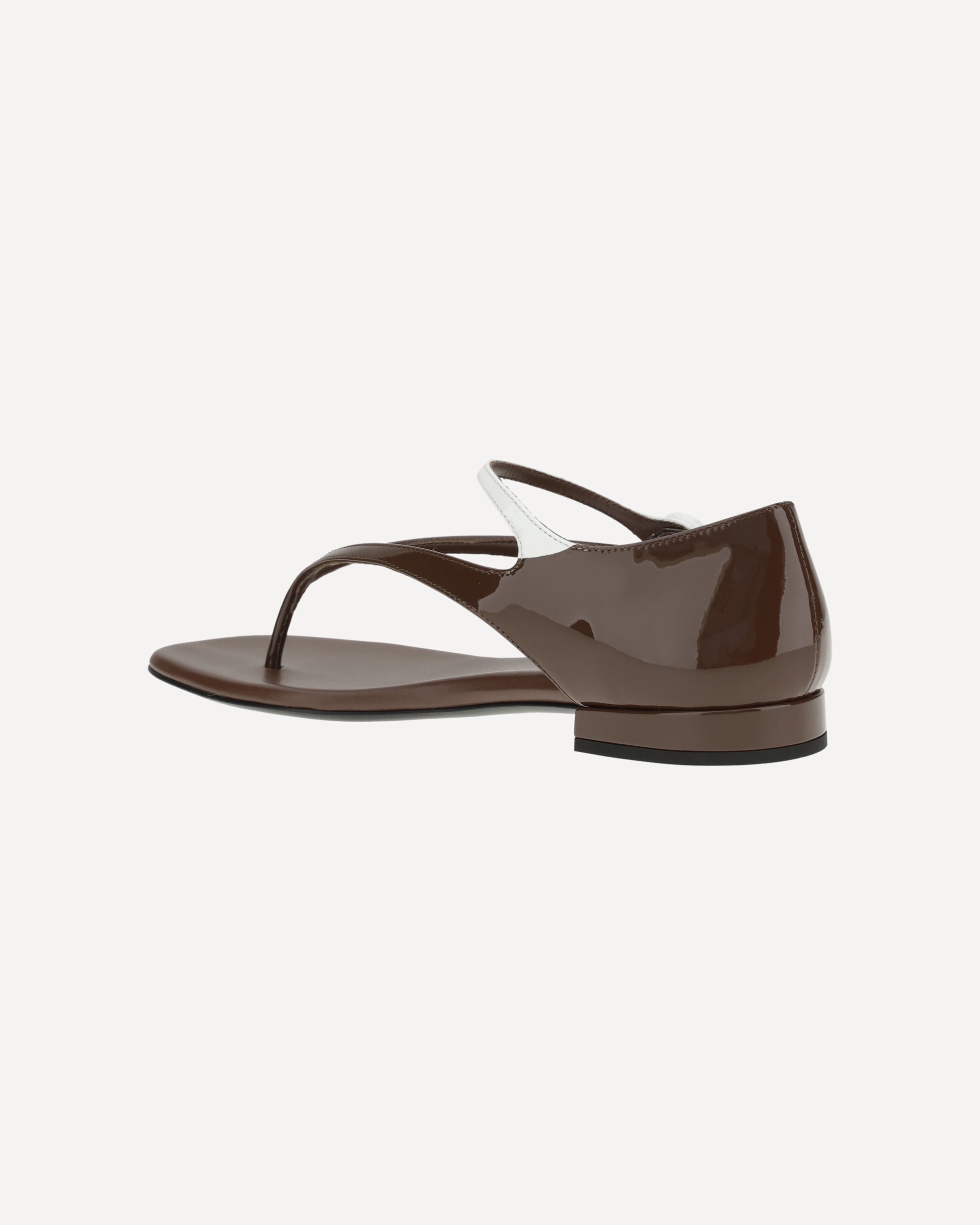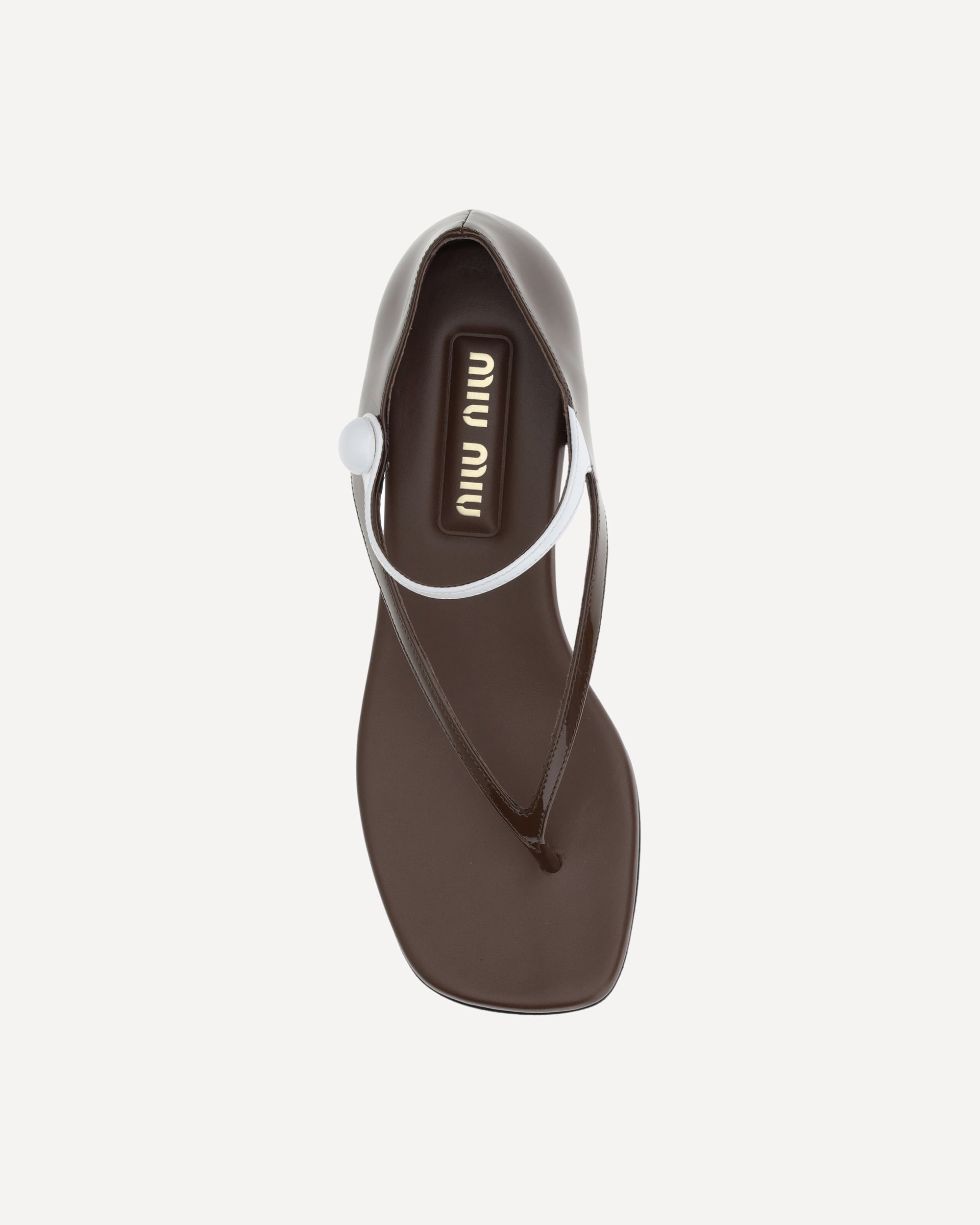 Miu Miu's Thong Sandals reinterpret a summer classic with a bold and refined twist. Made of patent leather, they stand out with a logo in metallic letters applied to the side and a square toe, giving them a modern aesthetic. A contrasting decorative strap at the instep adds dynamism to the design, while the printed logo on the inside completes the style with iconic detail. Perfect for a chic and casual look.
