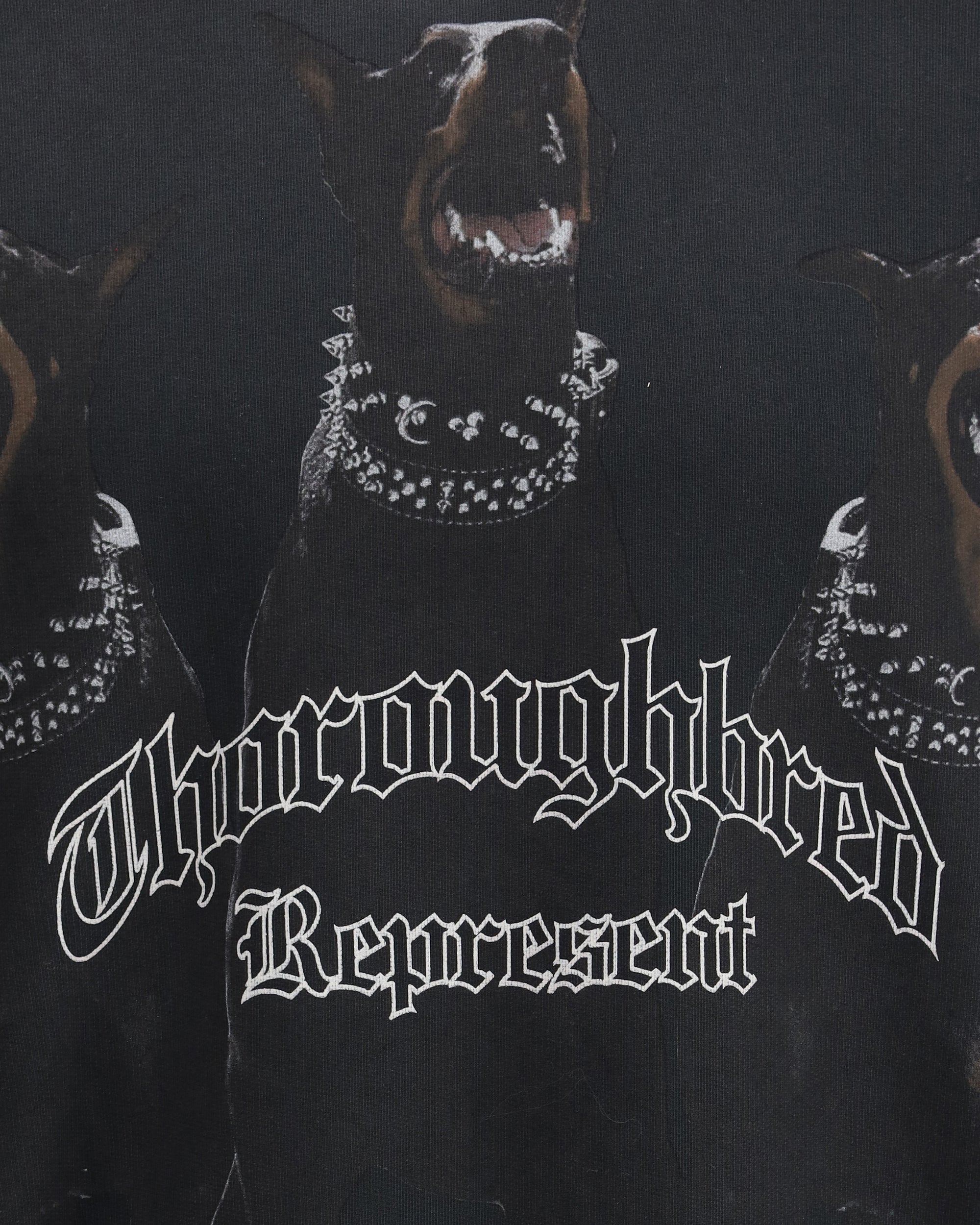 The Thoroughbred Hoodie by Represent combines comfort and urban style in a distinctively designed garment. Featuring a ribbed hem and cuffs, it offers a snug and comfortable fit, while the pouch pocket on the front adds practicality and functionality. The maxi dog print on the front gives a bold and original touch, making this sweatshirt a unique piece for those who love to express their personality through clothing.