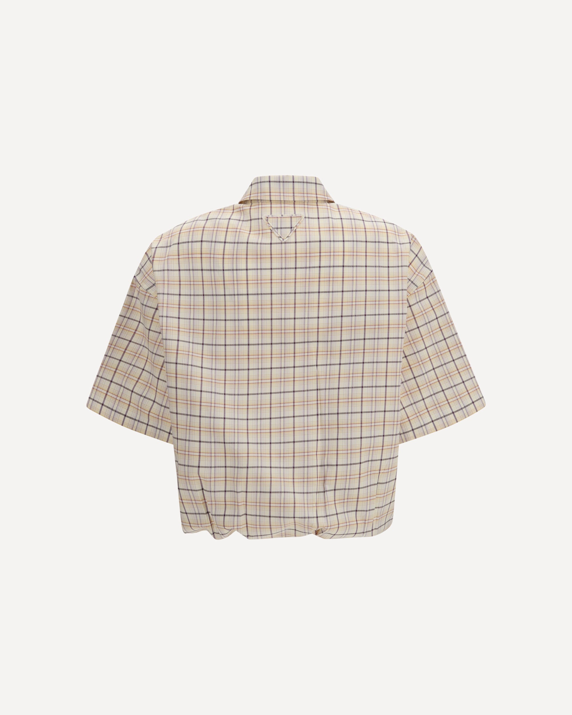 The checked poplin Shirt by Prada combines light volumes with a vintage-inspired style. It features a straight fit, polo collar, front button closure, and short sleeves. The design is completed with a patch pocket, fabric triangle logo, and an elasticized hem with drawstring, while the creased finish gives the garment a distinctive vintage look.