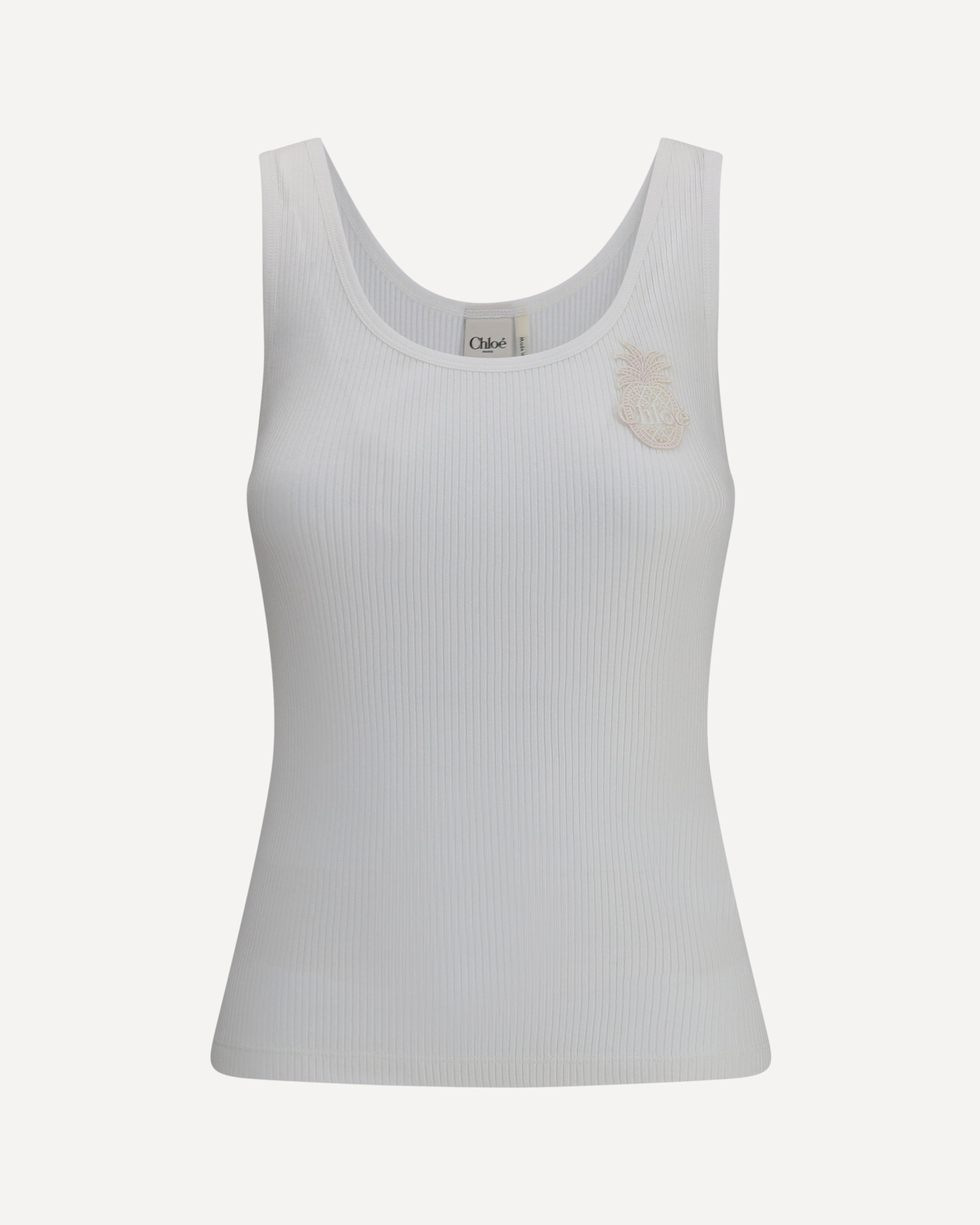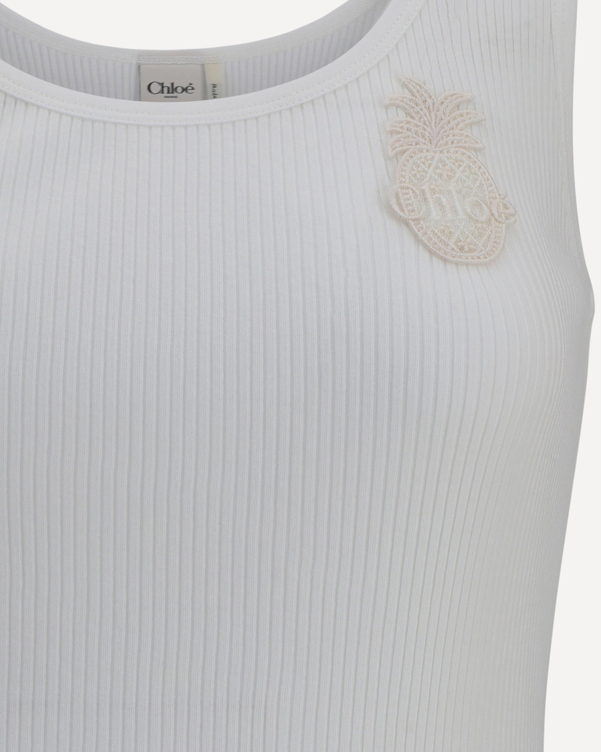Chloé's ribbed jersey Top is a versatile and feminine garment. Made of soft ribbed jersey, it offers a comfortable fit that flatters the silhouette. The classic round neckline makes it a passe-partout for a variety of occasions, while a delicate appliqué lace detail on the front adds a touch of romance and sophistication, elevating the simple design with Chloé's signature elegance.