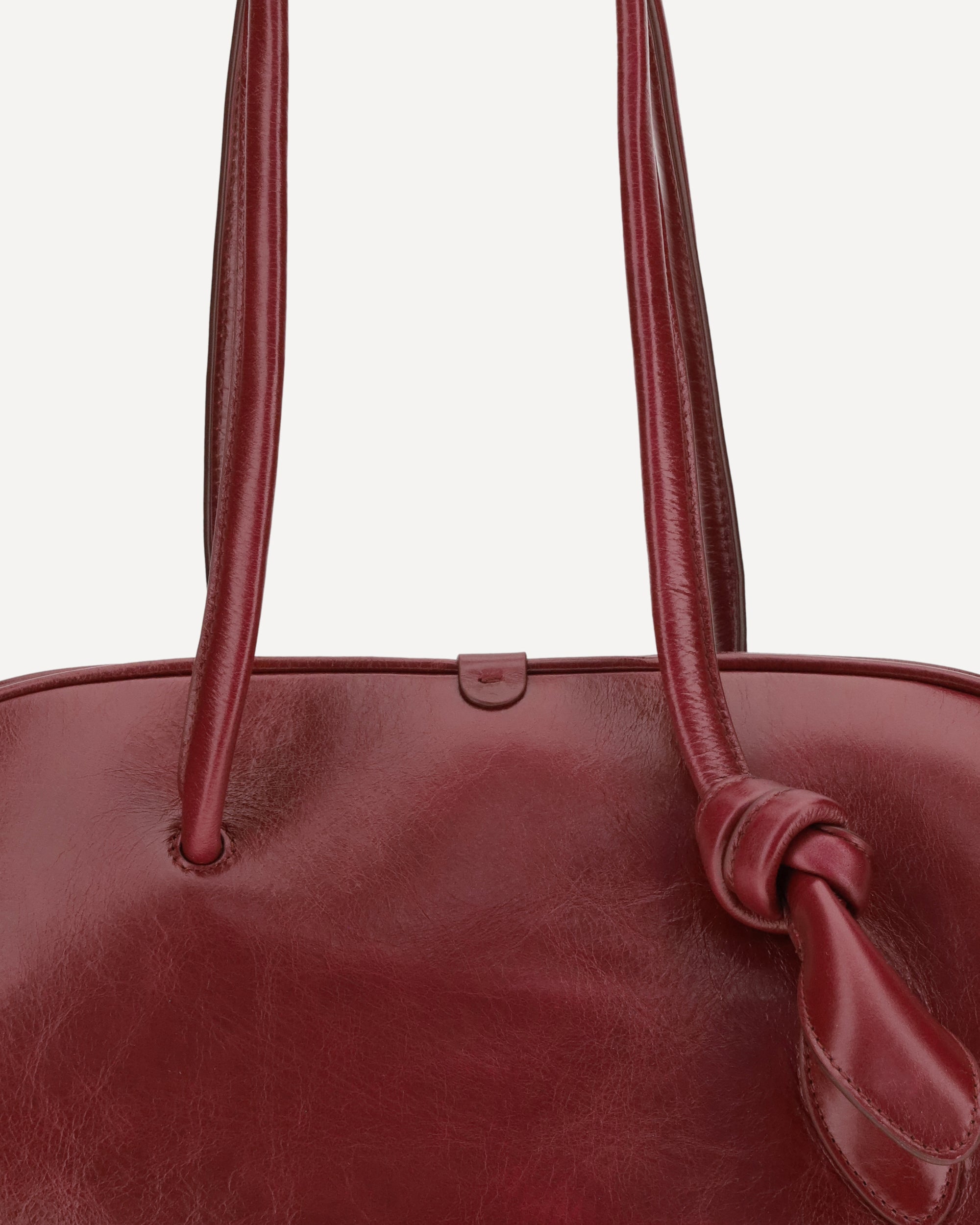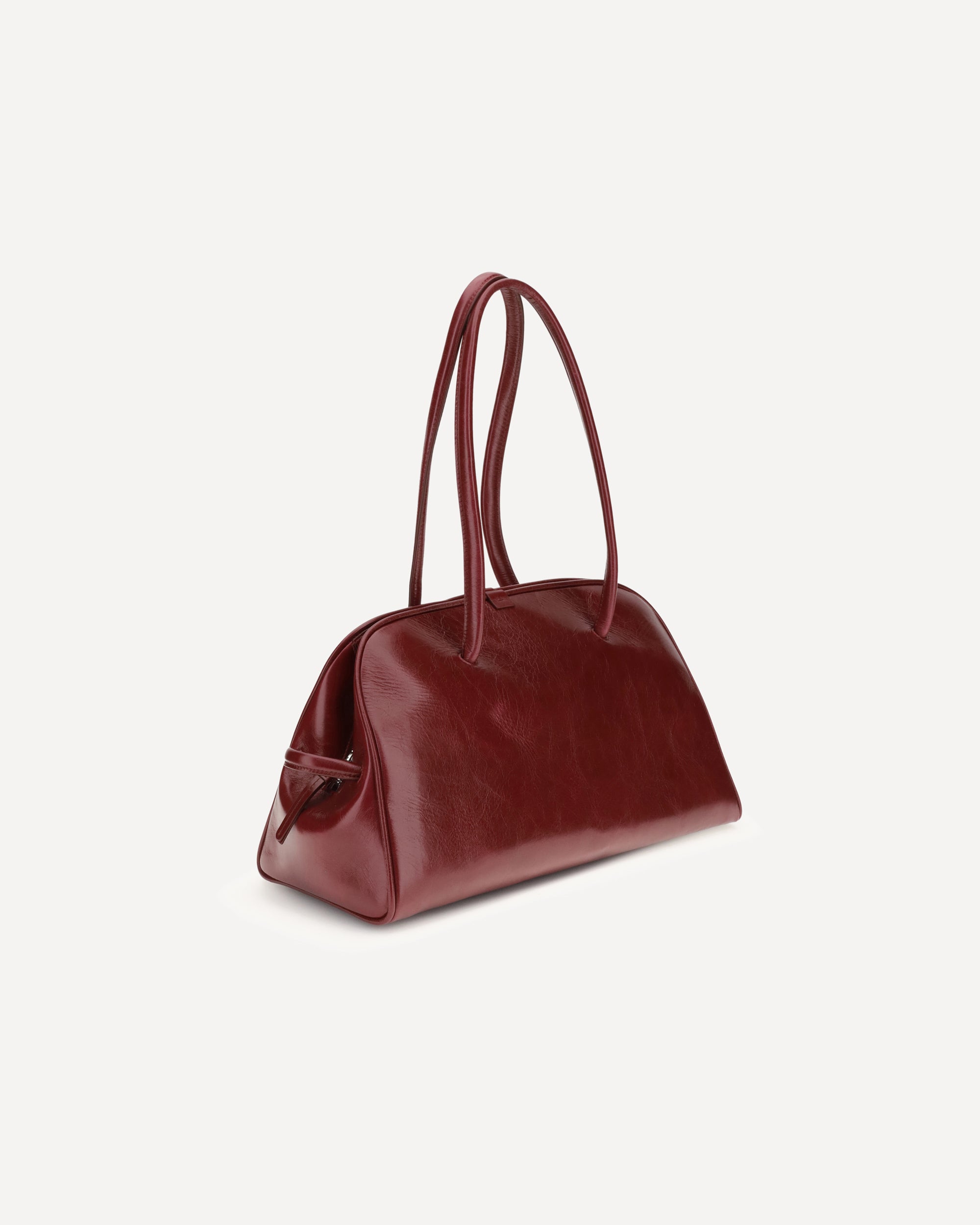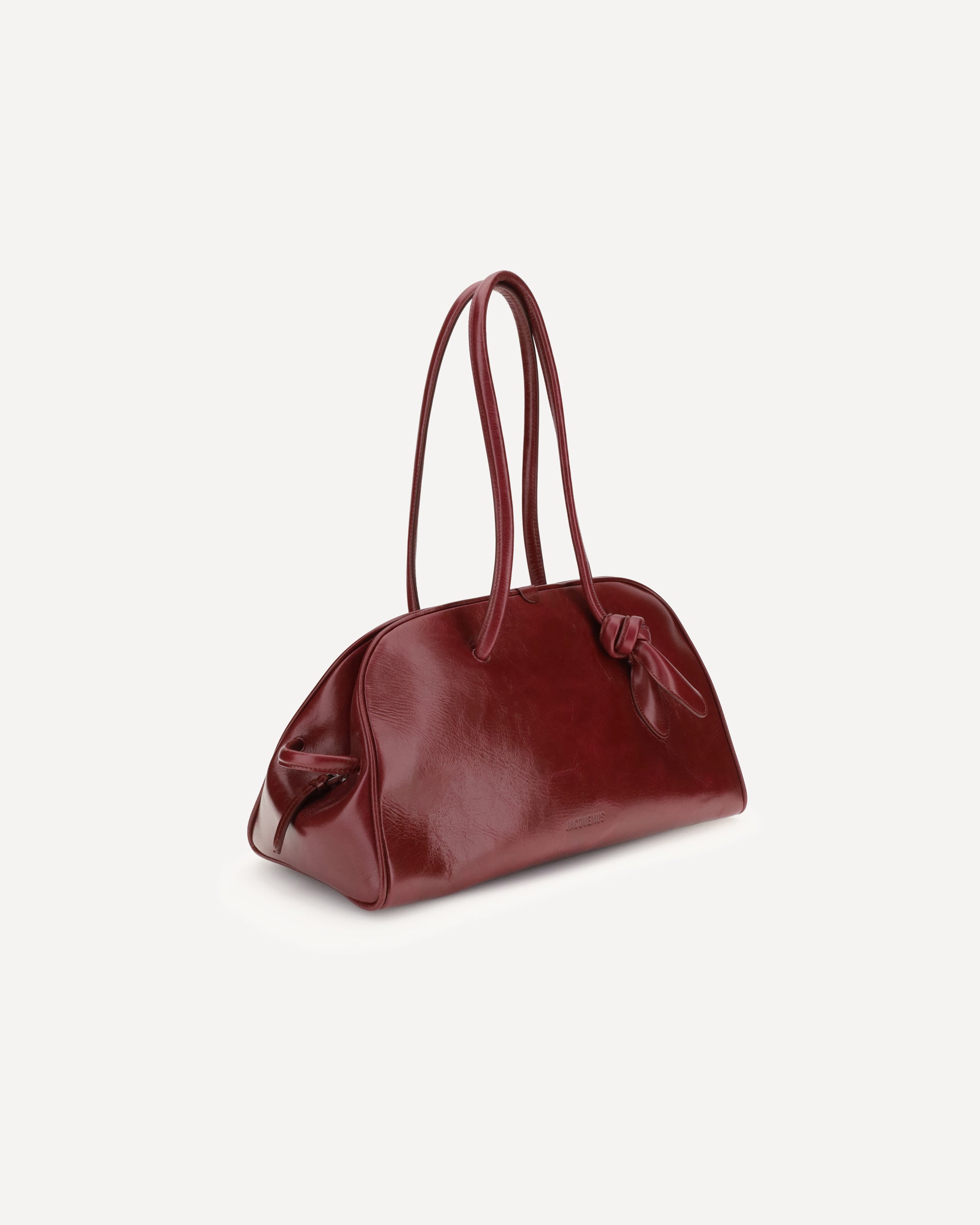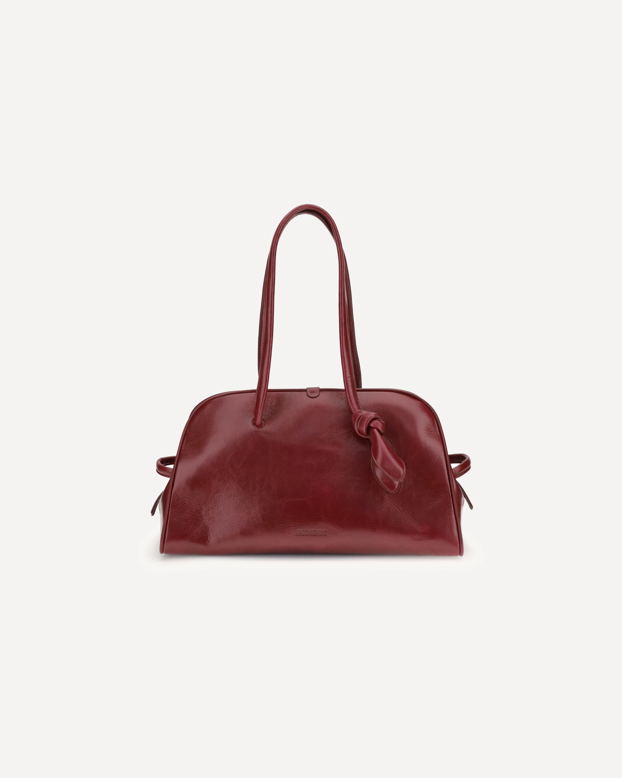 The Bowling Bag by Jacquemus in glossy leather with a vintage finish is a refined and contemporary accessory. The double-zip closure and coordinated leather tubular handles, enhanced by an elegant knotted detail, highlight its unique design. The embossed logo completes the silhouette, while the interior pocket adds functionality without sacrificing style.