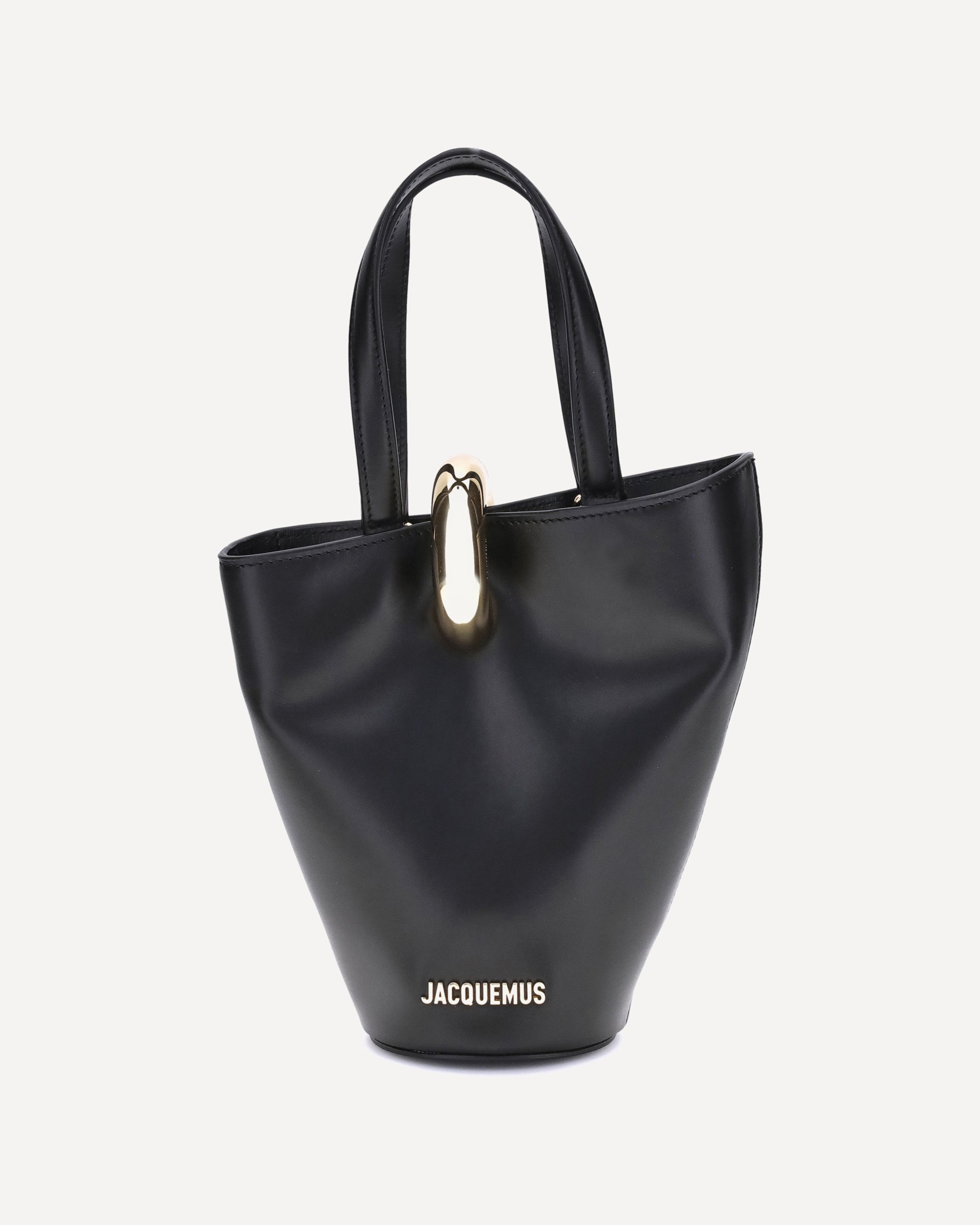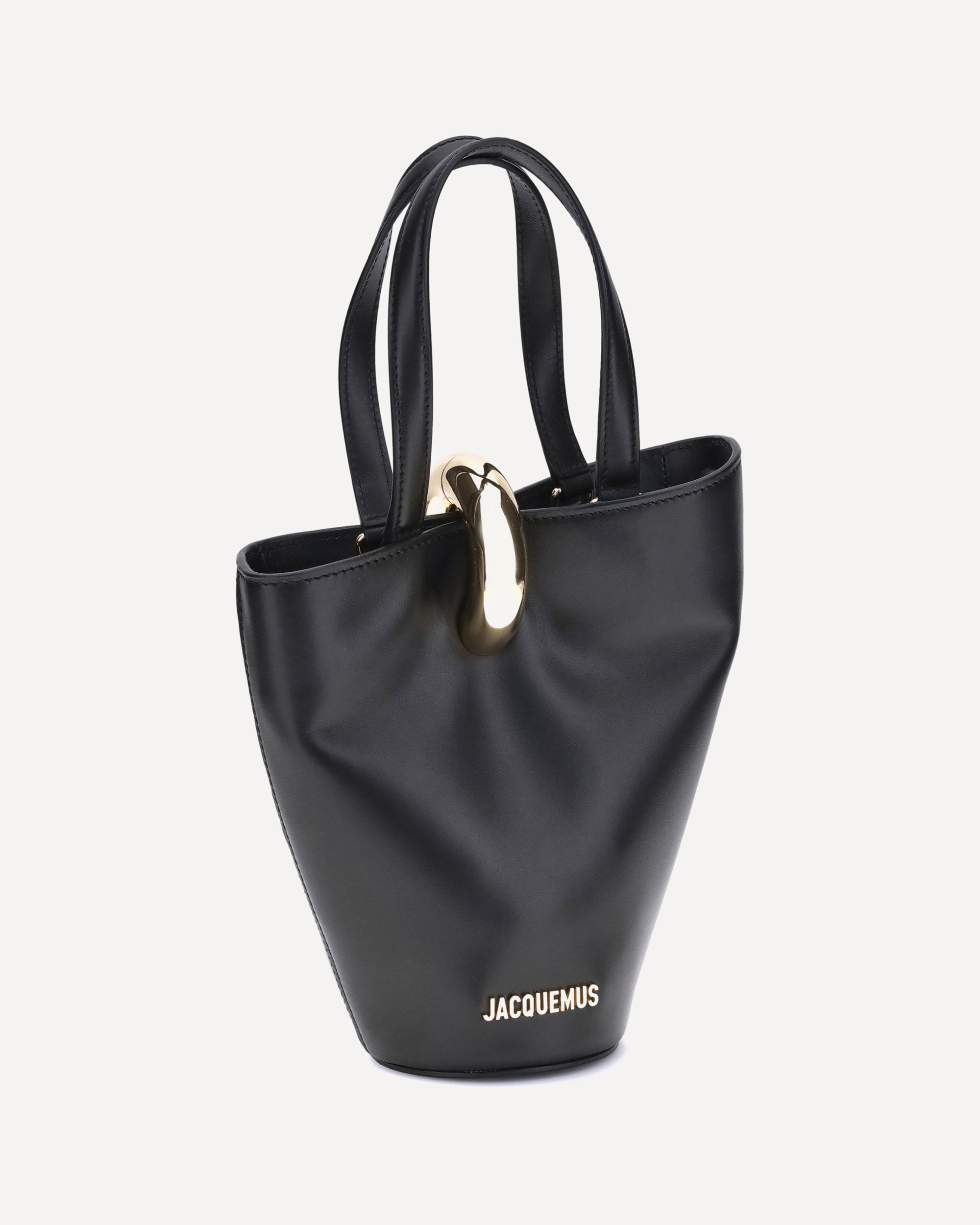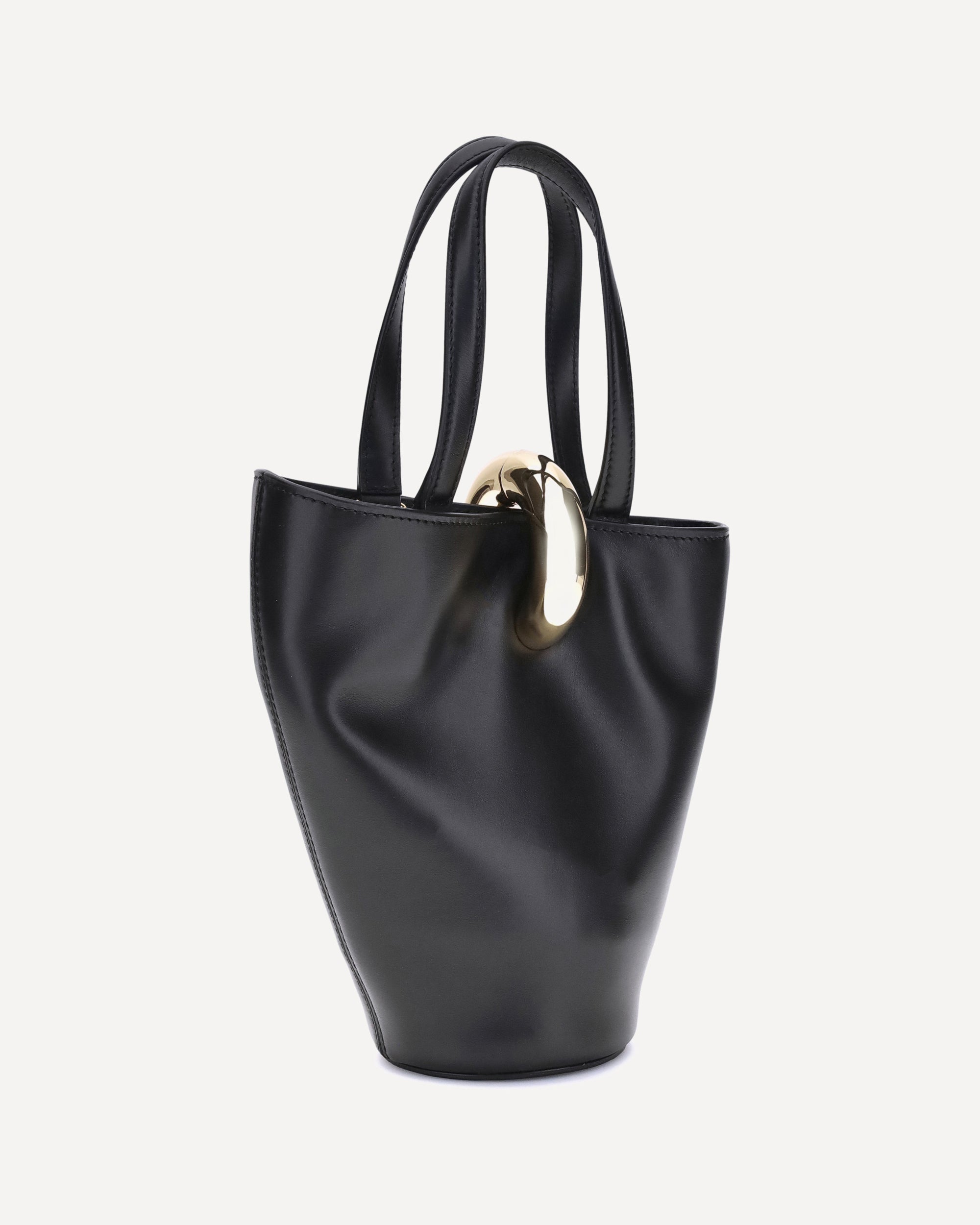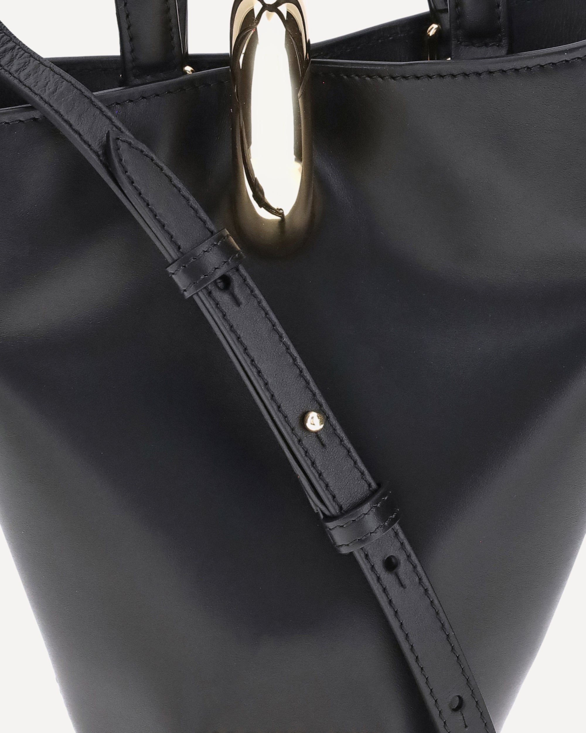 The La Bambola small Bucket Bag is a sophisticated accessory with a contemporary and refined design. Crafted from smooth leather, it stands out for its asymmetrical silhouette and refined details, such as the front closure with a gold metal ring and the logo applied on the bottom. Equipped with two on-top handles and an adjustable and removable shoulder strap, it offers versatile portability. The interior, with a single compartment, is completed by a practical zip pocket, perfect for neatly storing essentials.