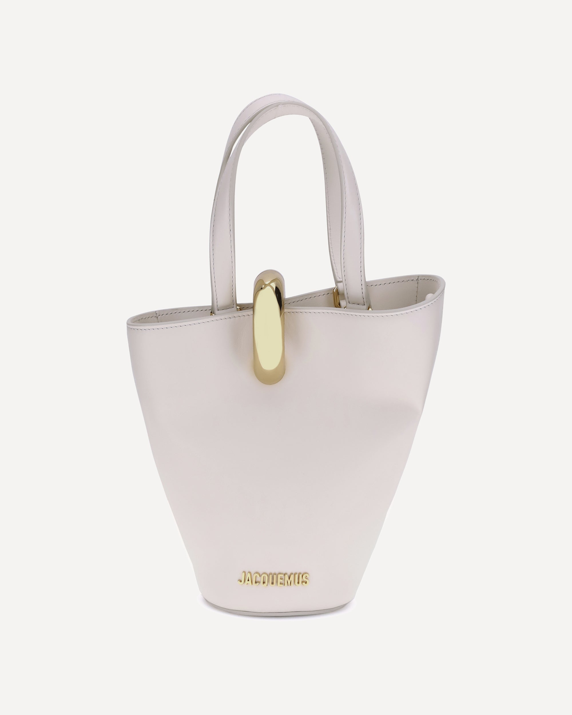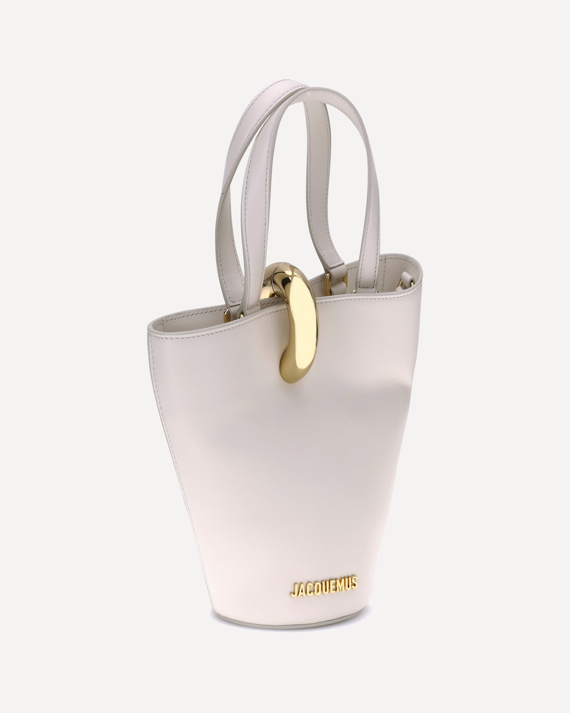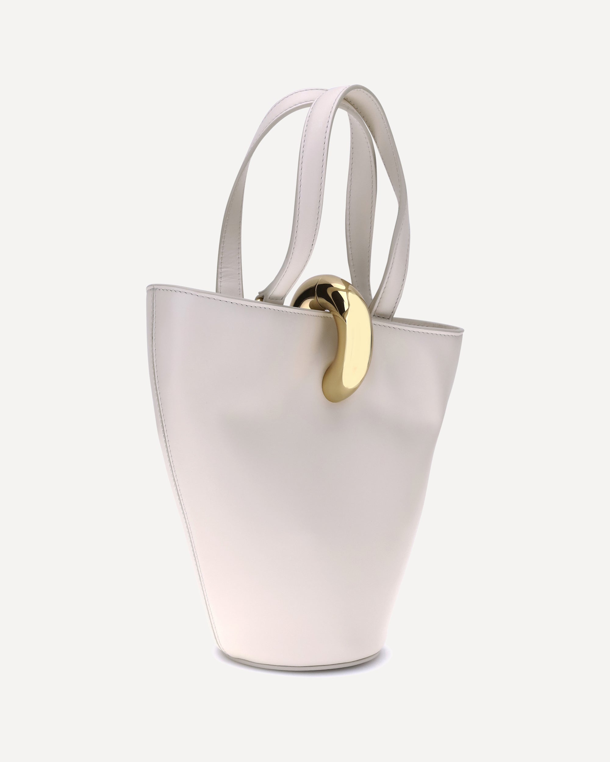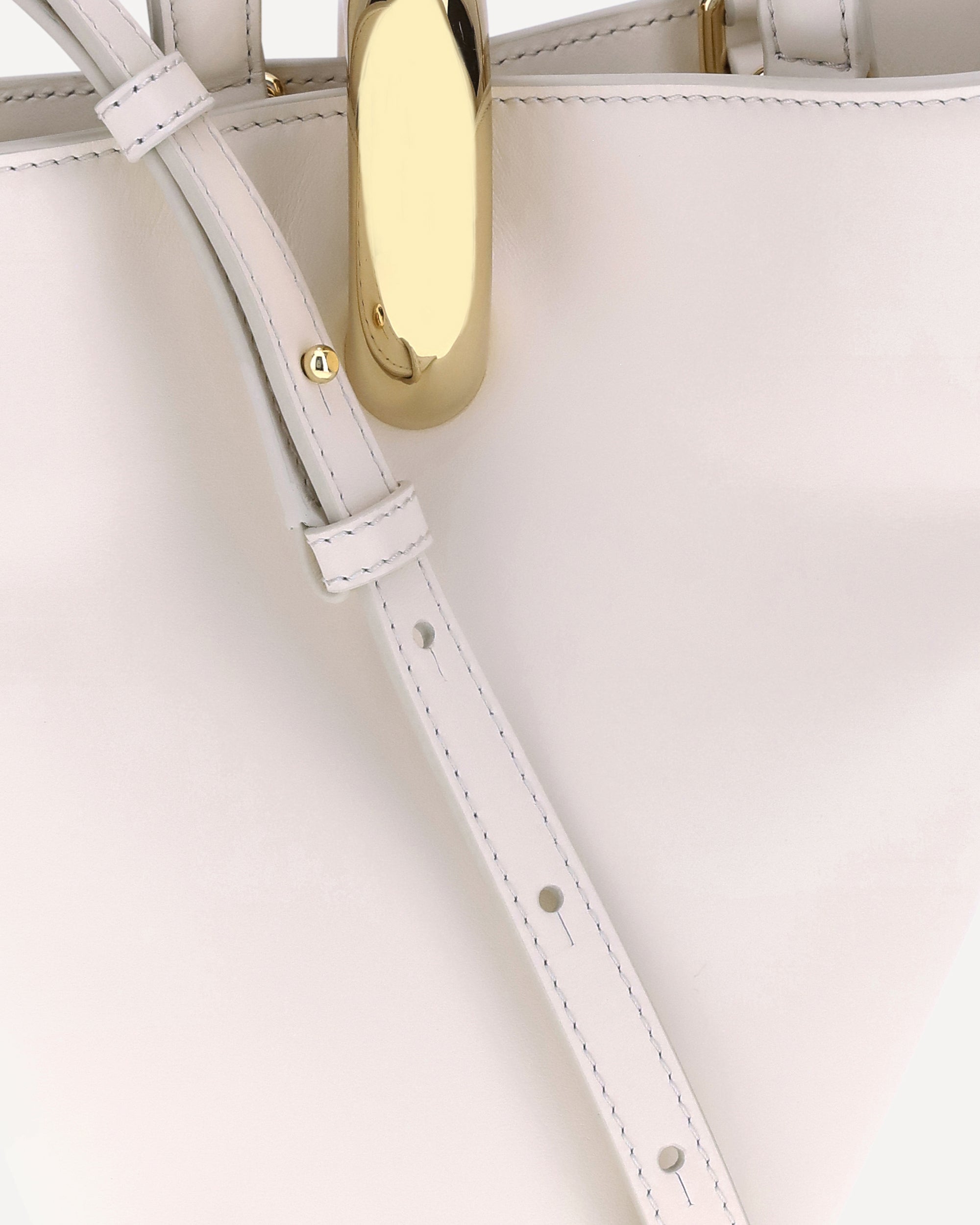 The La Bambola small Bucket Bag is a sophisticated accessory with a contemporary and refined design. Crafted from smooth leather, it stands out for its asymmetrical silhouette and refined details, such as the front closure with a gold metal ring and the logo applied on the bottom. Equipped with two on-top handles and an adjustable and removable shoulder strap, it offers versatile portability. The interior, with a single compartment, is completed by a practical zip pocket, perfect for neatly storing essentials.