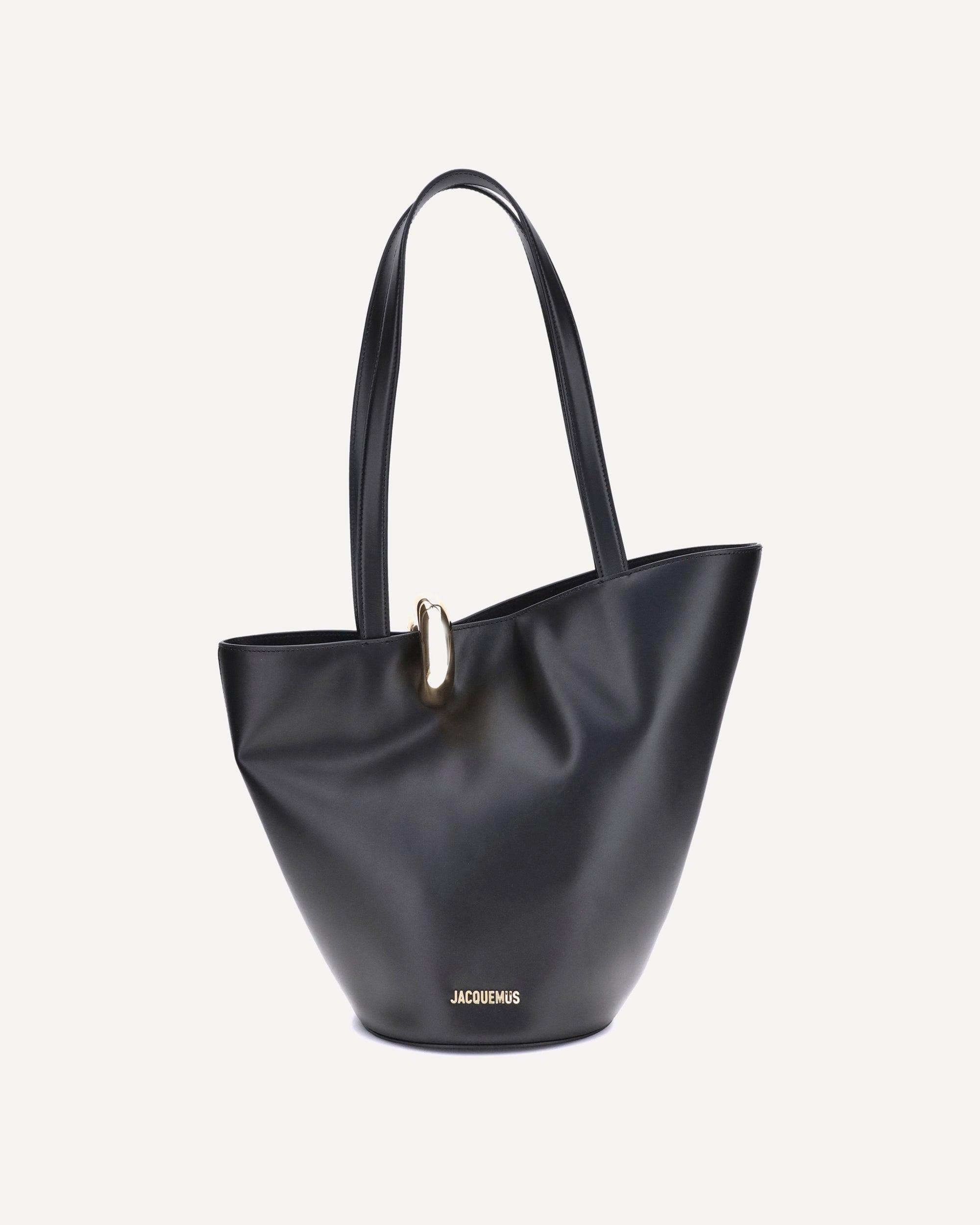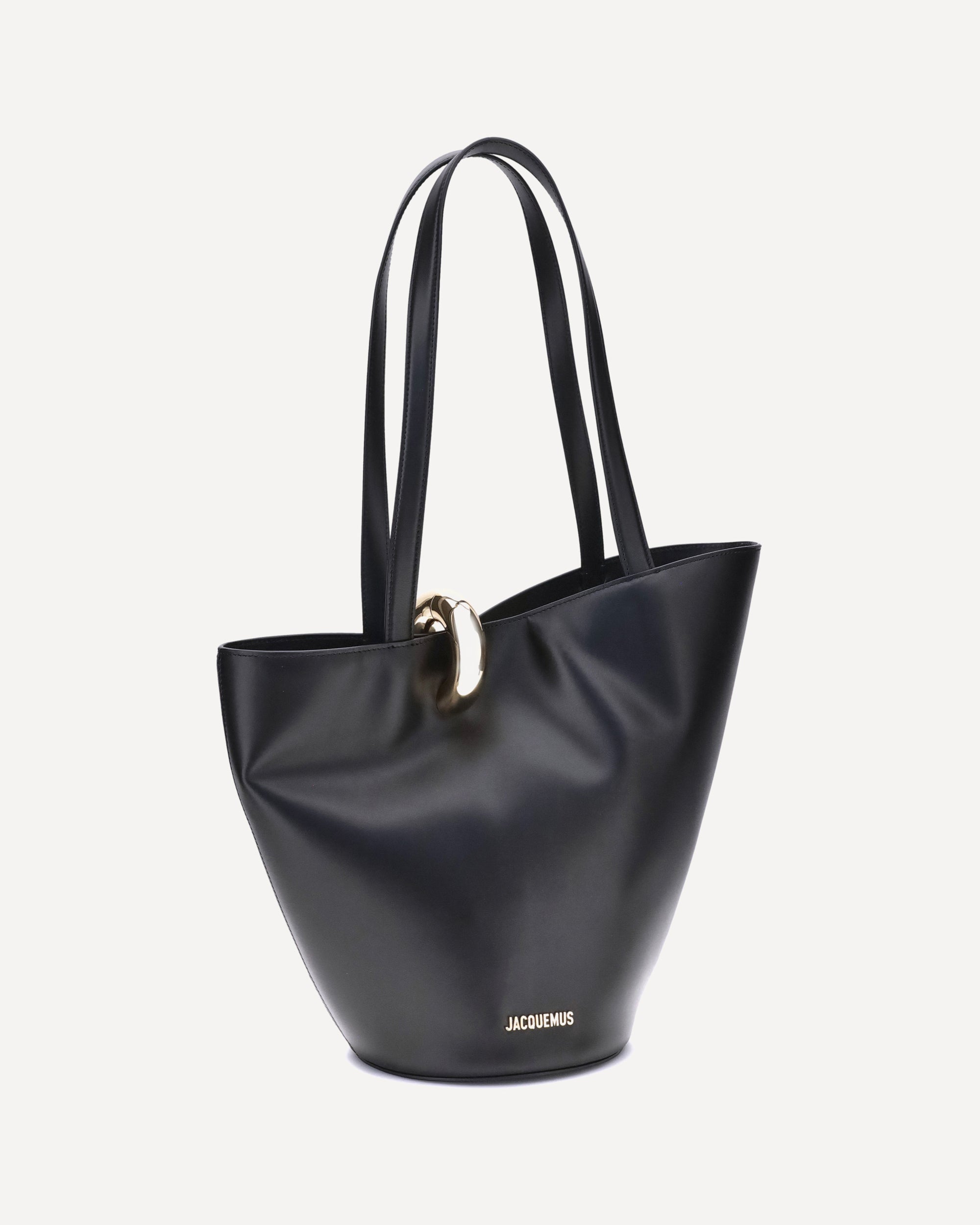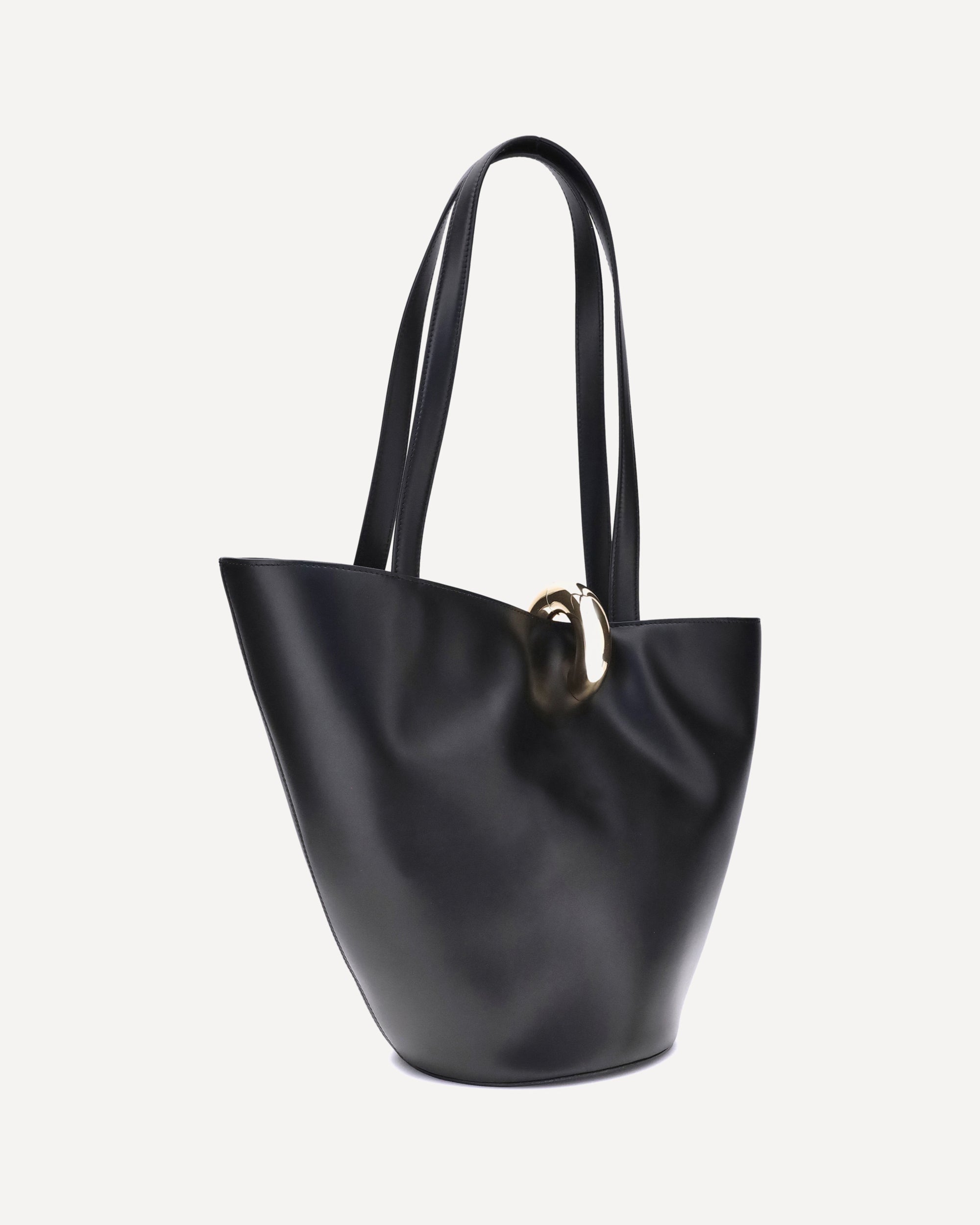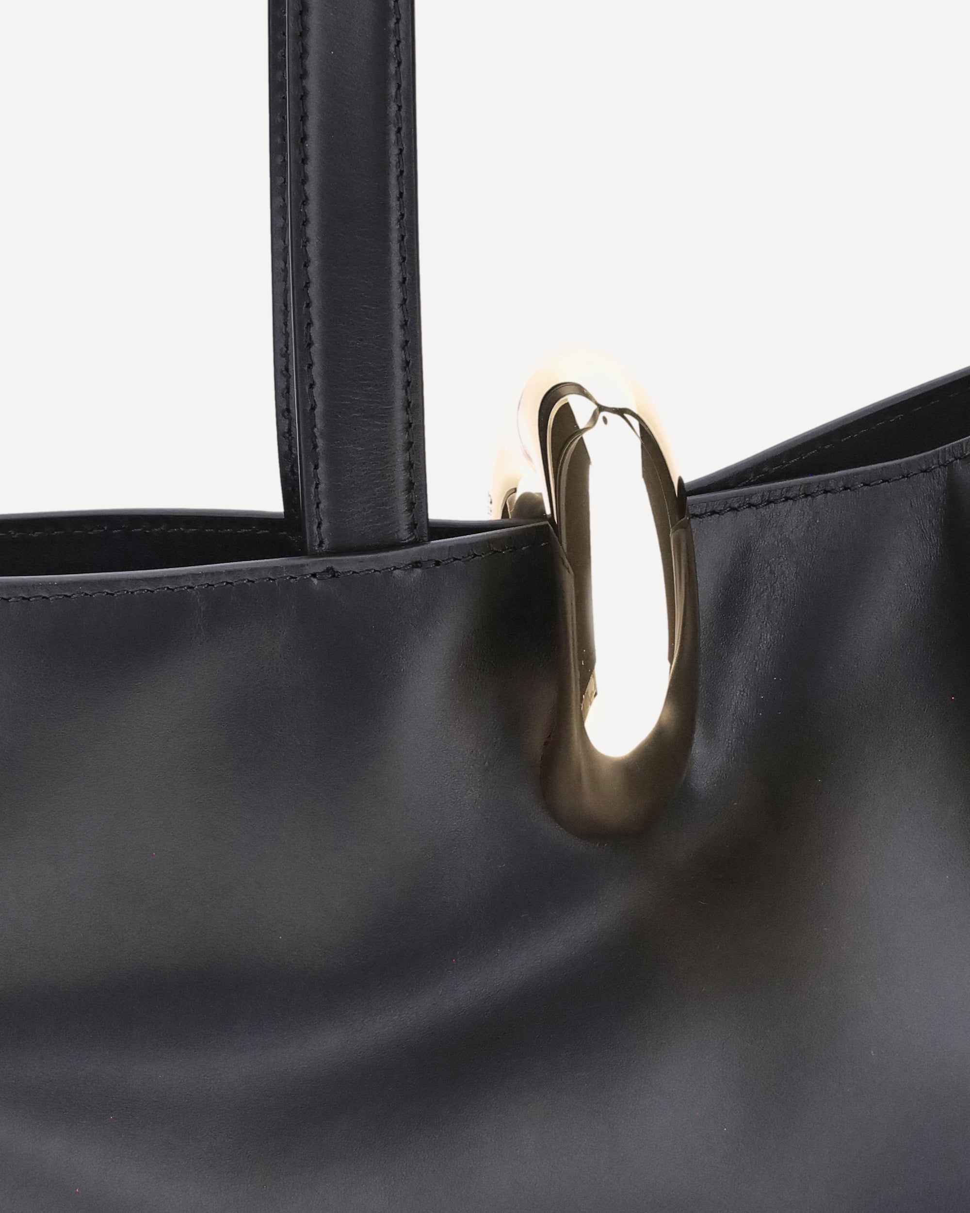 The large La Bambola Bucket Bag is a sophisticated accessory with a contemporary and refined design. Crafted from smooth leather, it stands out for its asymmetrical silhouette and refined details, such as the front closure with a gold metal ring and the logo applied on the bottom. Equipped with two on-top handles and an adjustable and removable shoulder strap, it offers versatile portability. The interior, with a single compartment, is completed by a practical zip pocket, perfect for neatly storing essentials.