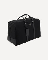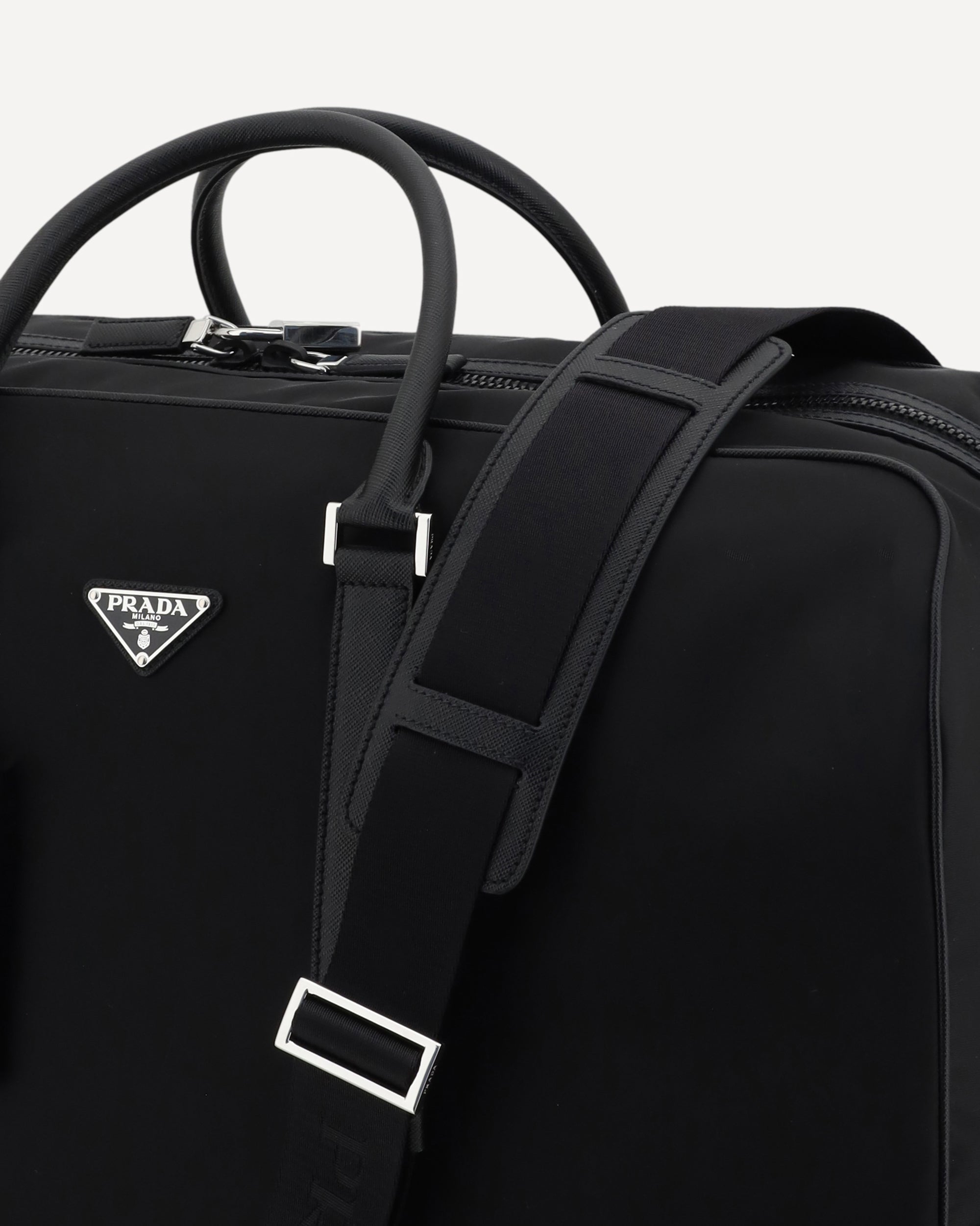Re-Nylon Travel Bag by Prada, two tubular handles, twist-zip closure at top, triangular plaque with iconic brand monogram applied to front, leather details, single interior compartment.