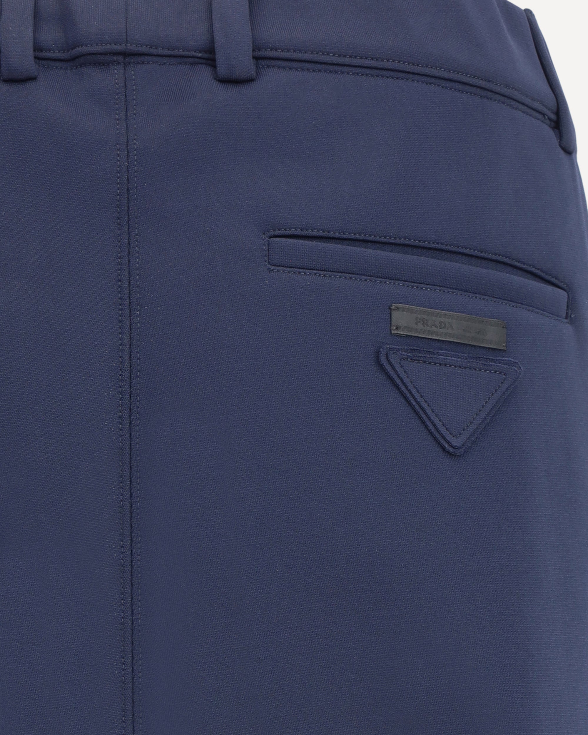 Prada's Jersey Pants combine comfort and style with an elasticized waistband and belt loops at the waist. They feature two side welt pockets and two on the back, enhanced by the triangular patch and iconic logo sewn on the back. The style tapers at the bottom, adding a modern detail to the silhouette.