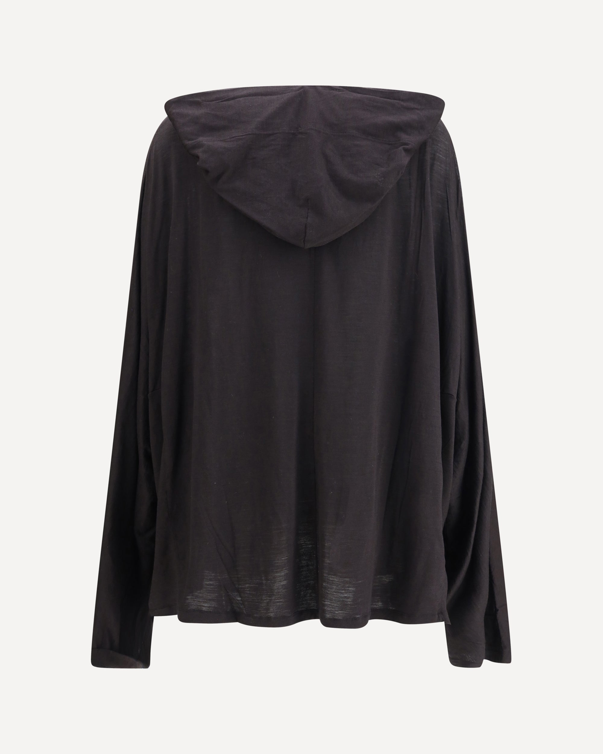 Rick Owens' long hooded T-Shirt expresses the brand's bold, sculptural aesthetic. Featuring a wide, square silhouette, it reaches to the hips and features long sleeves. The wide hood drapes naturally over the front neck, creating a fluid, wrap-around effect. Made of RWS-certified virgin wool, it combines comfort, sustainability and contemporary design.